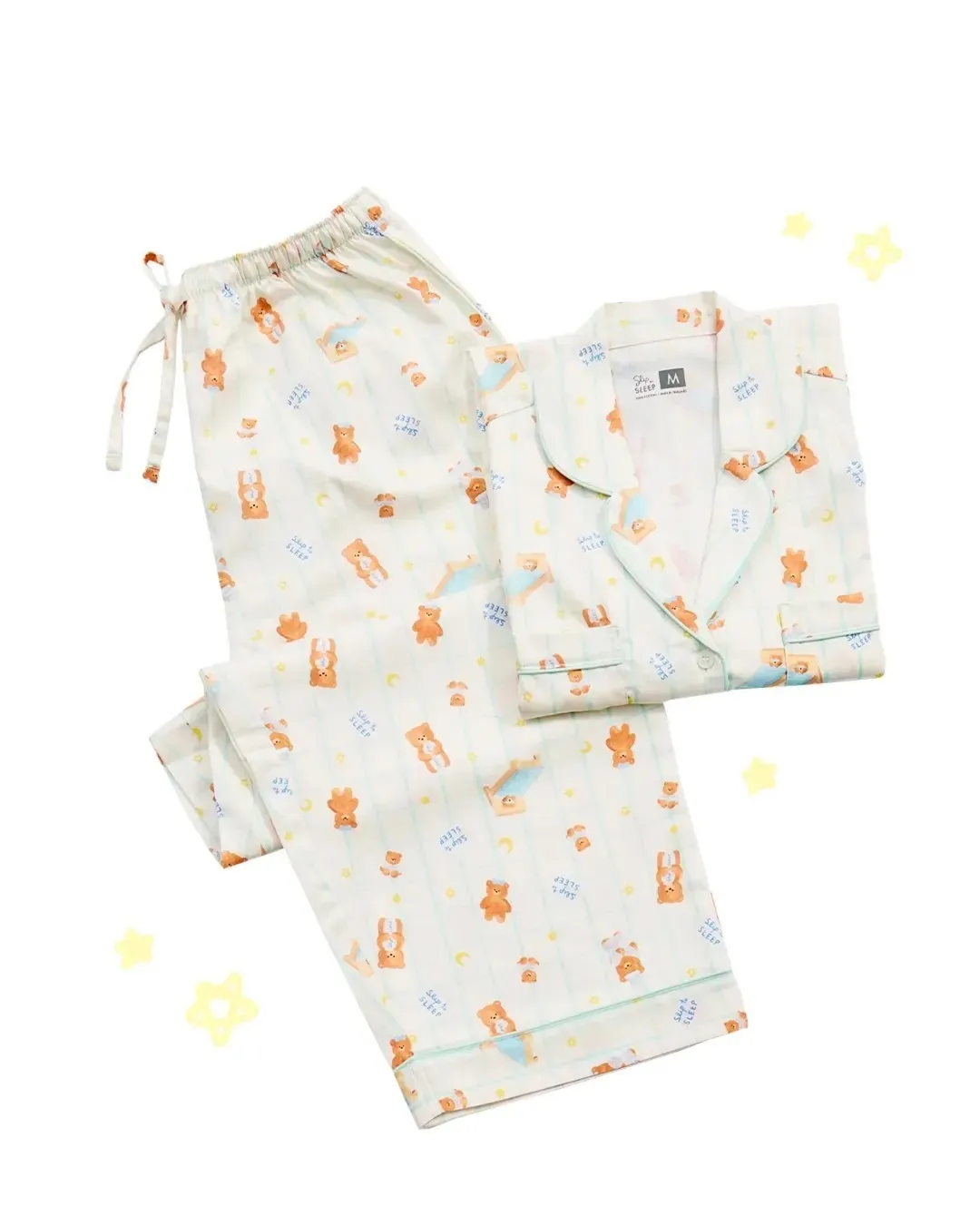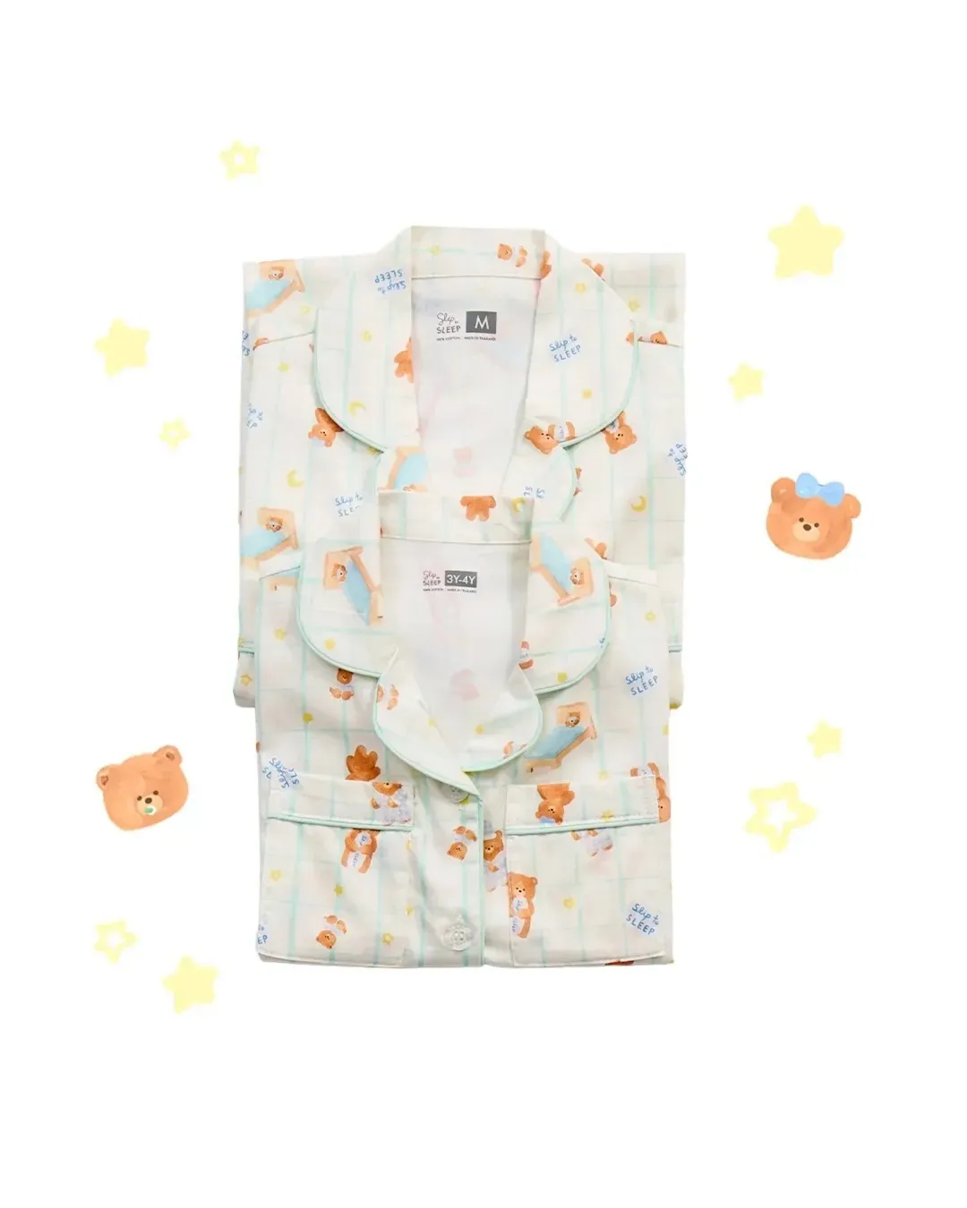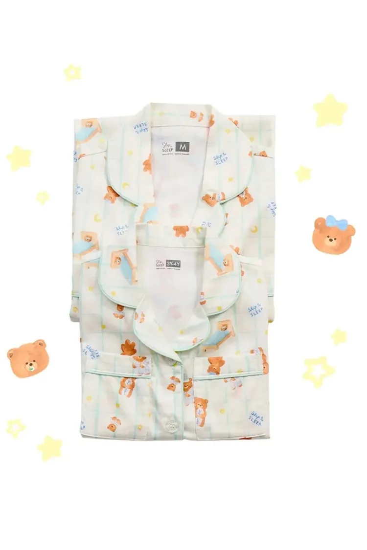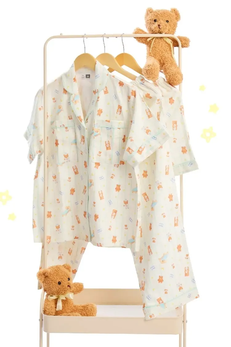 CJ079藍色格紋熊熊夢遊男女同款睡衣套組(短袖長褲)