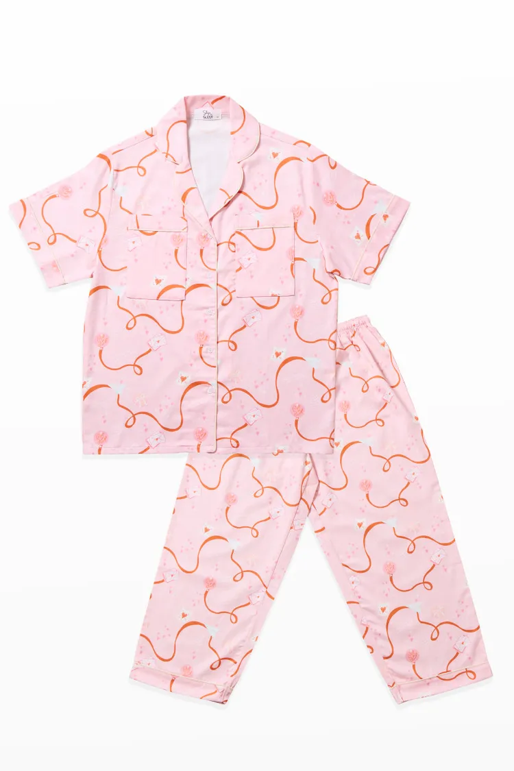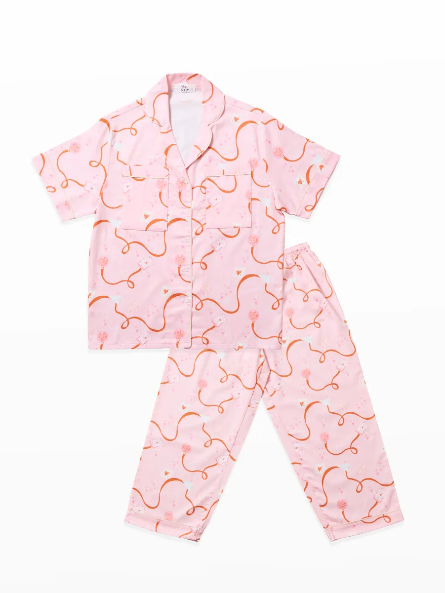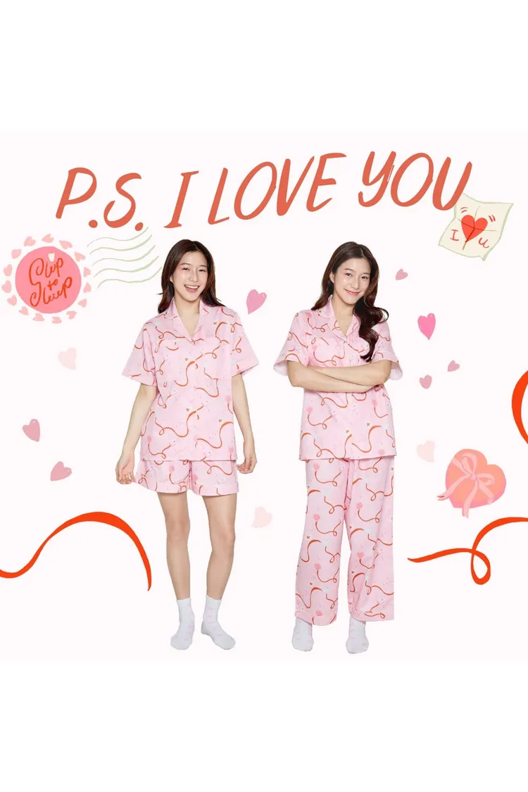 CJ083粉色緞帶情書睡衣套組(短袖長褲)