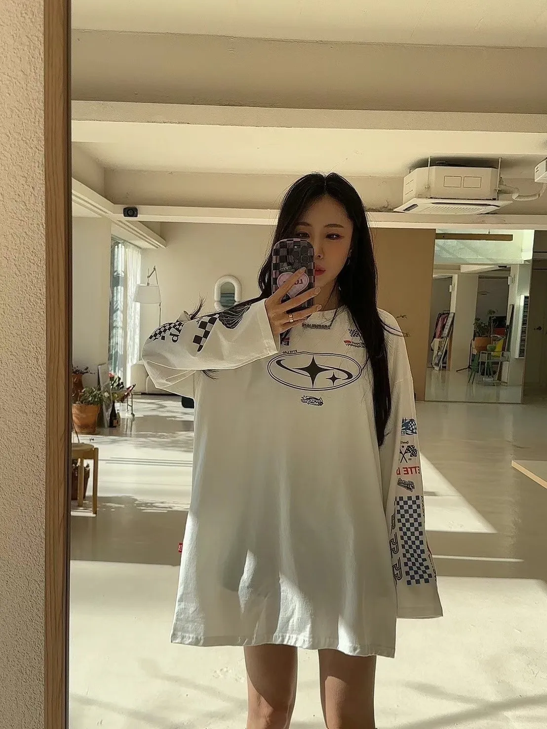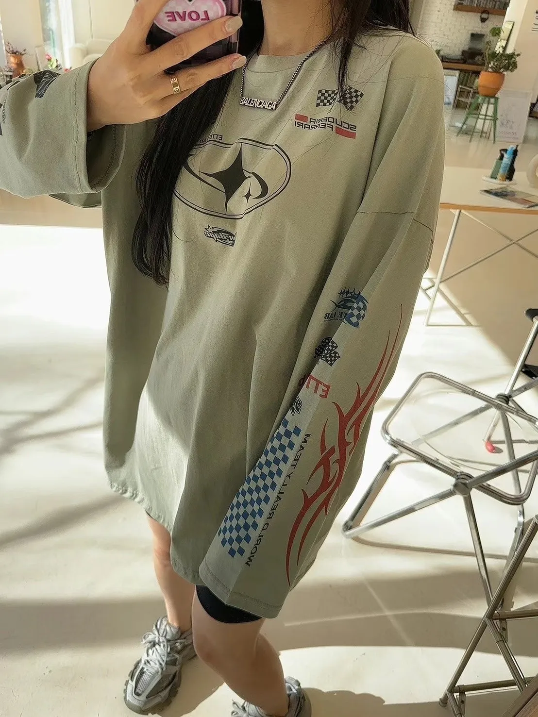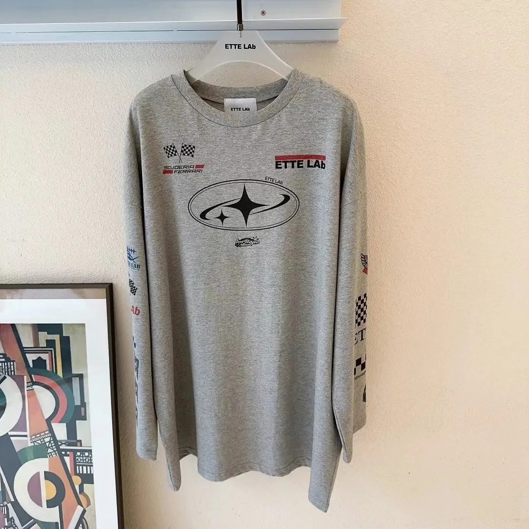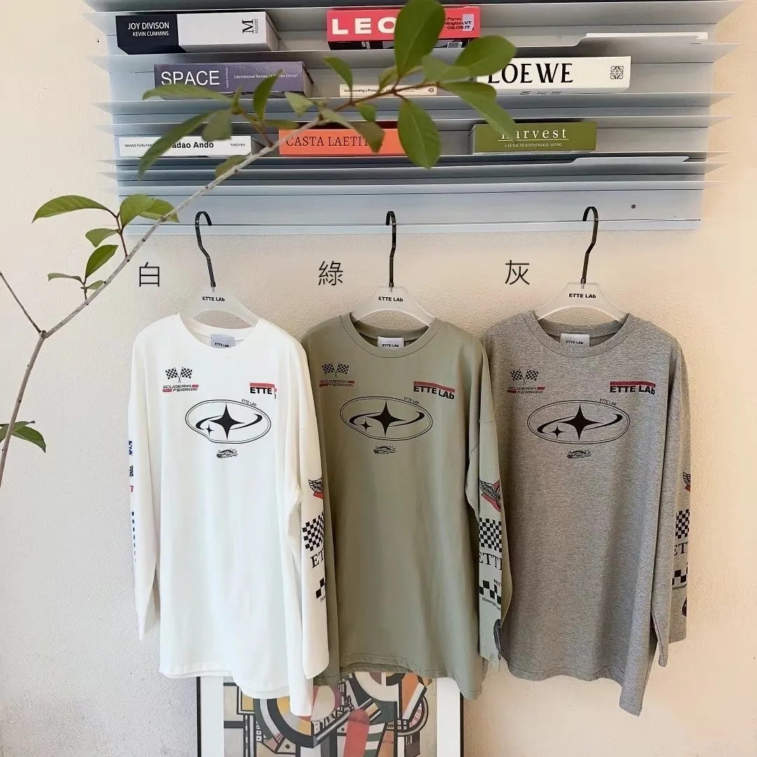 CM021星星賽車格落肩長袖大學T 白 綠 灰 官網價$990 線上價$960