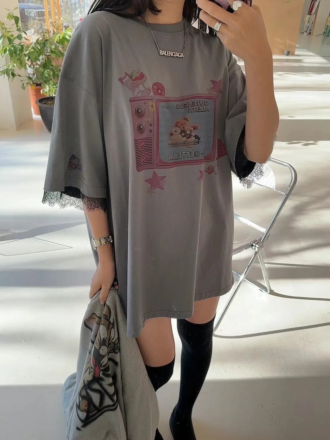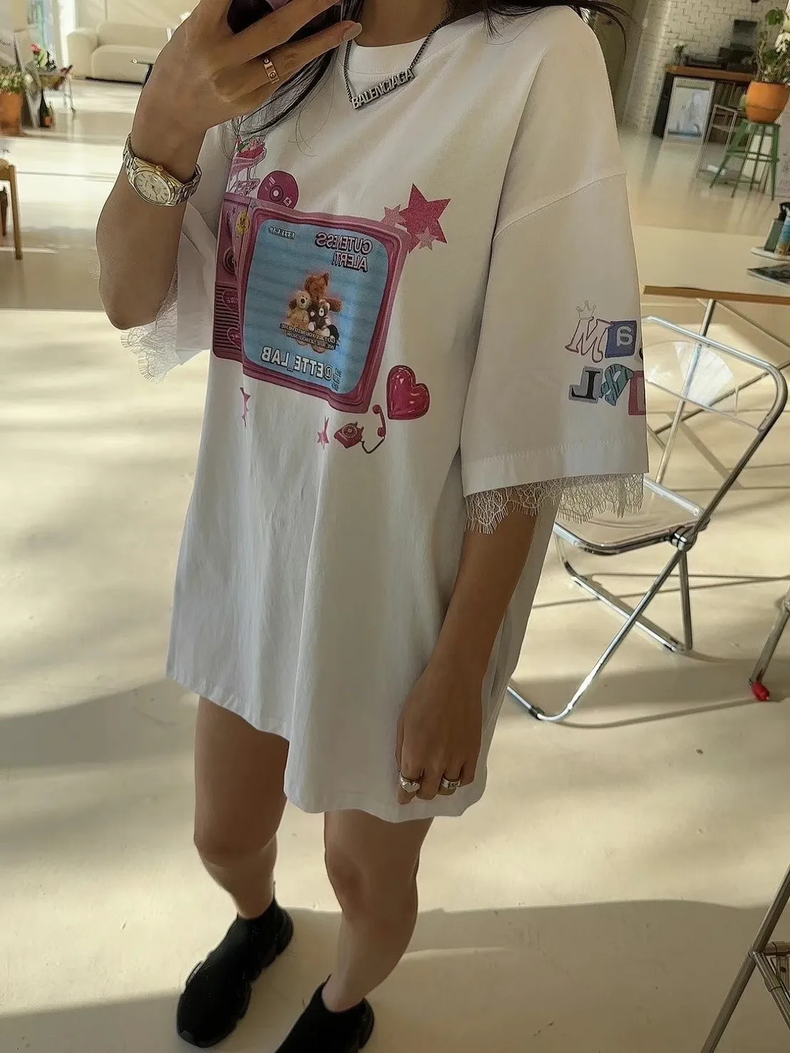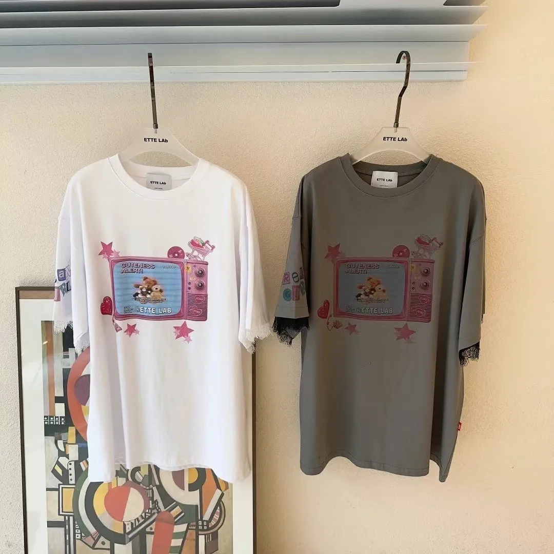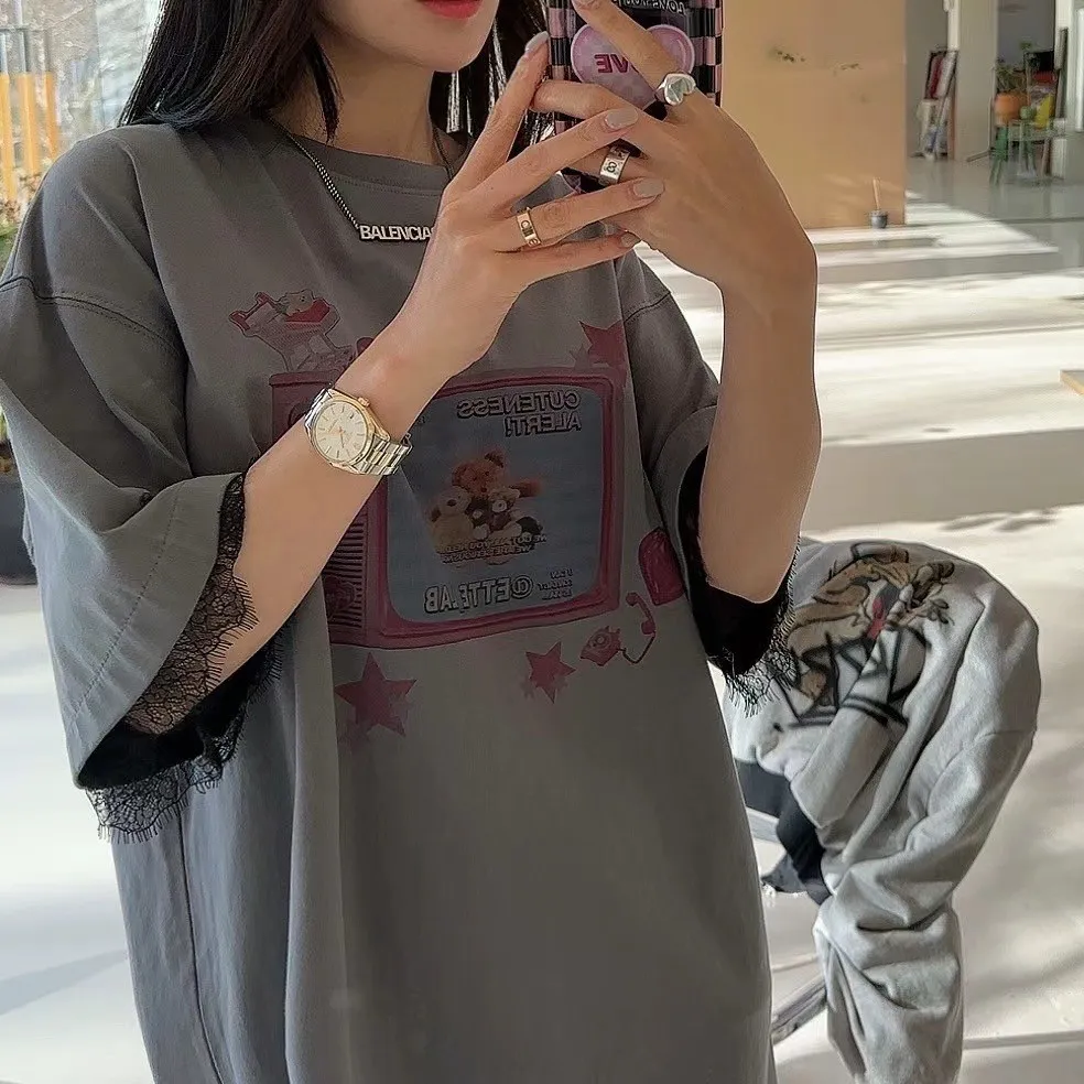 棉 薄款舒適 手袖拼接蕾睫毛蕾絲 落肩款 oversize