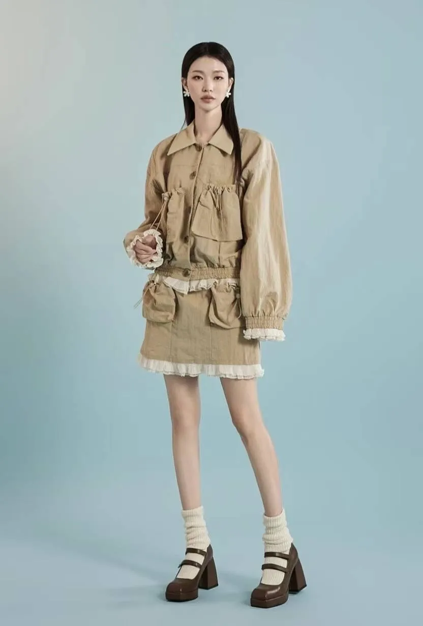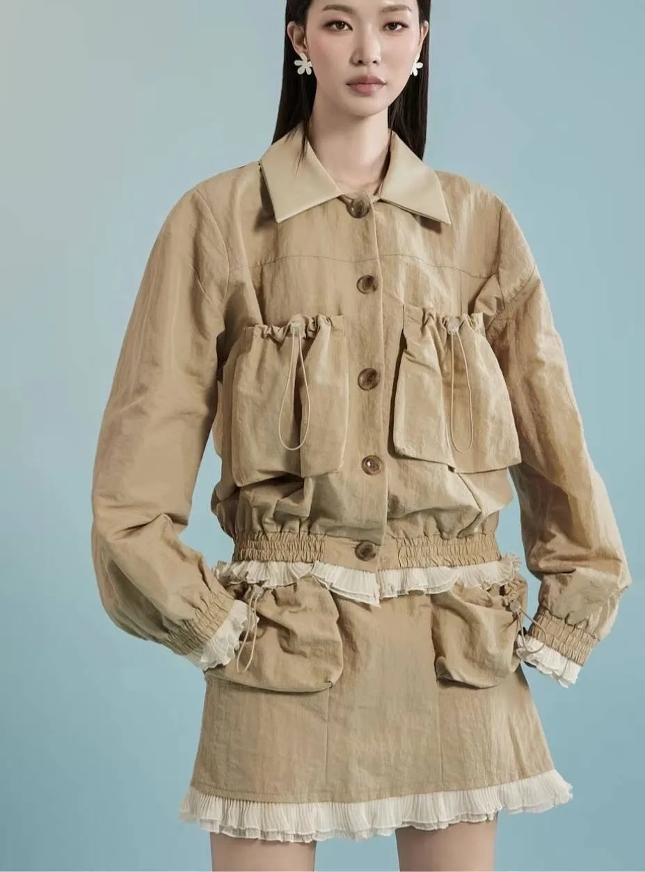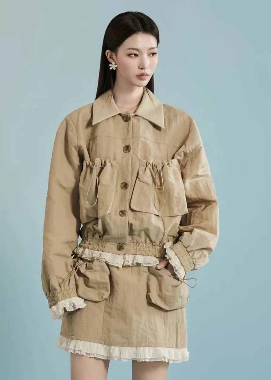 雪紡+聚酯+皮革領 釦子穿脫 雙口袋 有內裡 秋天面料 手袖下擺雪紡