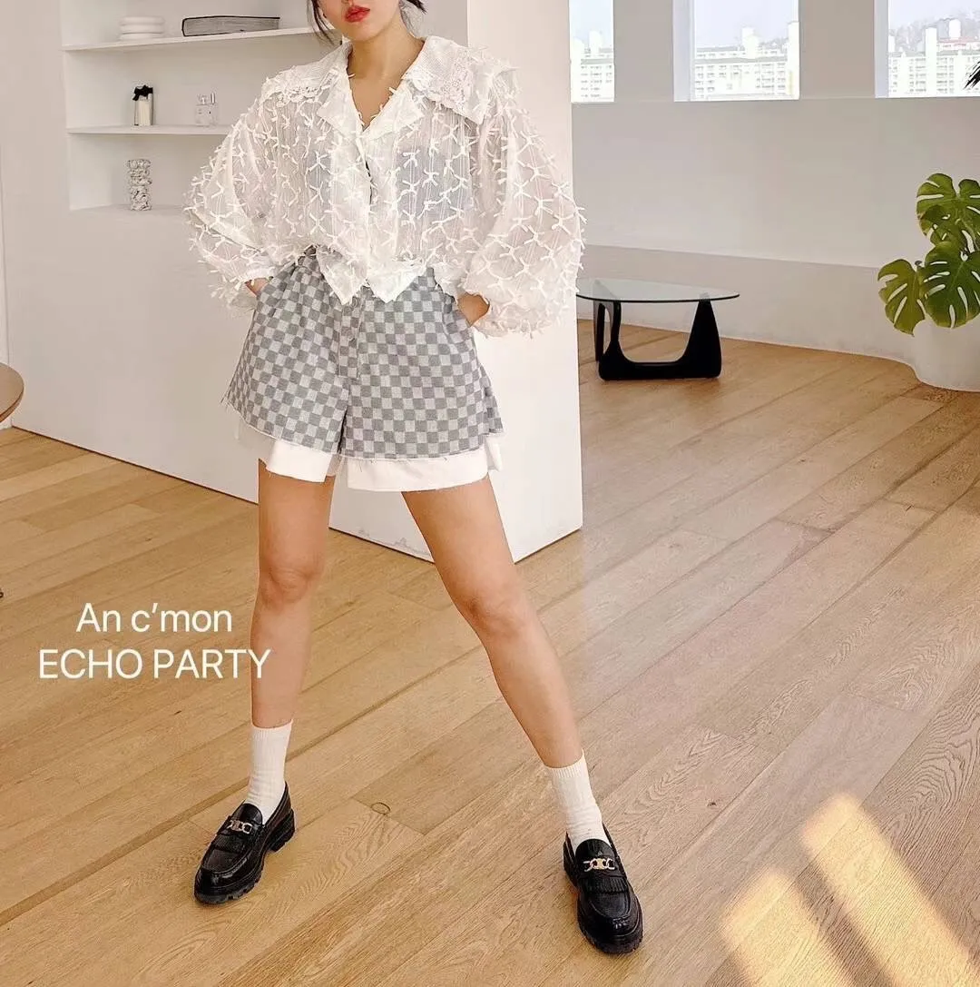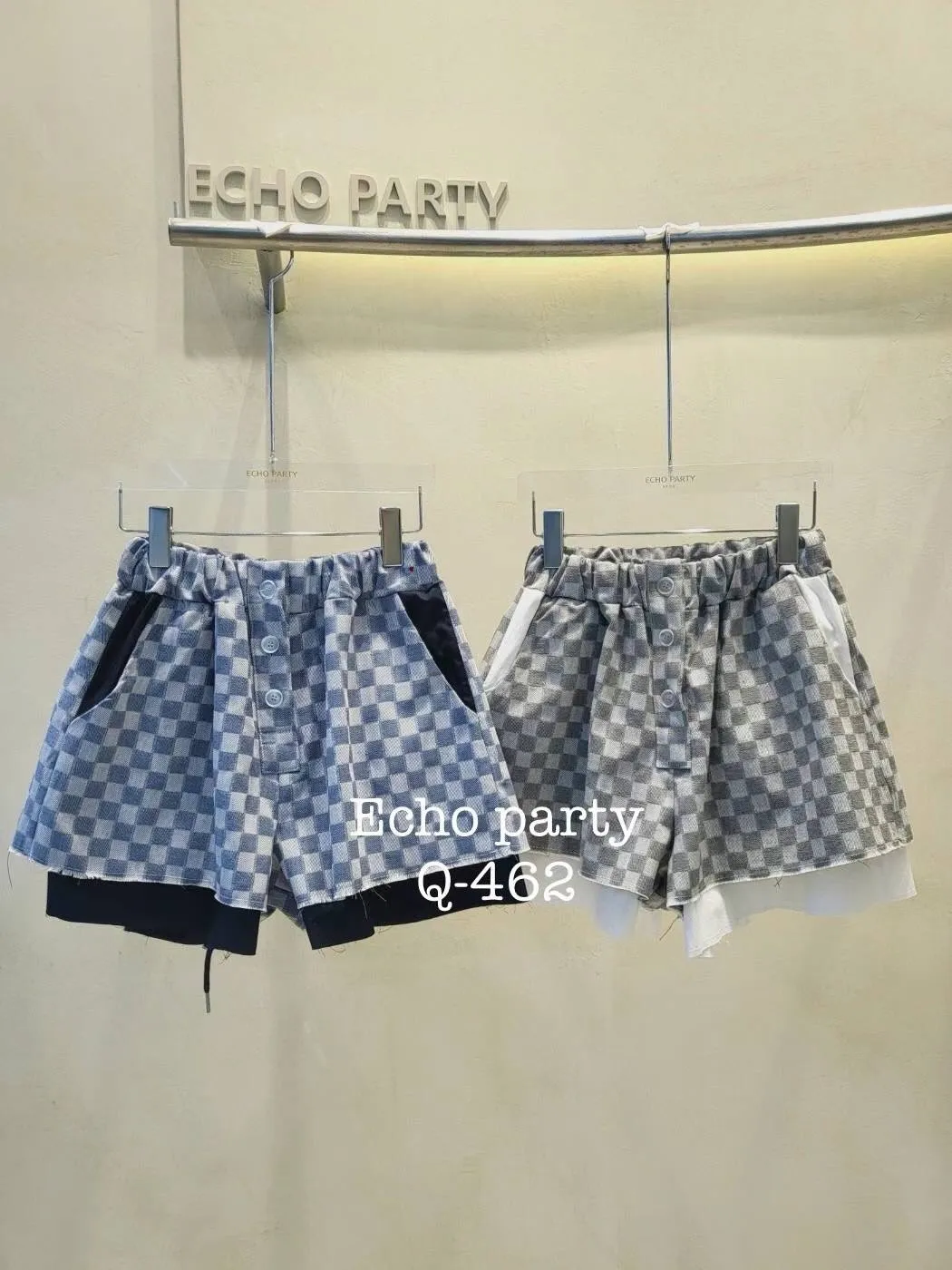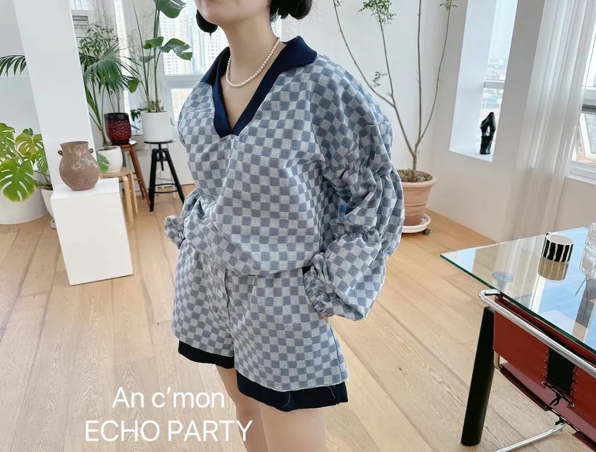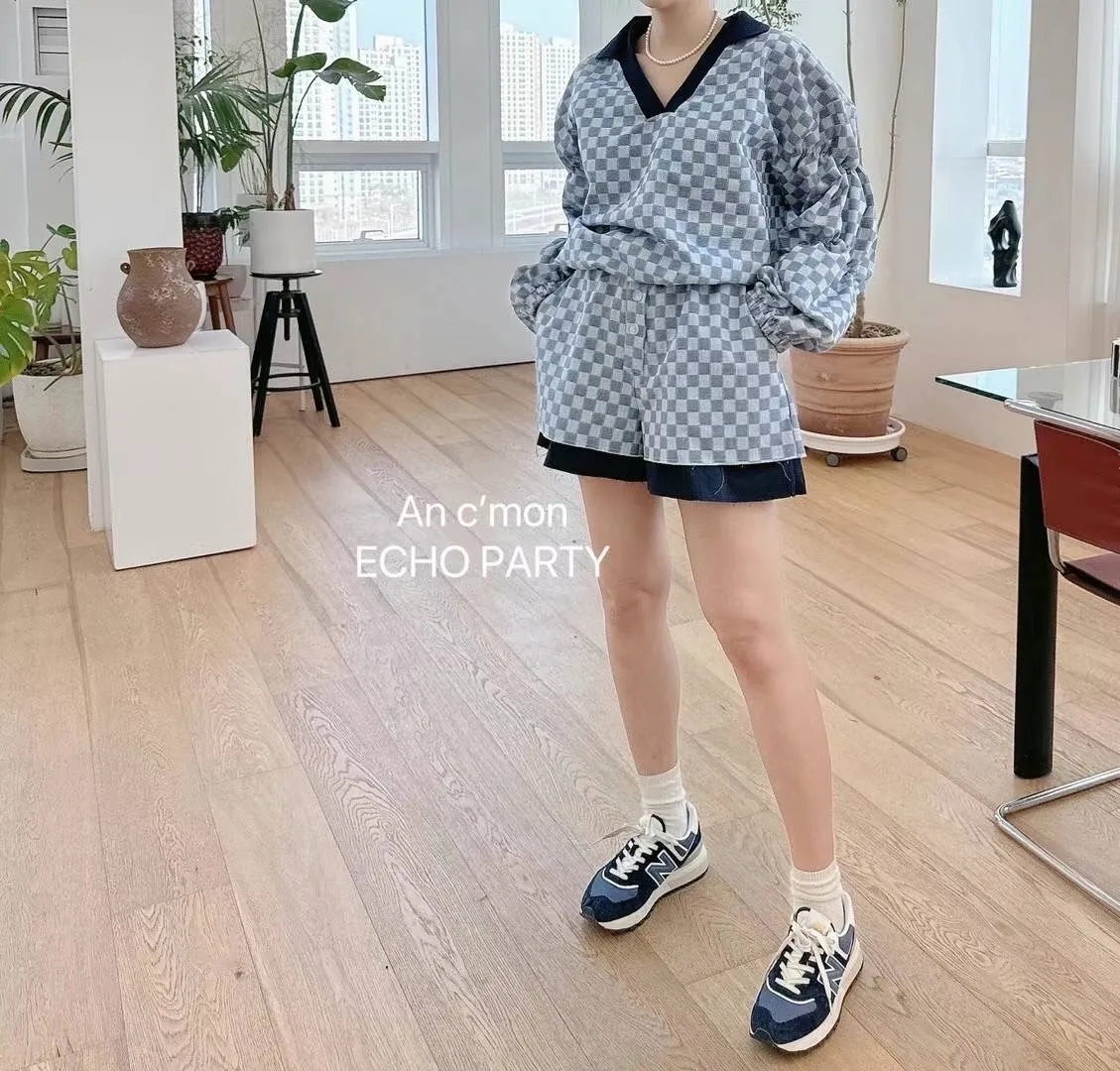CM069套裝的棋盤格雙層短褲 灰 藍 官網價$1120 線上價$1090