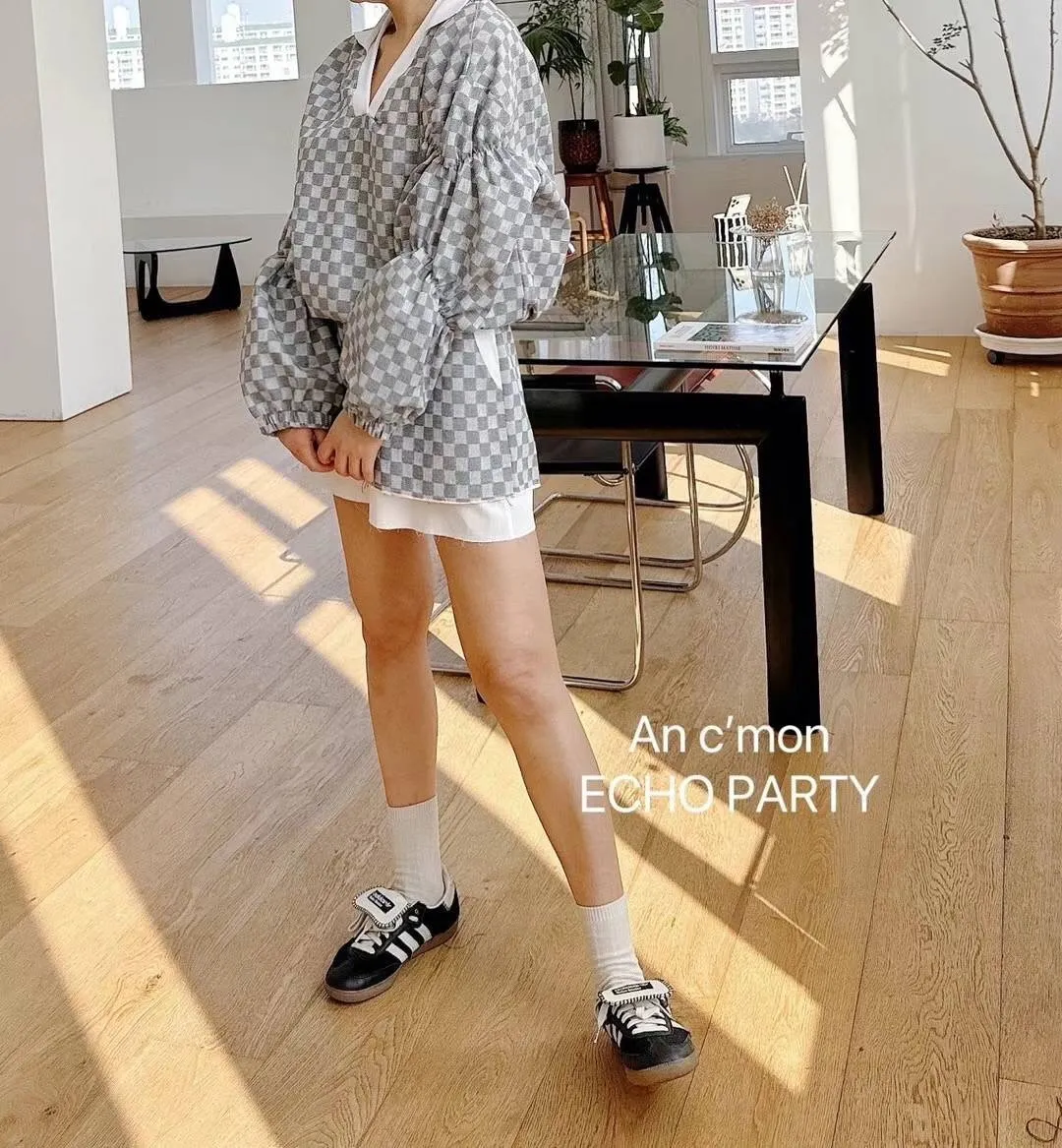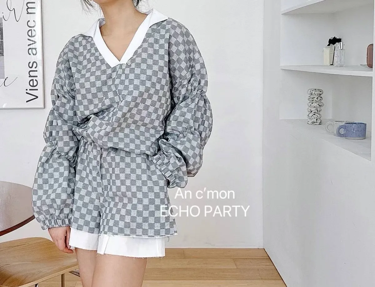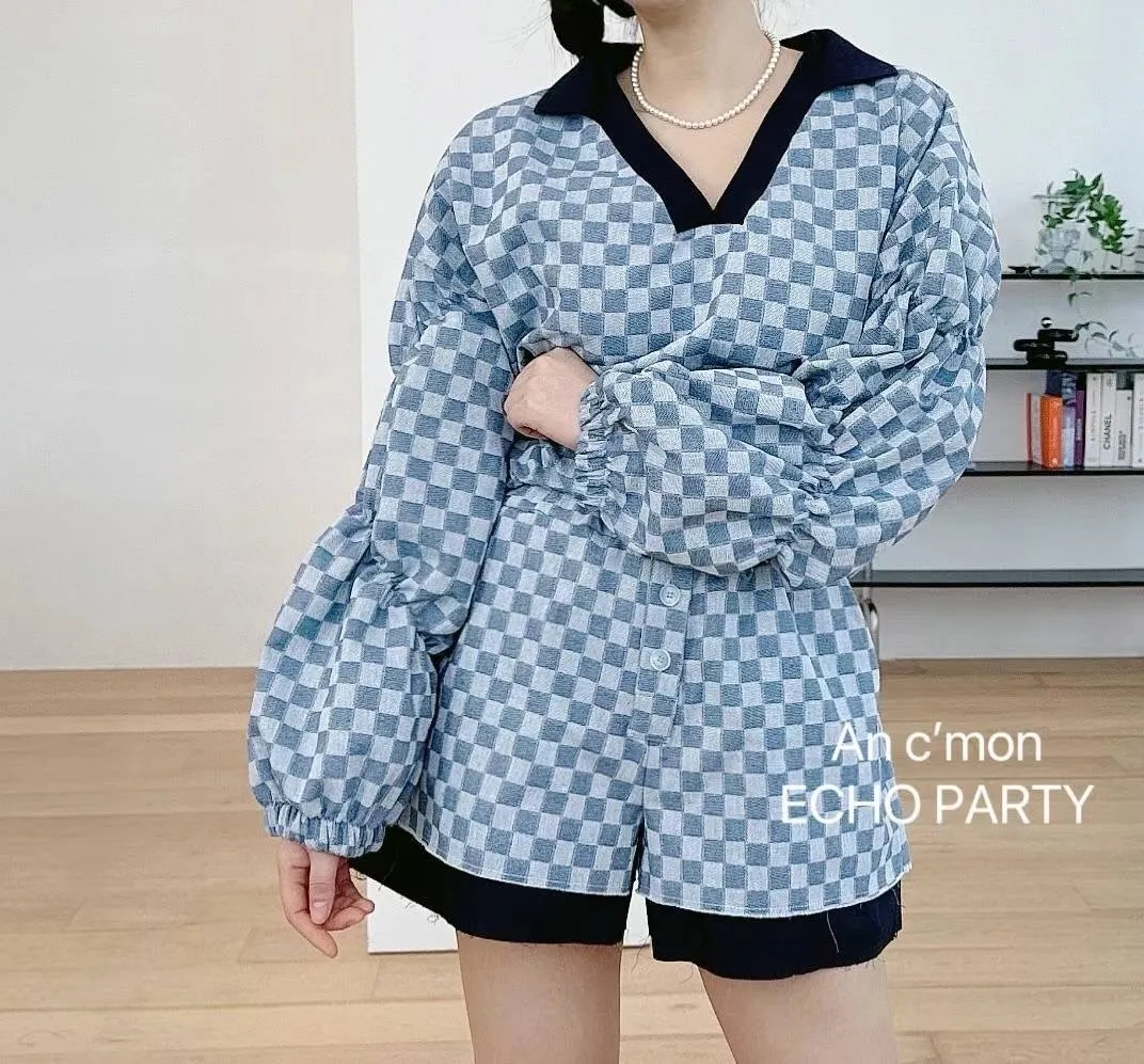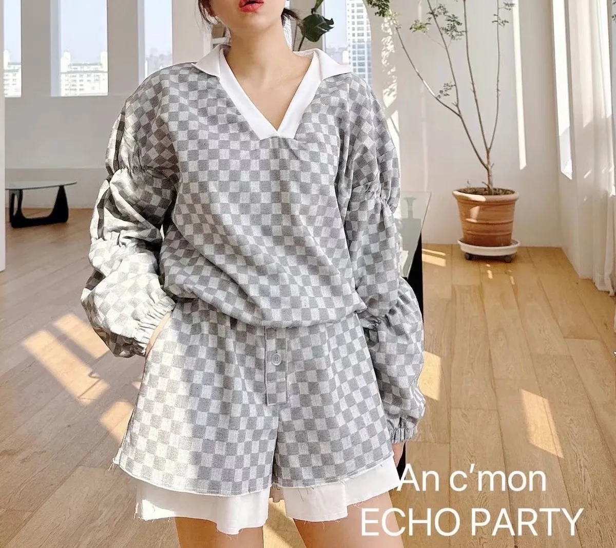 CM069套裝的棋盤格雙層短褲 灰 藍 官網價$1120 線上價$1090