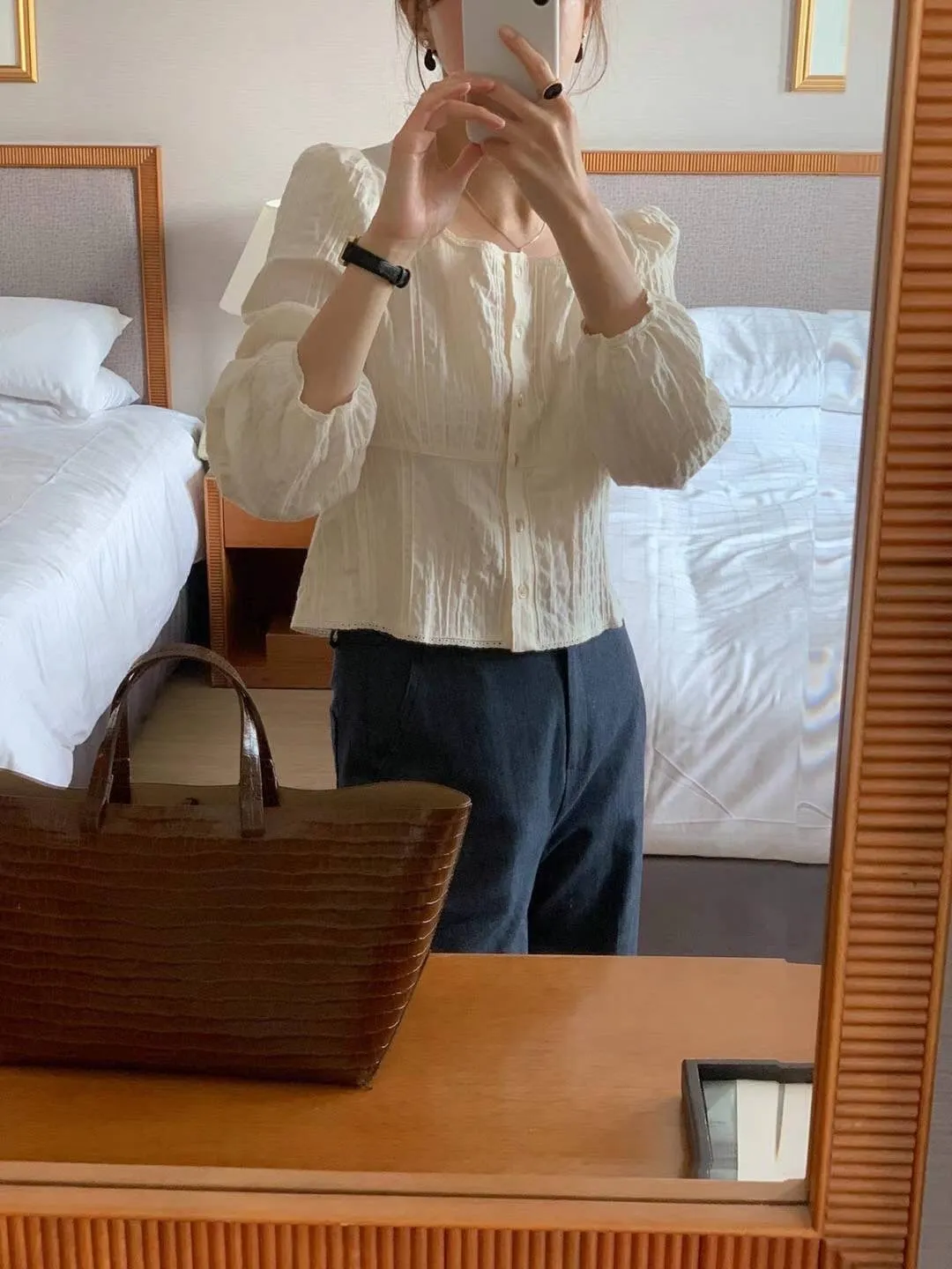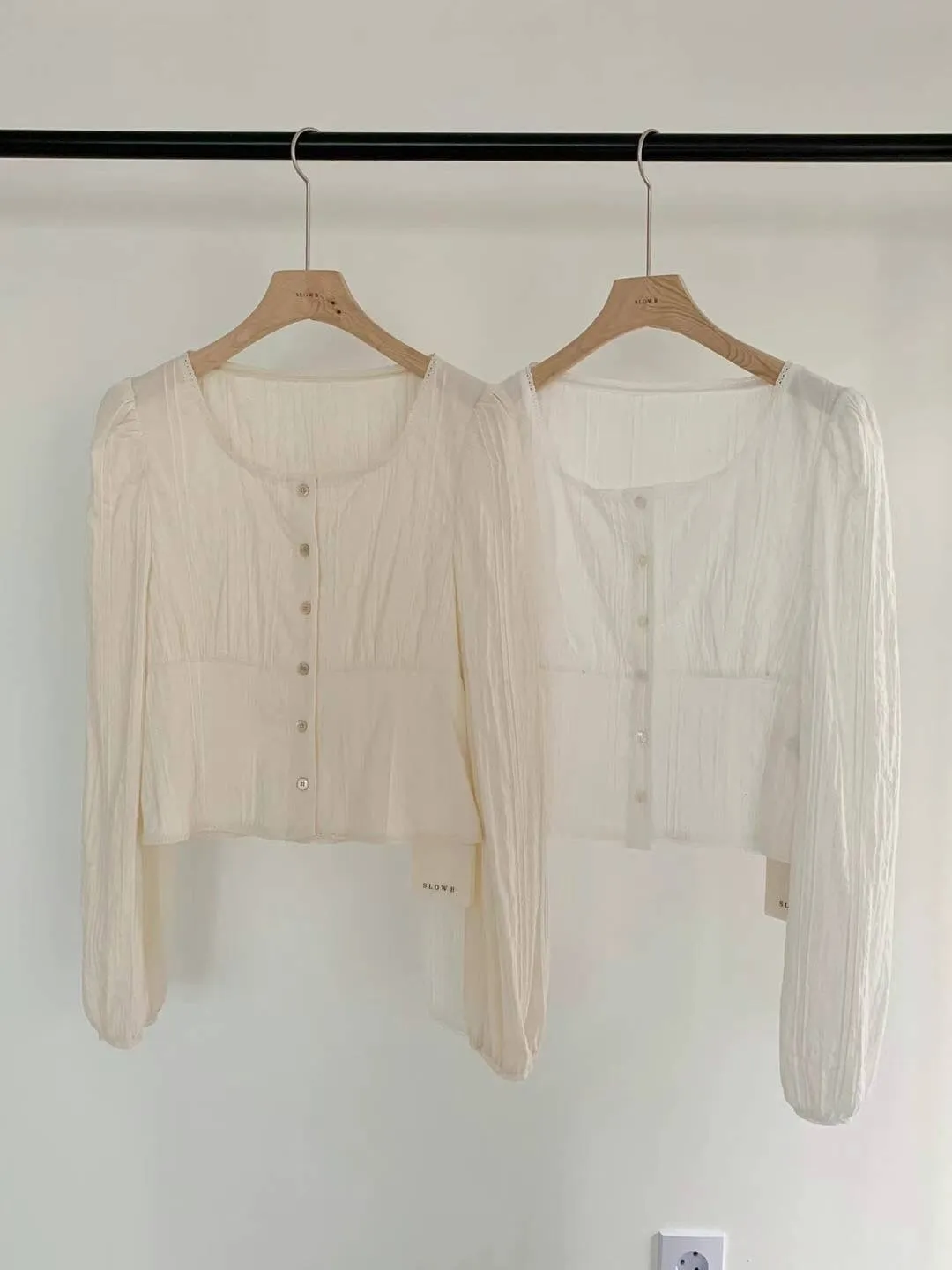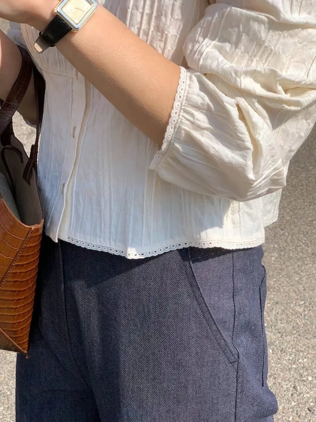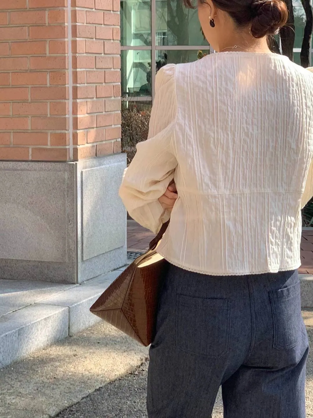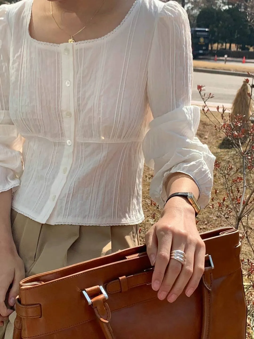 CM1008方領精緻排釦蕾絲滾邊上衣 白 米 官網價$1190 線上價$1160