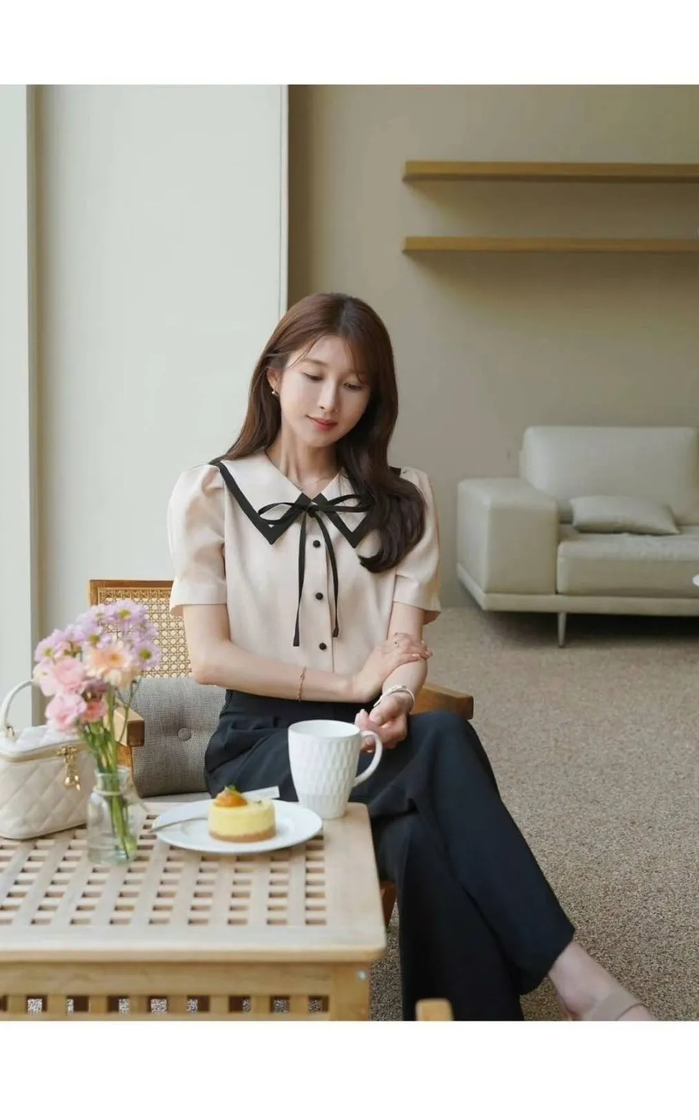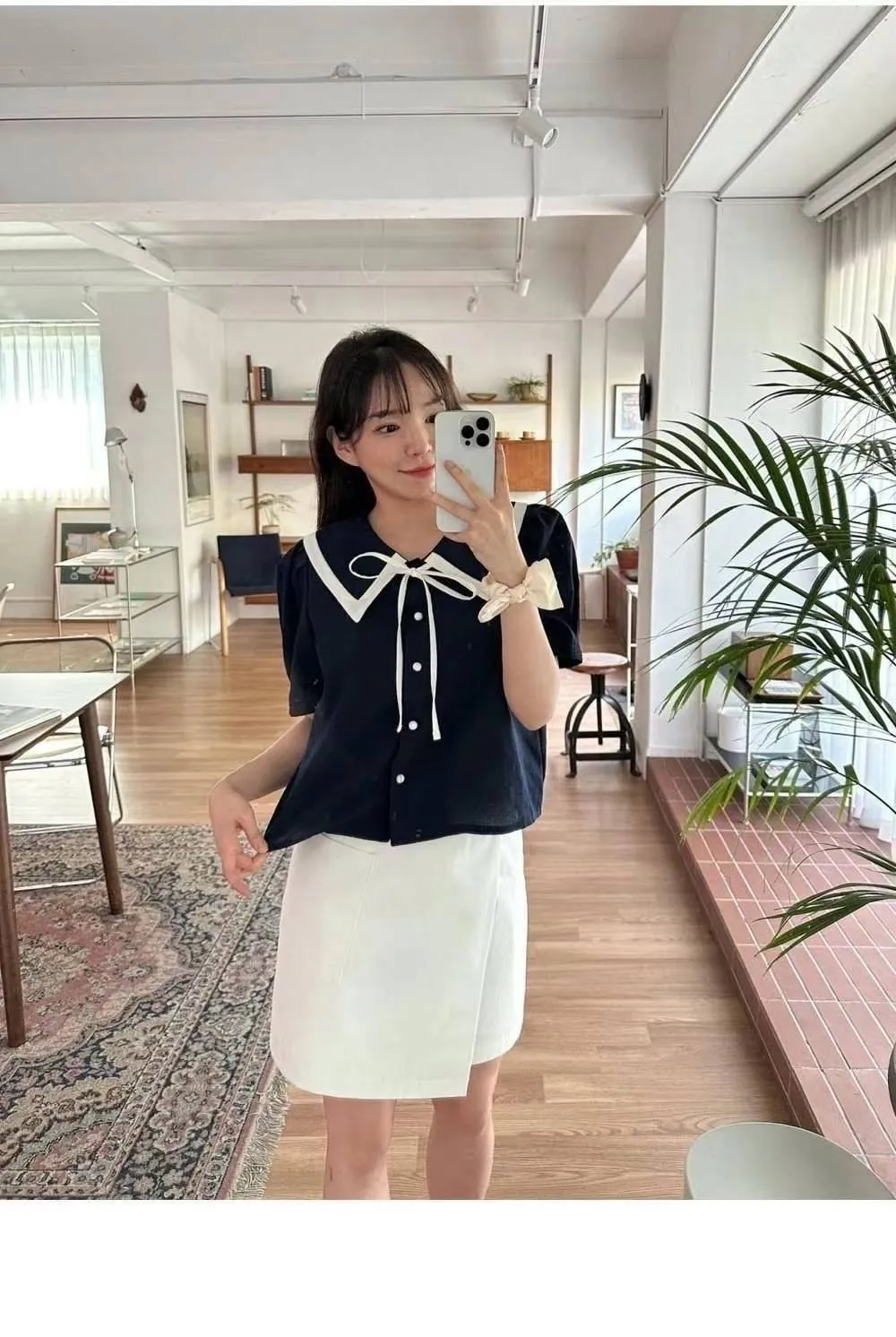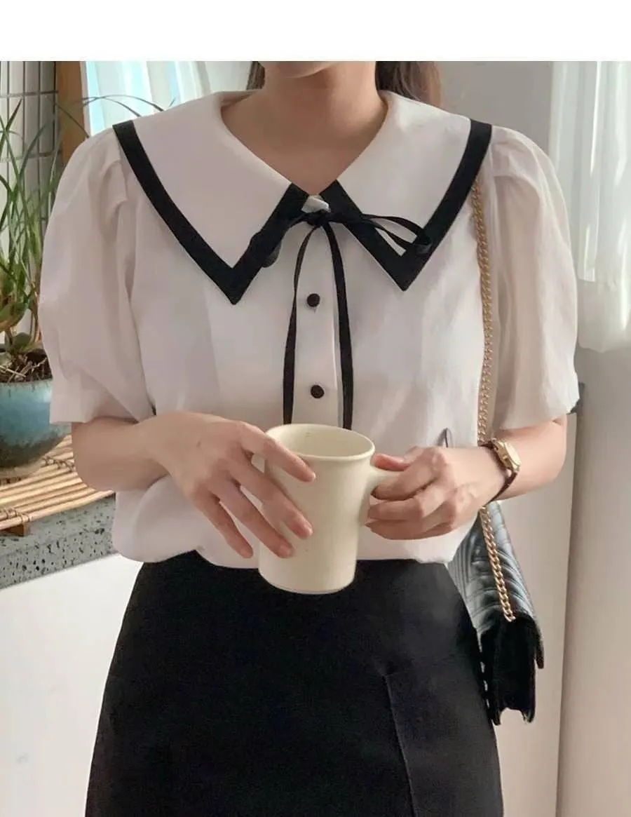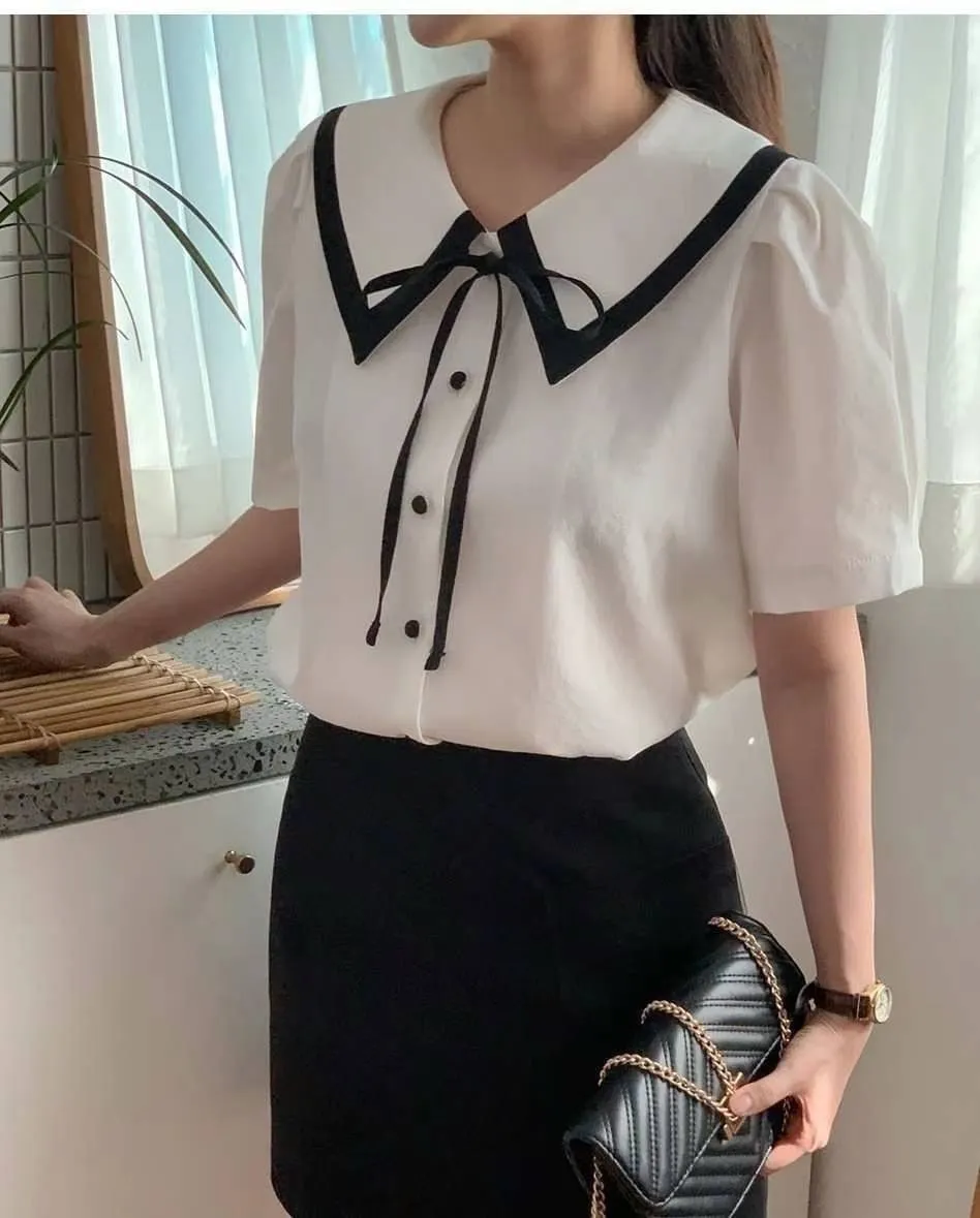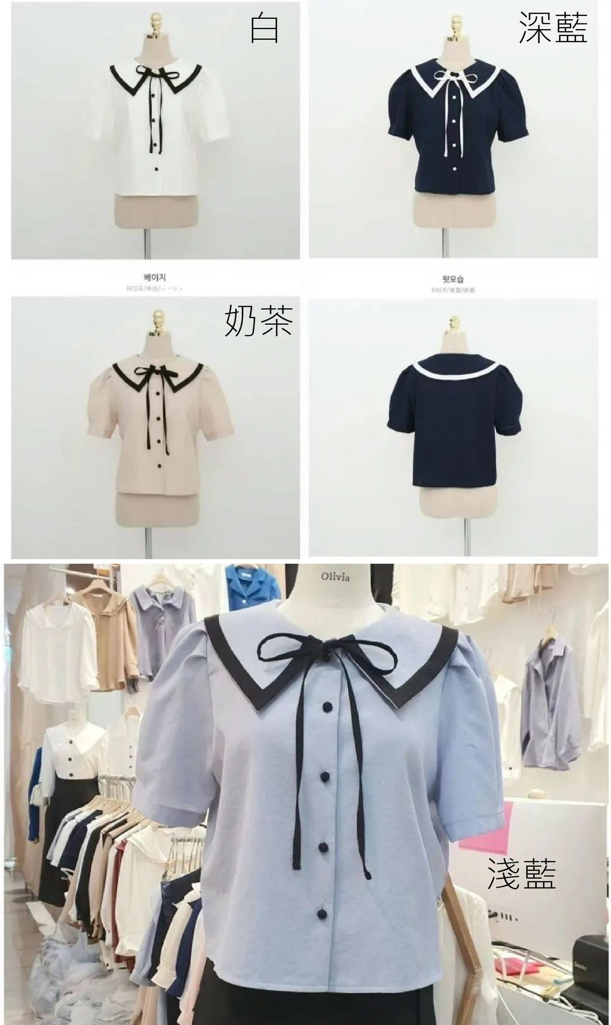 CM1099氣質跳色滾邊領胸綁帶上衣 白 淺藍 深藍 奶茶 官網價$650 線上價$620