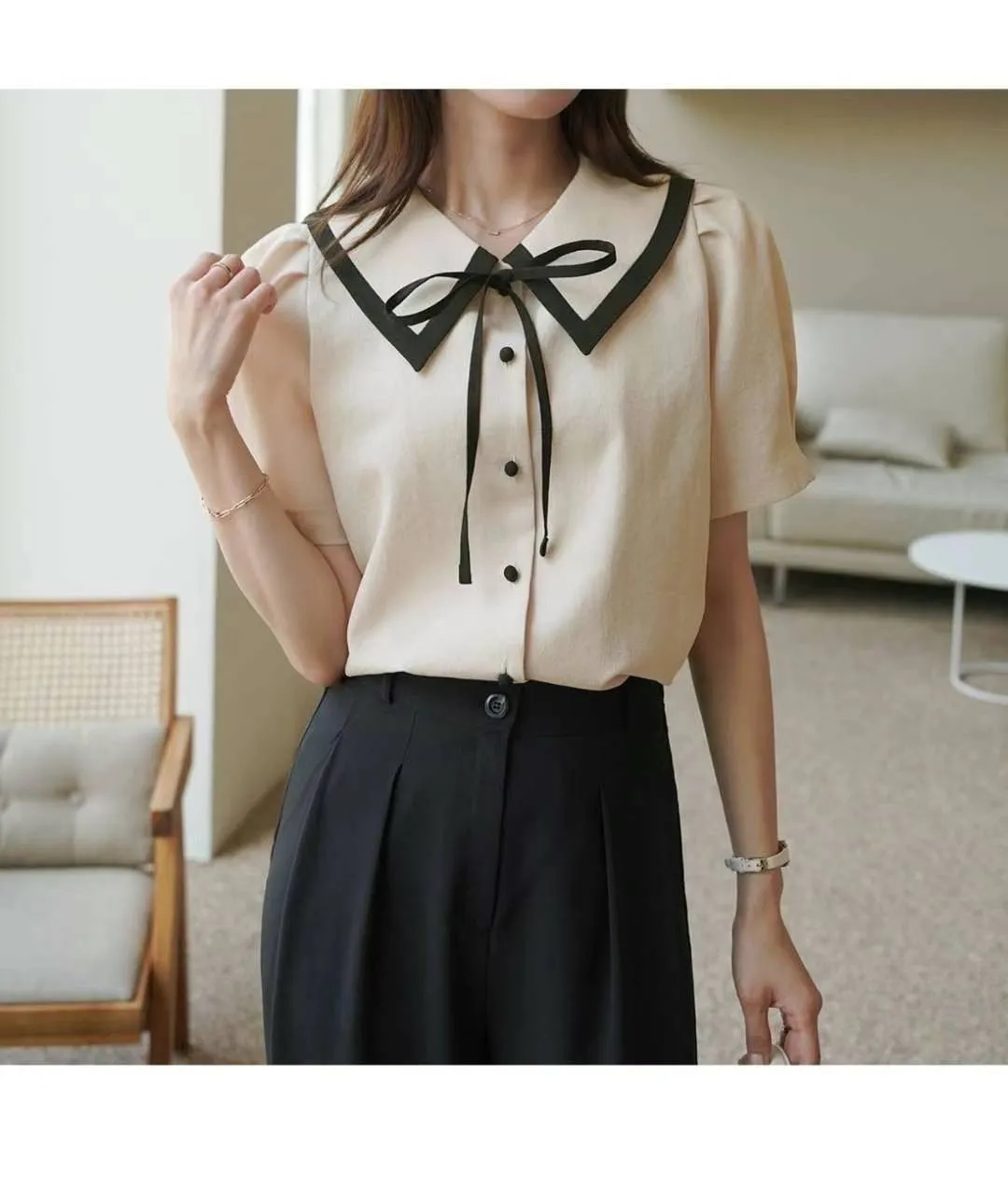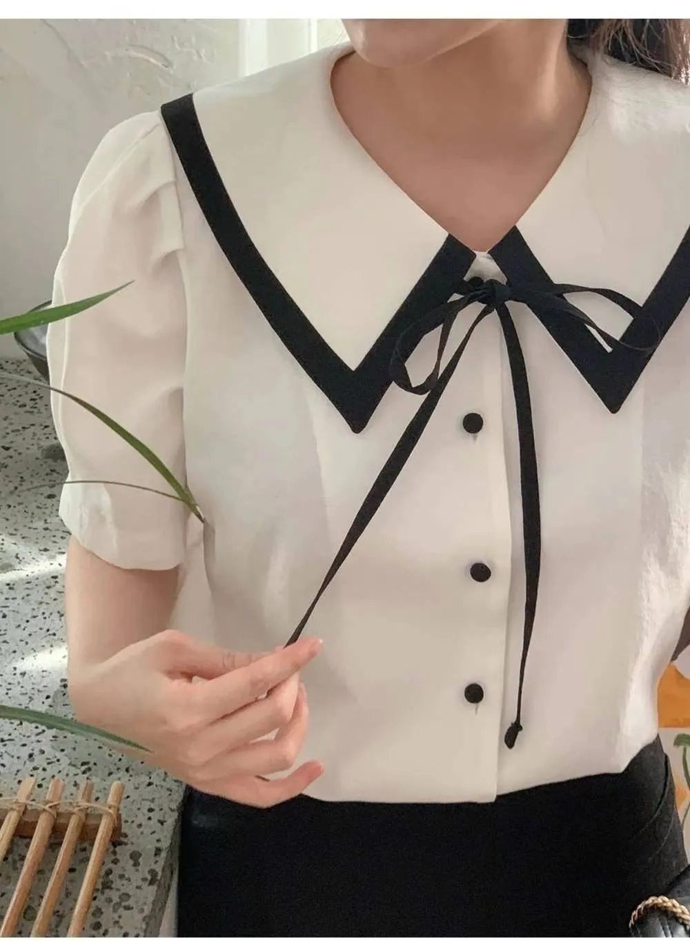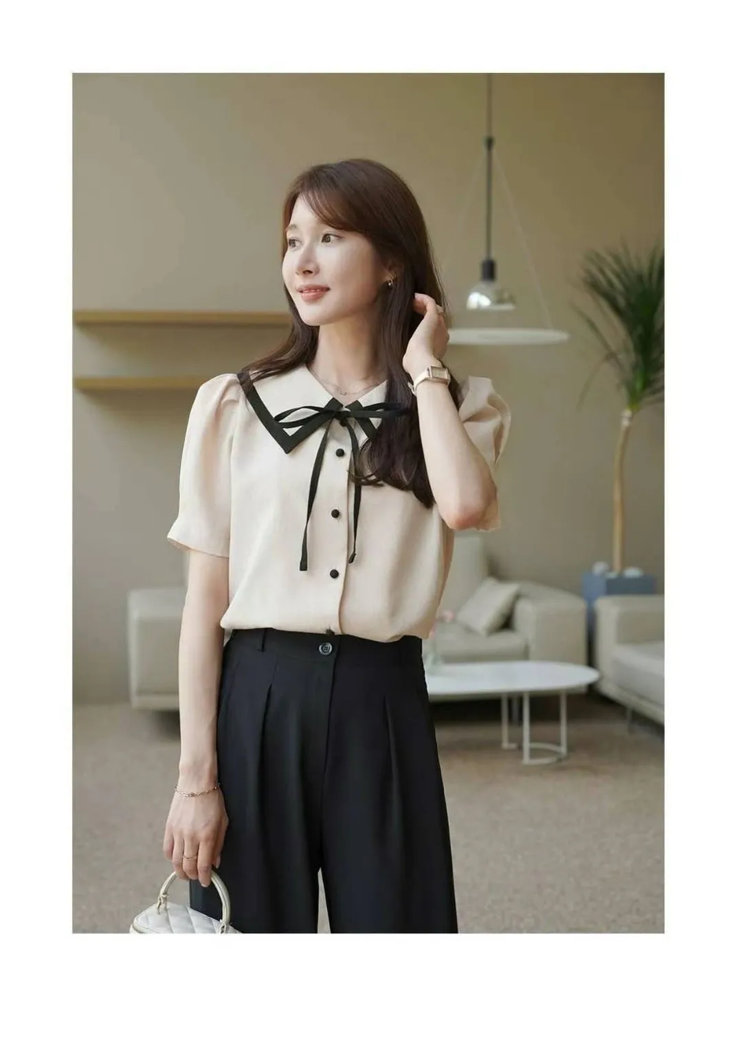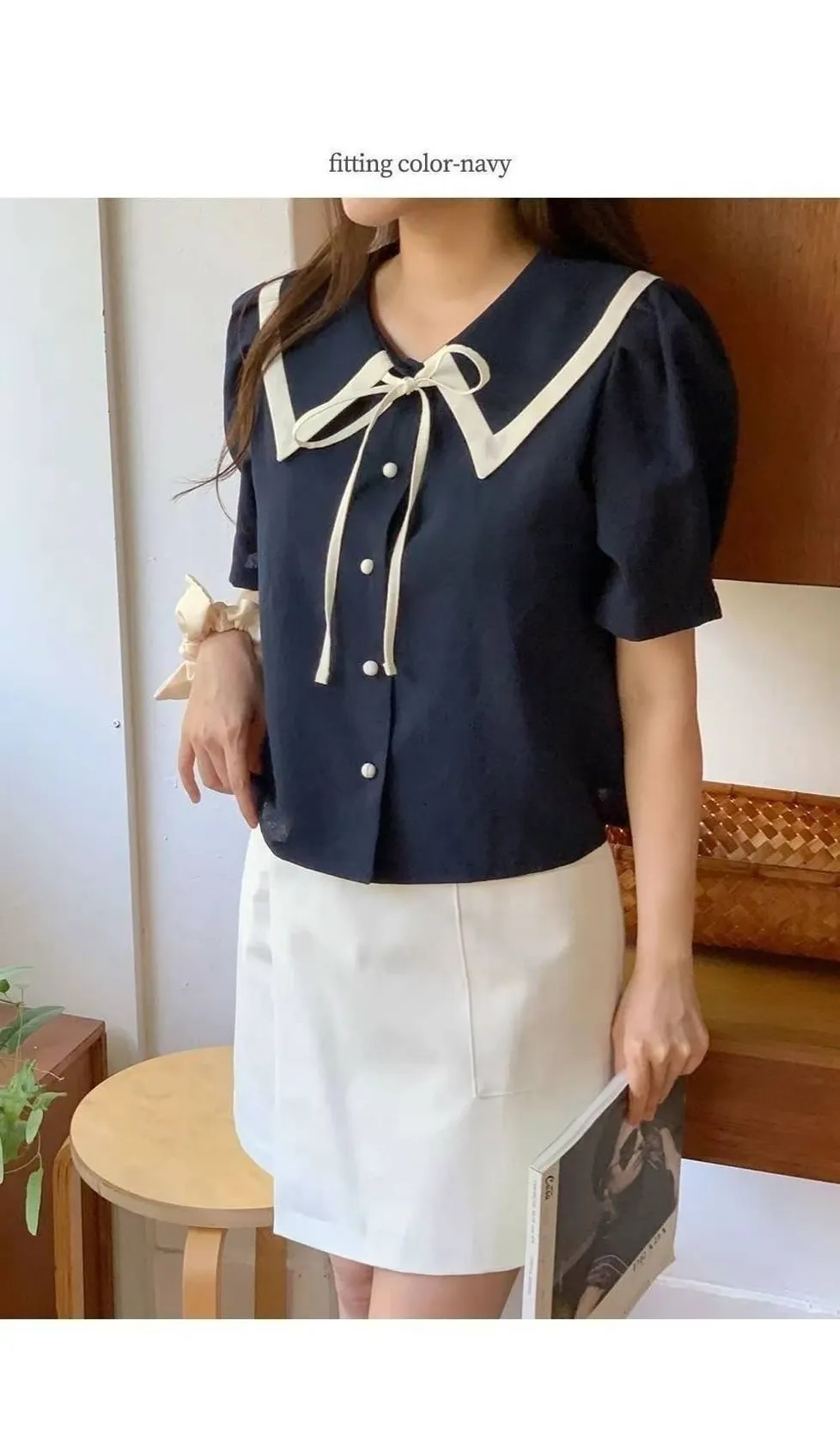 CM1099氣質跳色滾邊領胸綁帶上衣 白 淺藍 深藍 奶茶 官網價$650 線上價$620