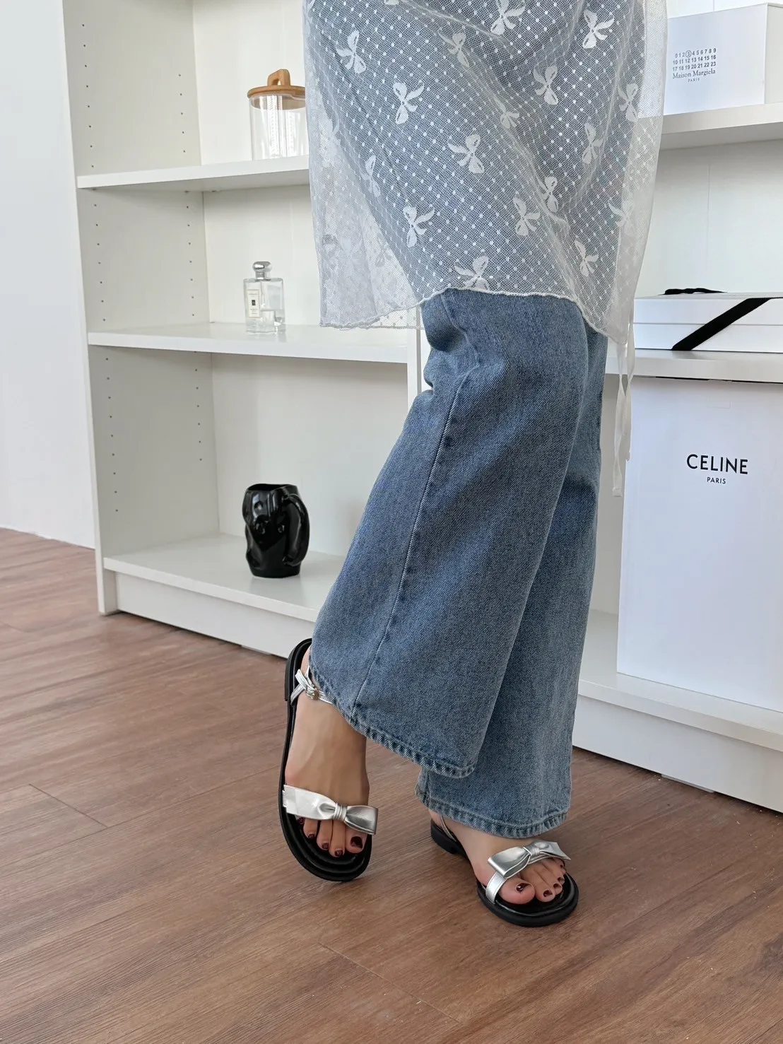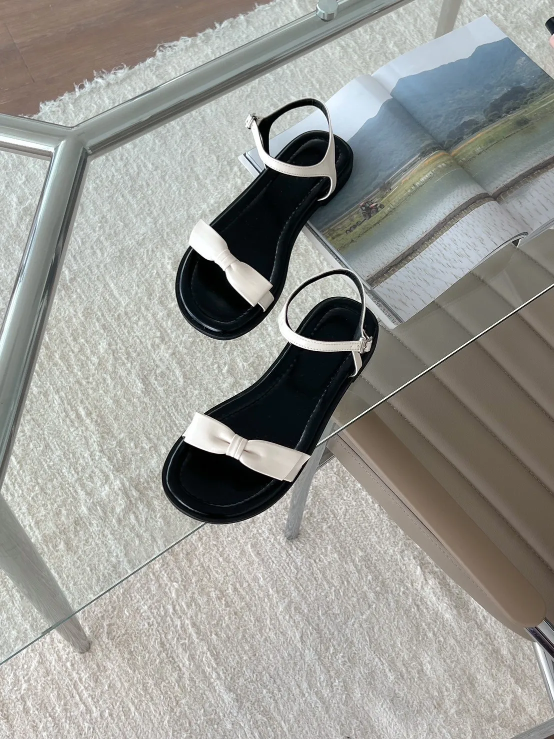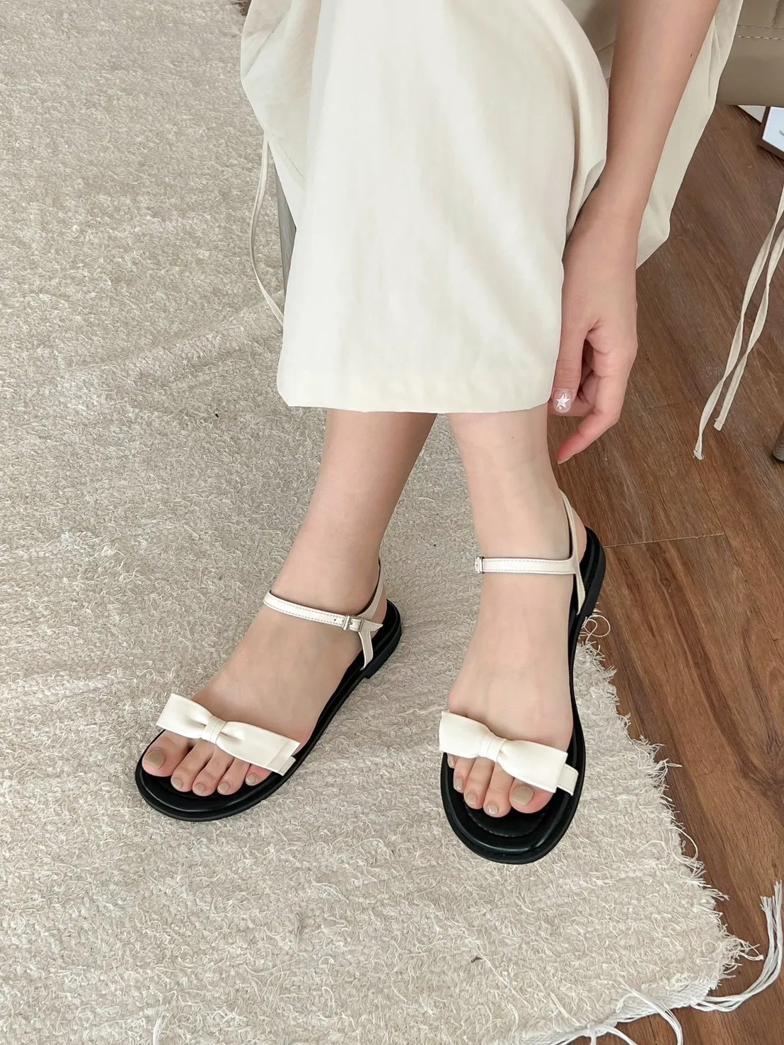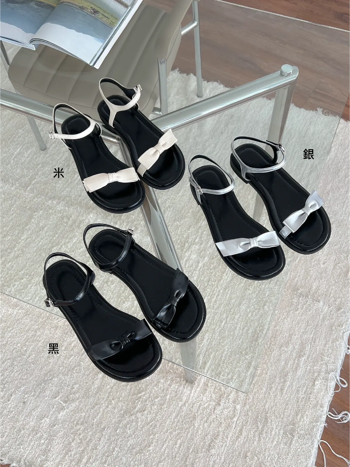 CM194側釦光澤感蝴蝶結涼鞋 米 銀 黑 225-250(有半號) $899