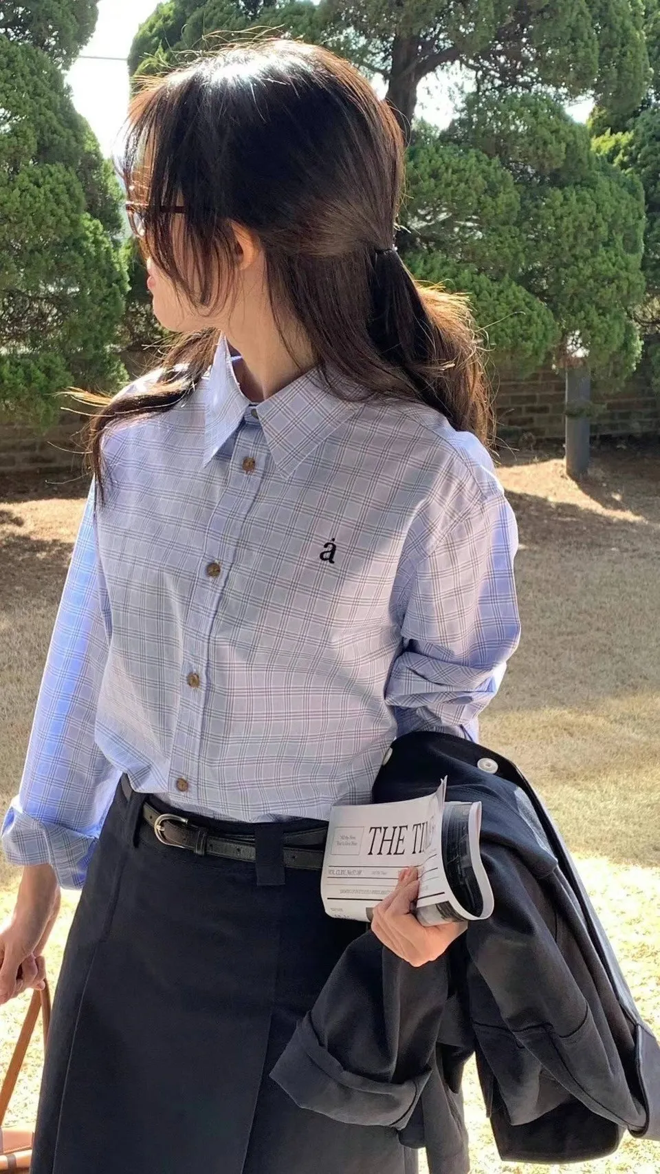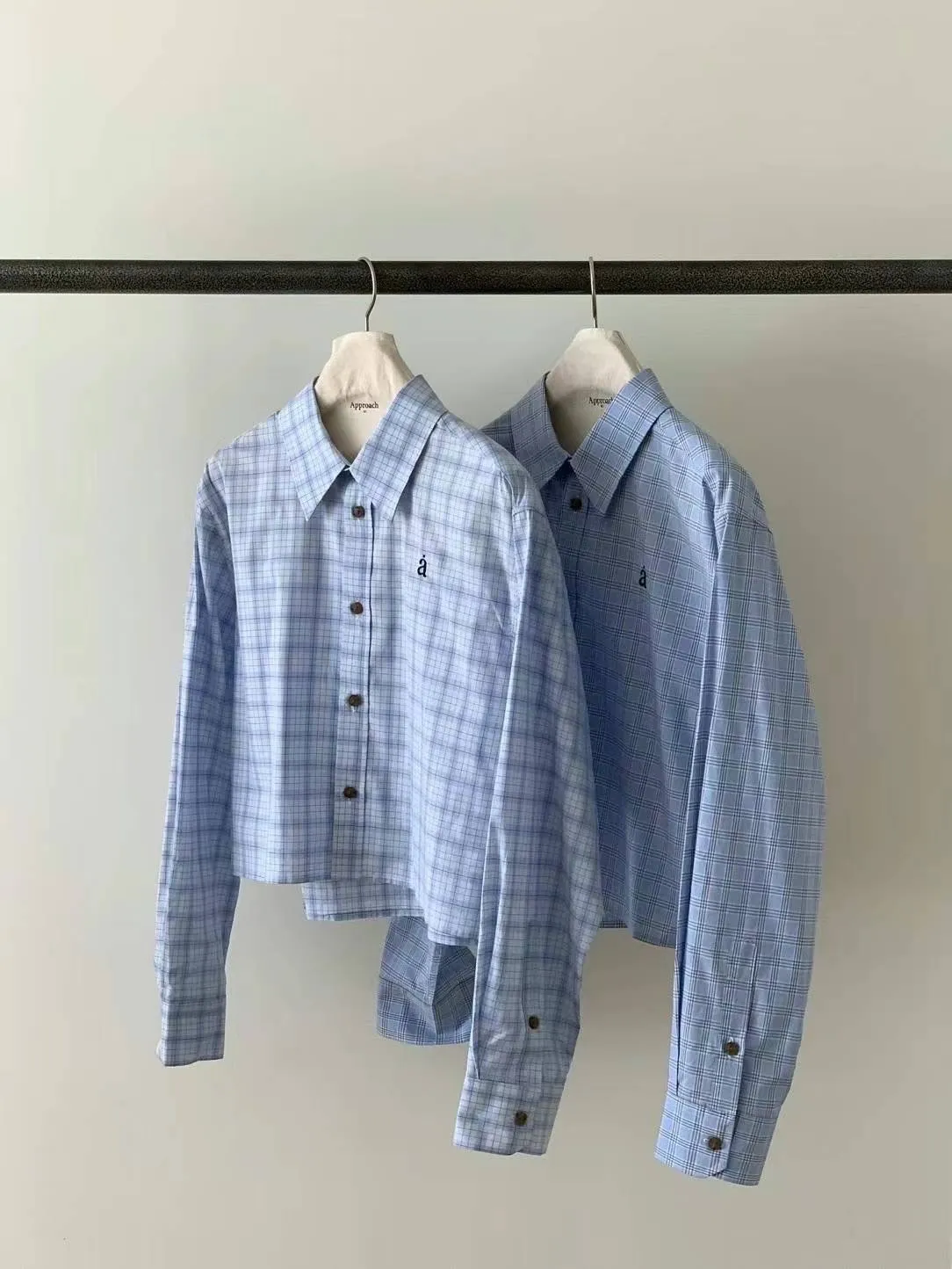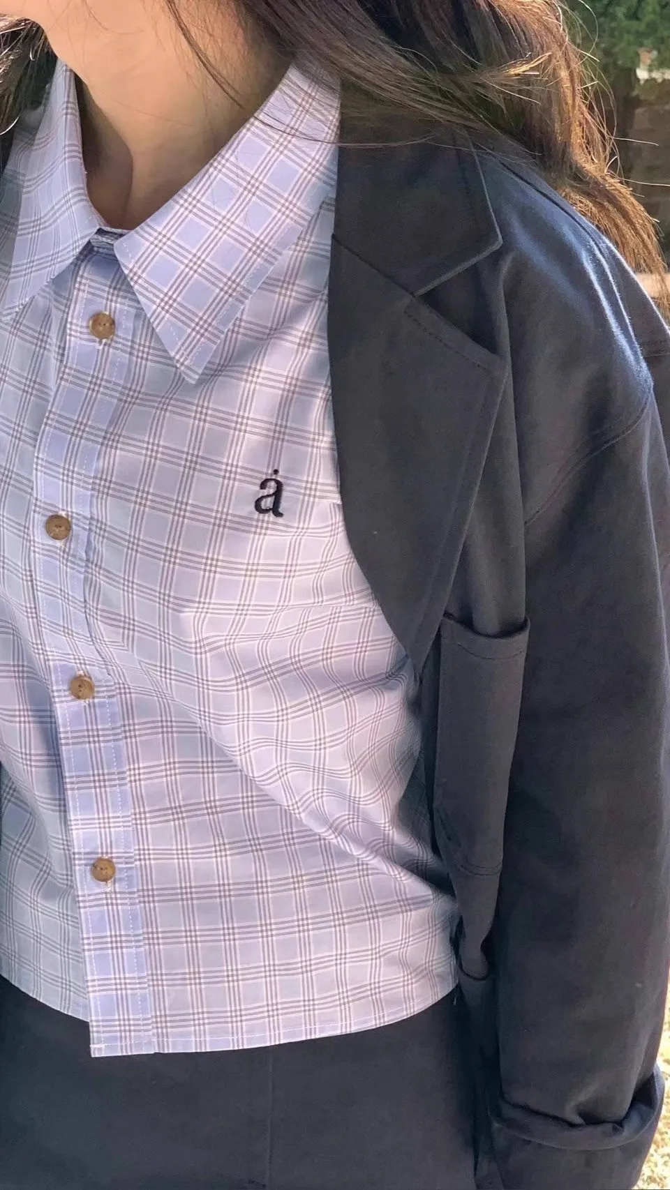 棉,質感滑面料 順身好比例 品牌感佳 不易皺 宋宋出場穿藍格 可當罩衫