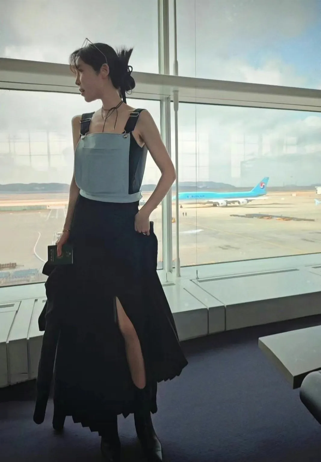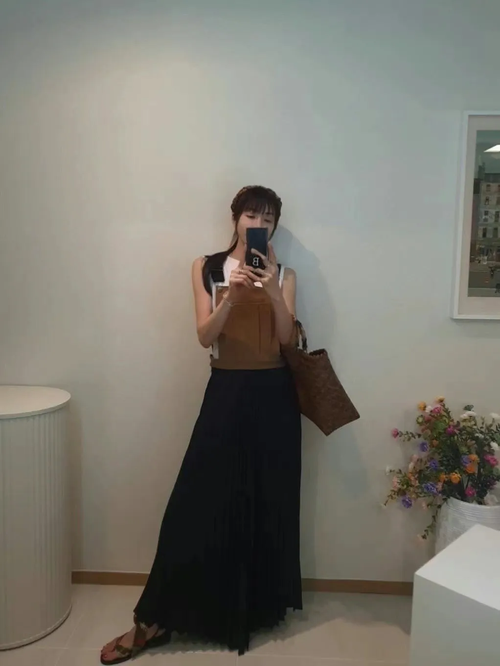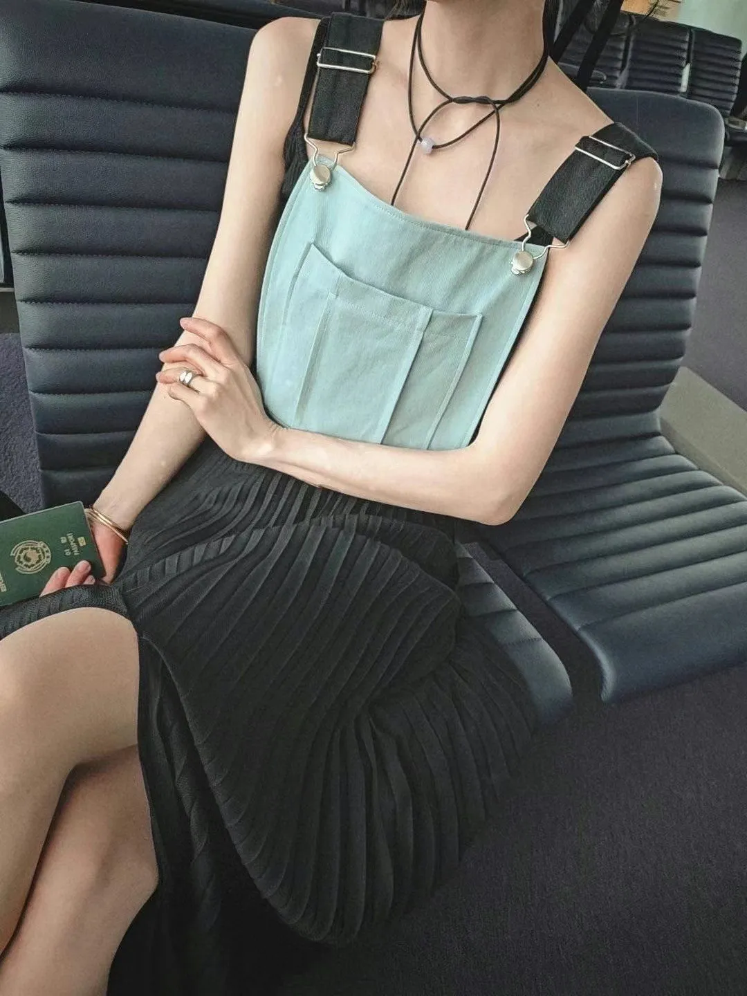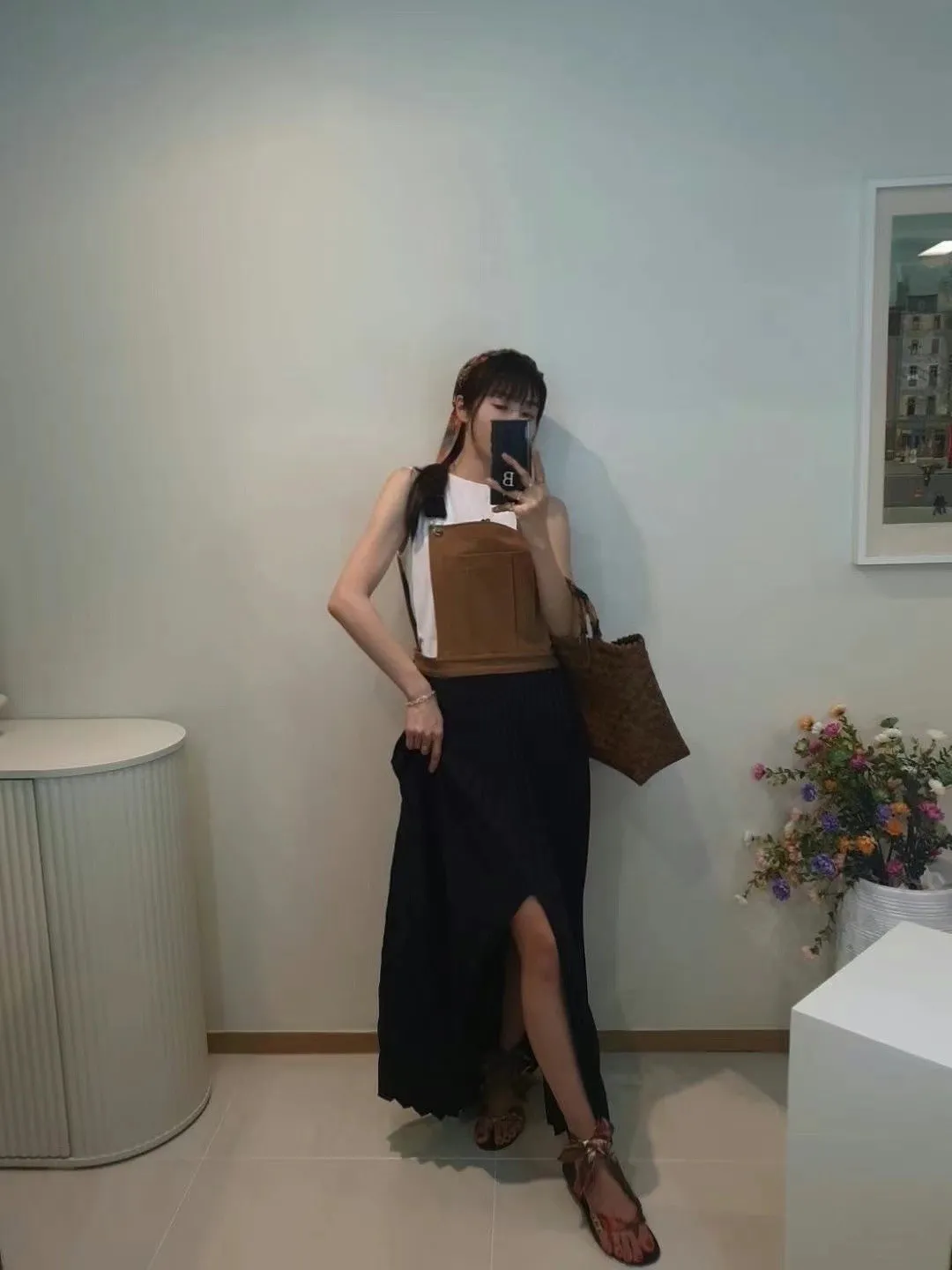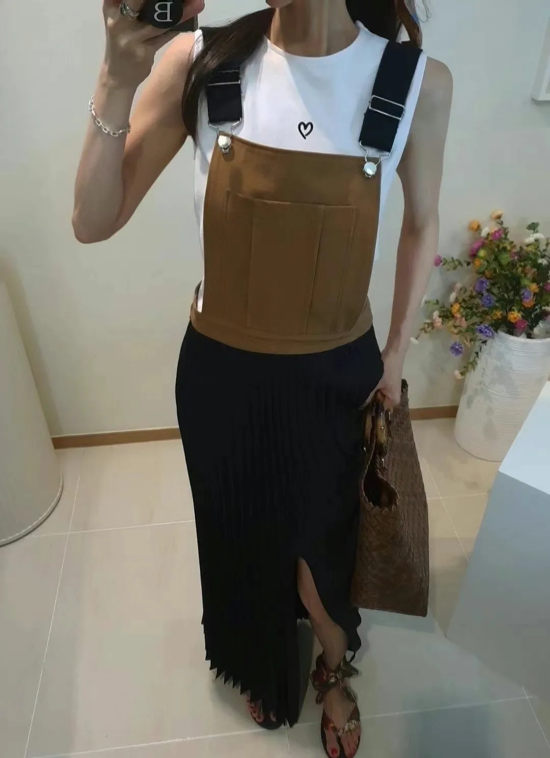 棉+雪紡 上身厚磅挑料 裙子前開叉是雪紡百褶 肩帶可調