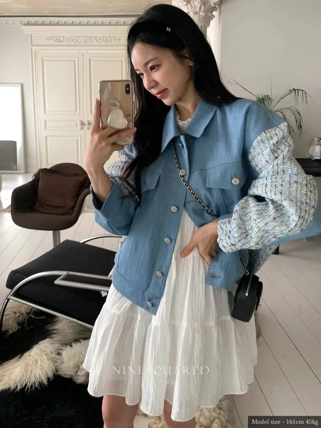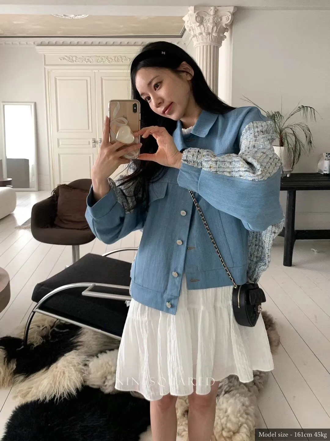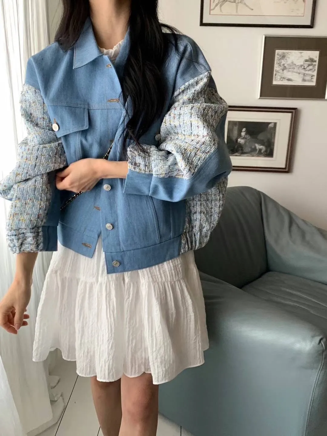 CM500許願款丹寧拼接小香風美袖外套 淺藍 深藍 官網價$2920 線上價$2890