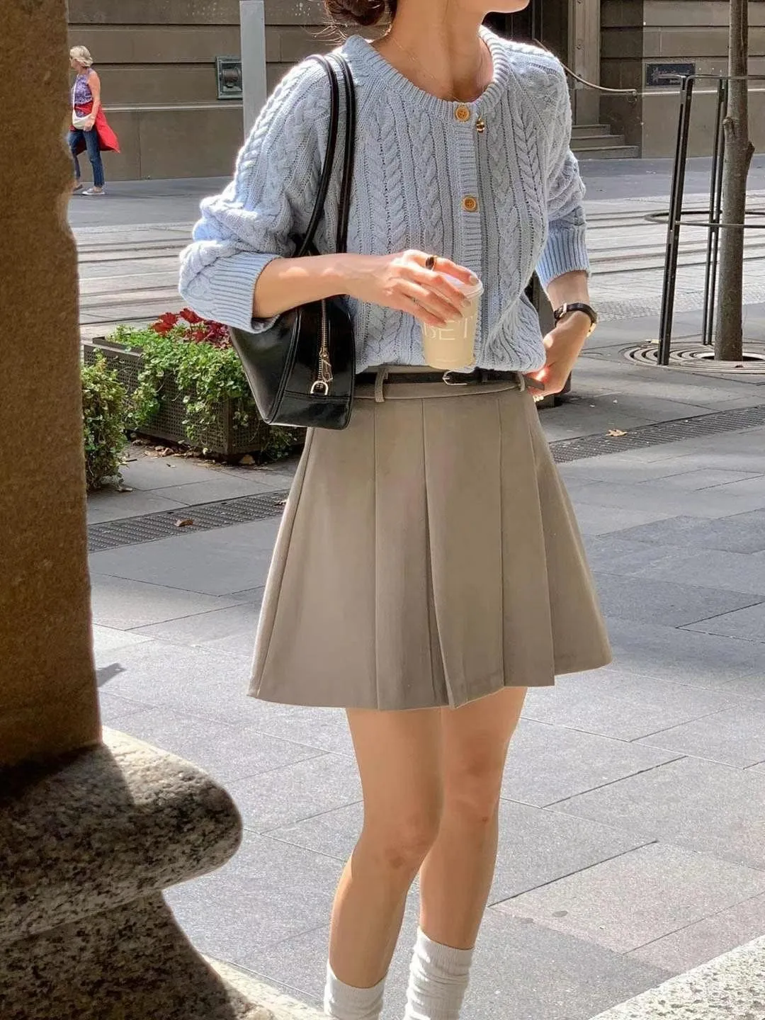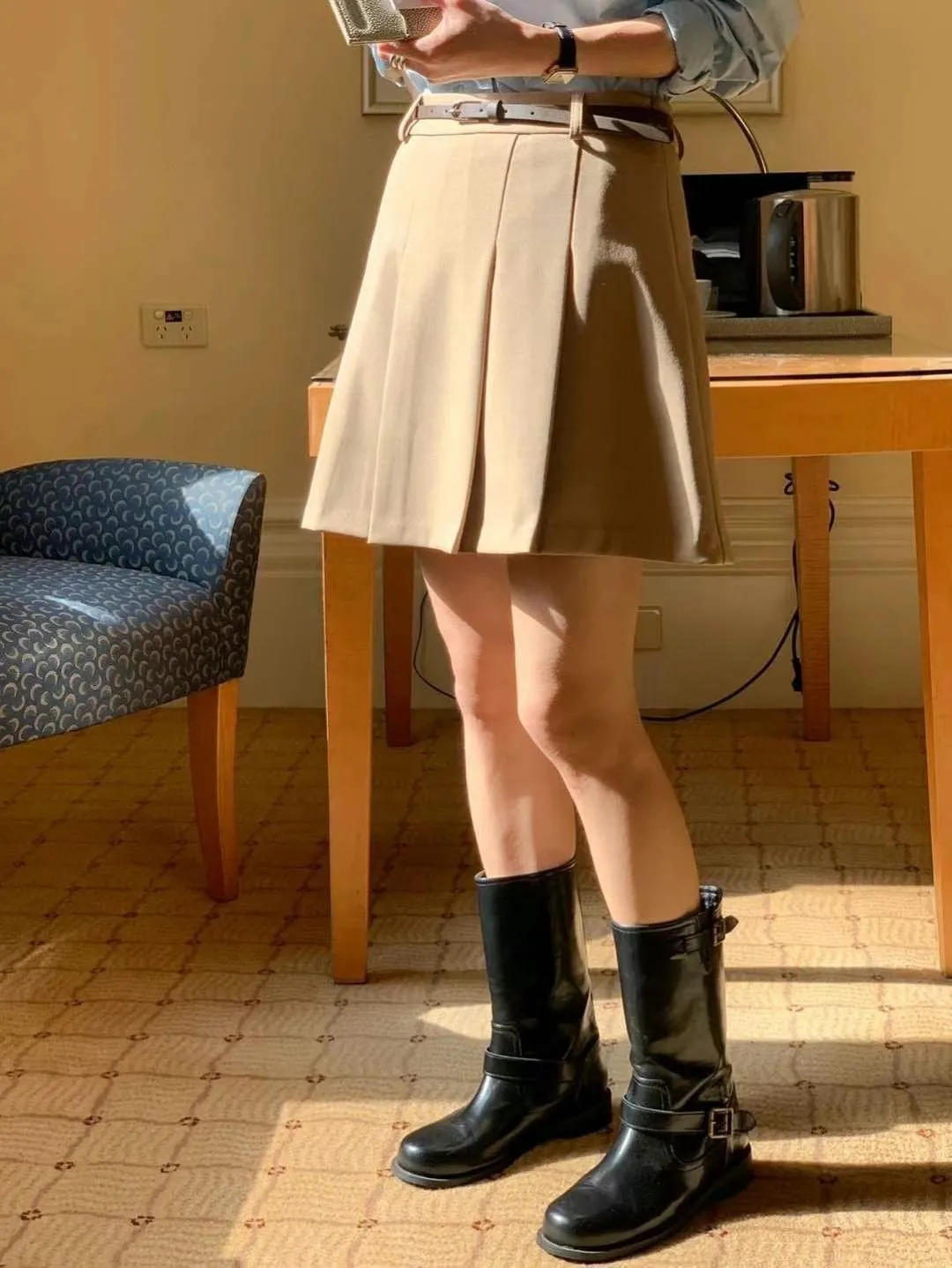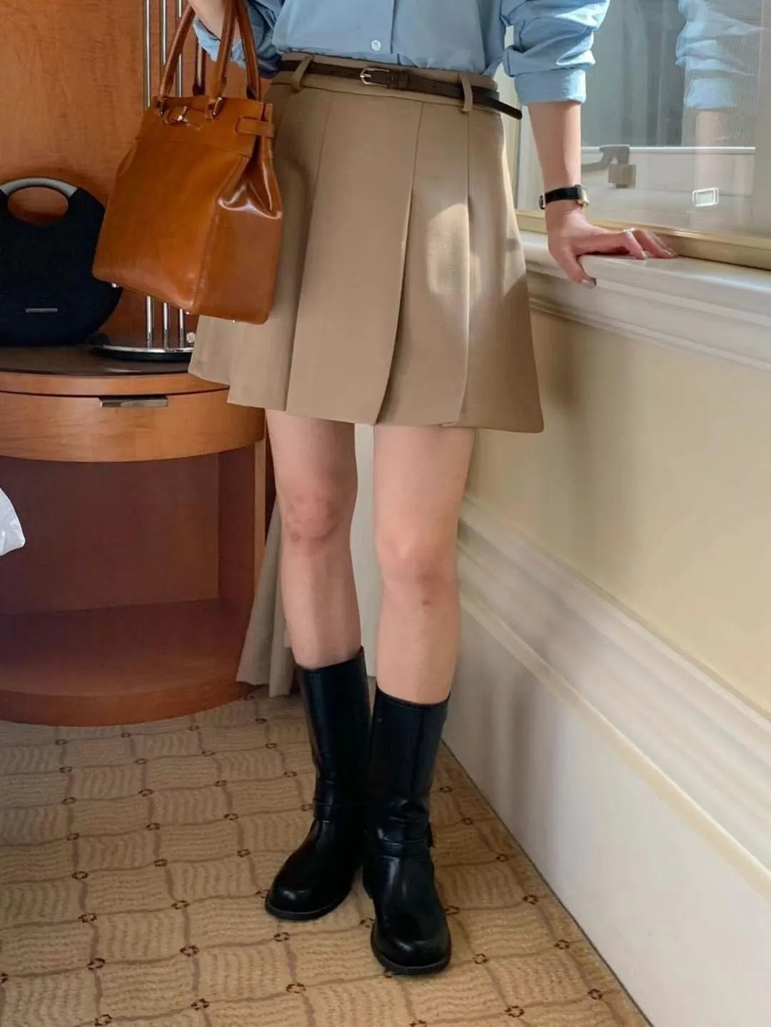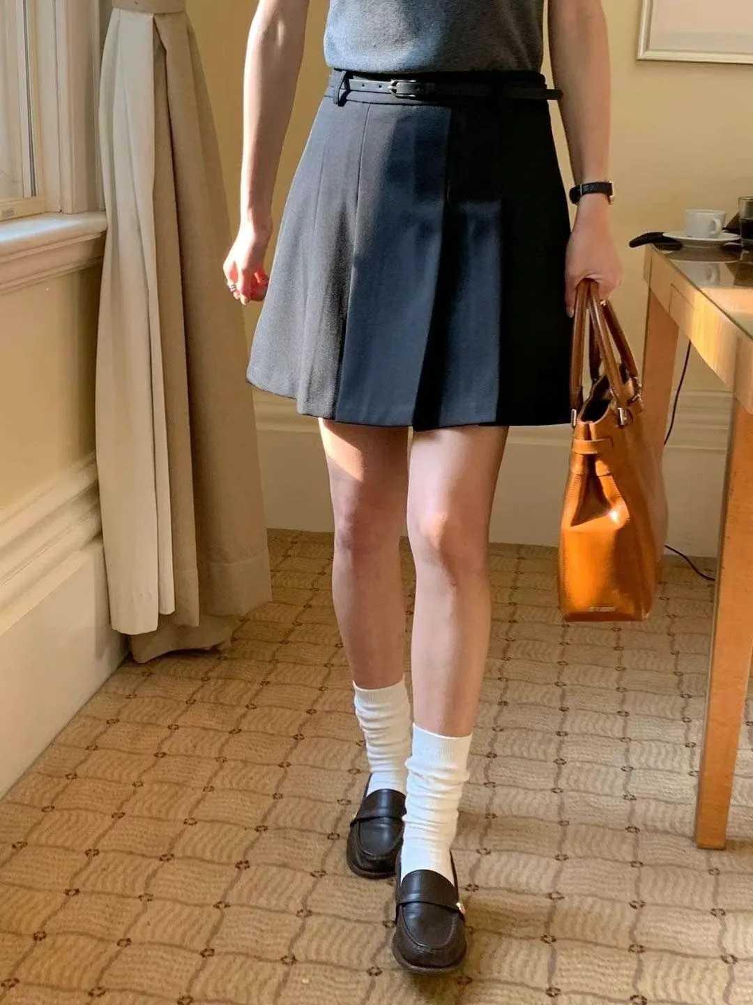 CM513高質感寬百褶短裙(附皮帶) 灰 黑 奶茶 S M 官網價$890 線上價$860