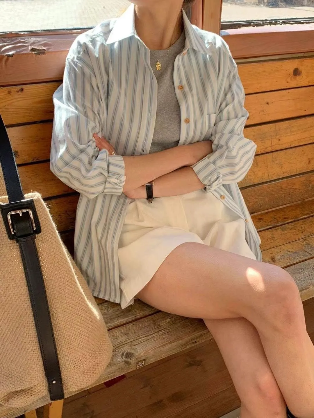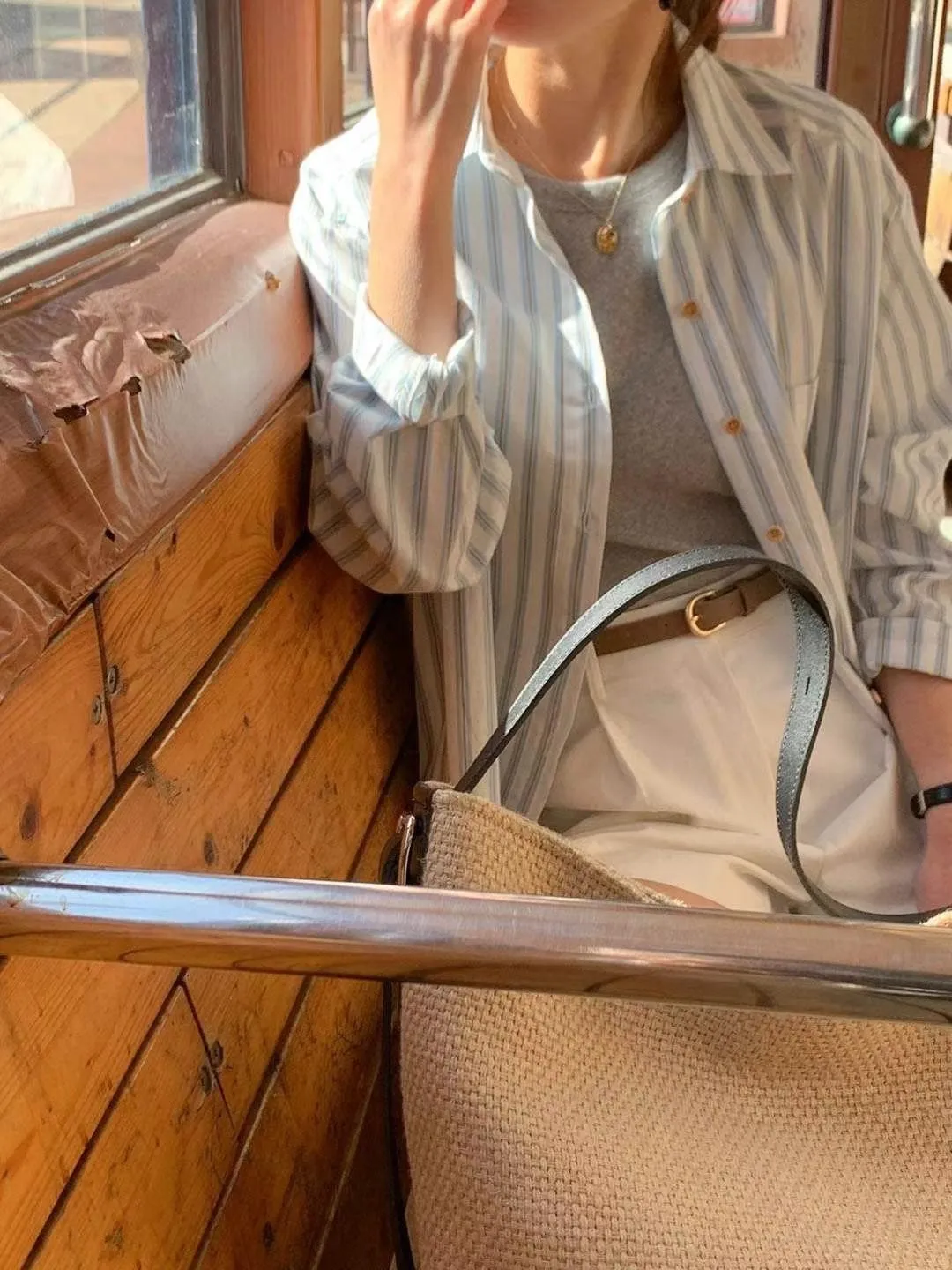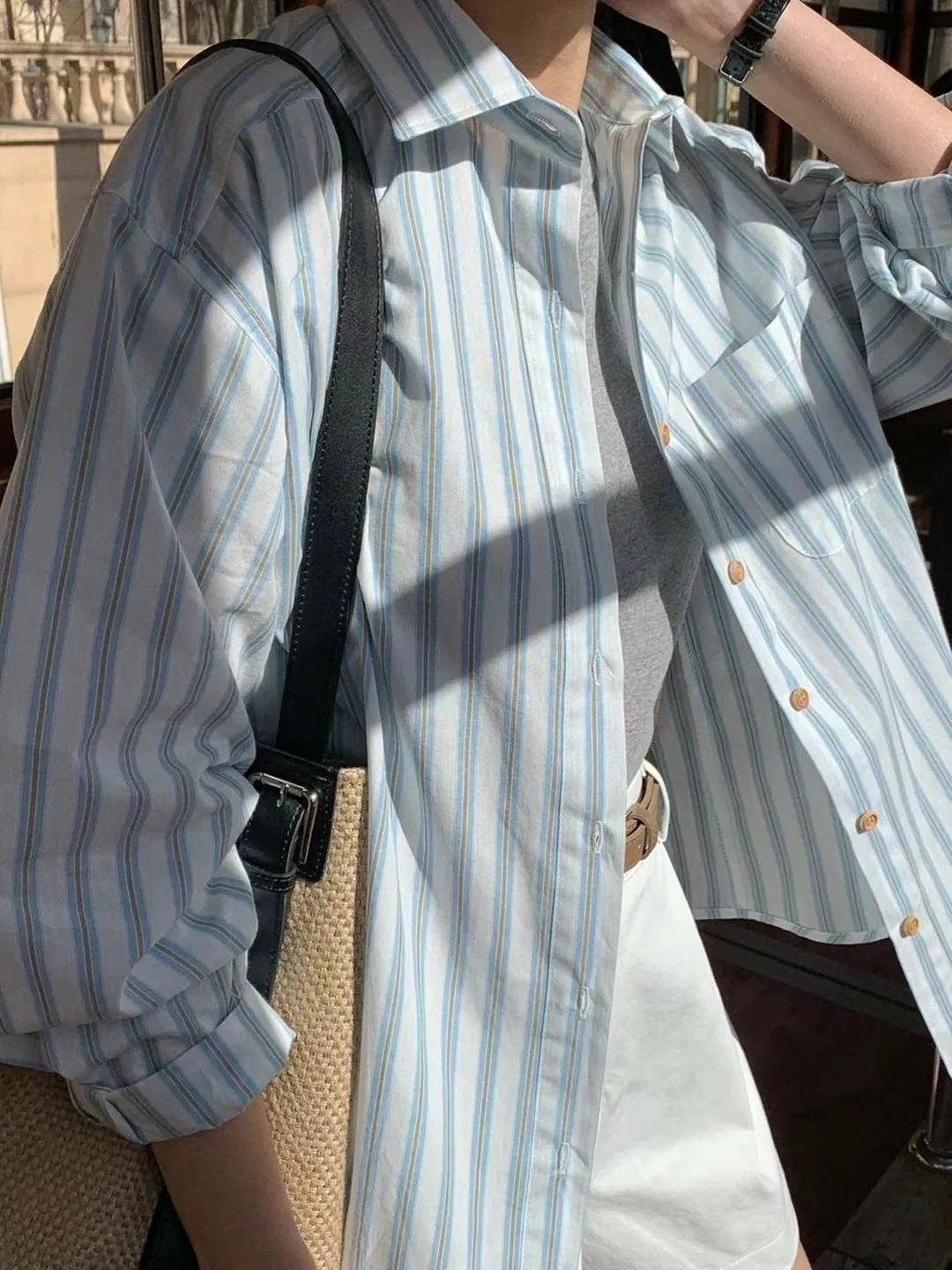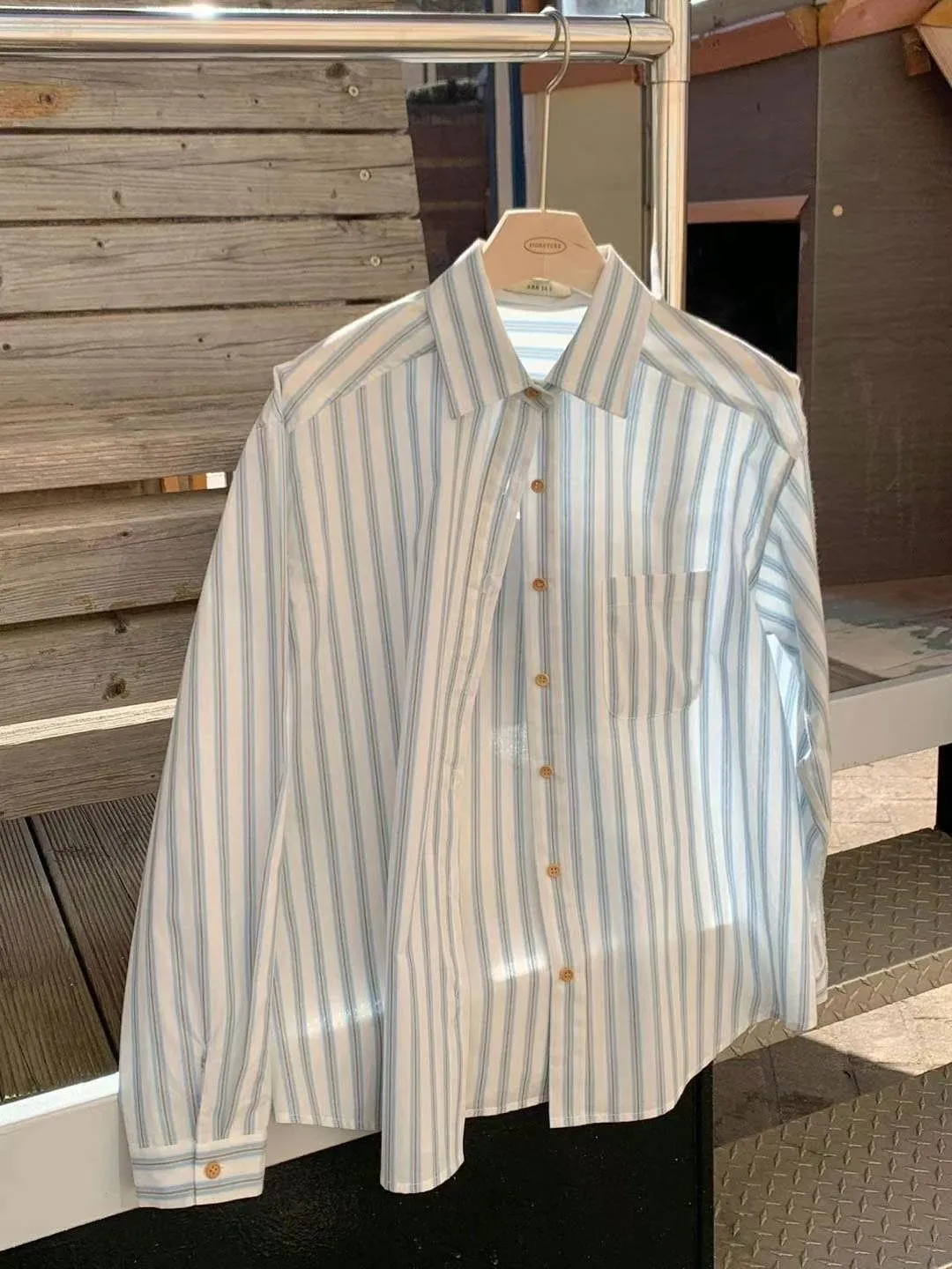 CM519薄款直條紋單口袋襯衫 米 藍 粉 官網價$660 線上價$630