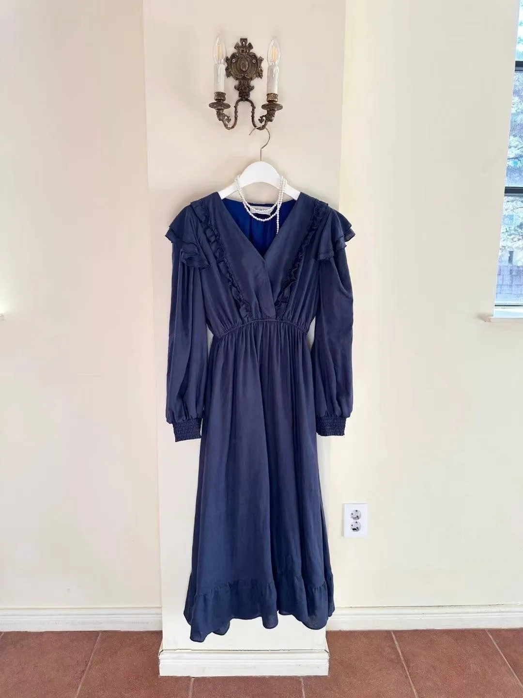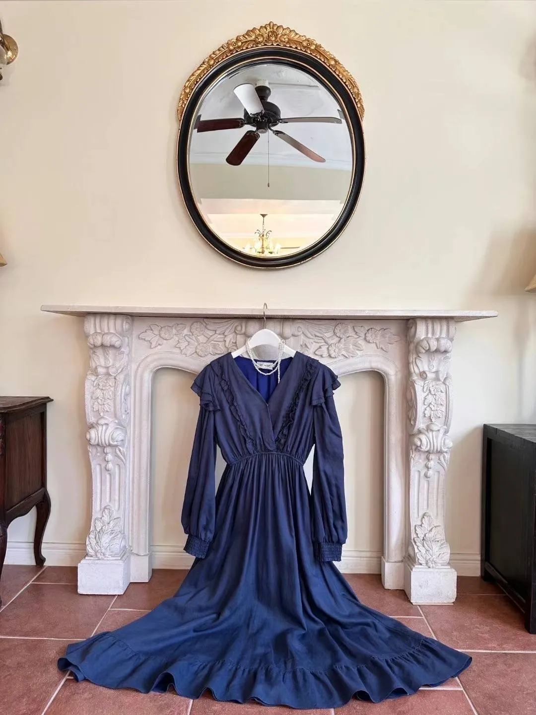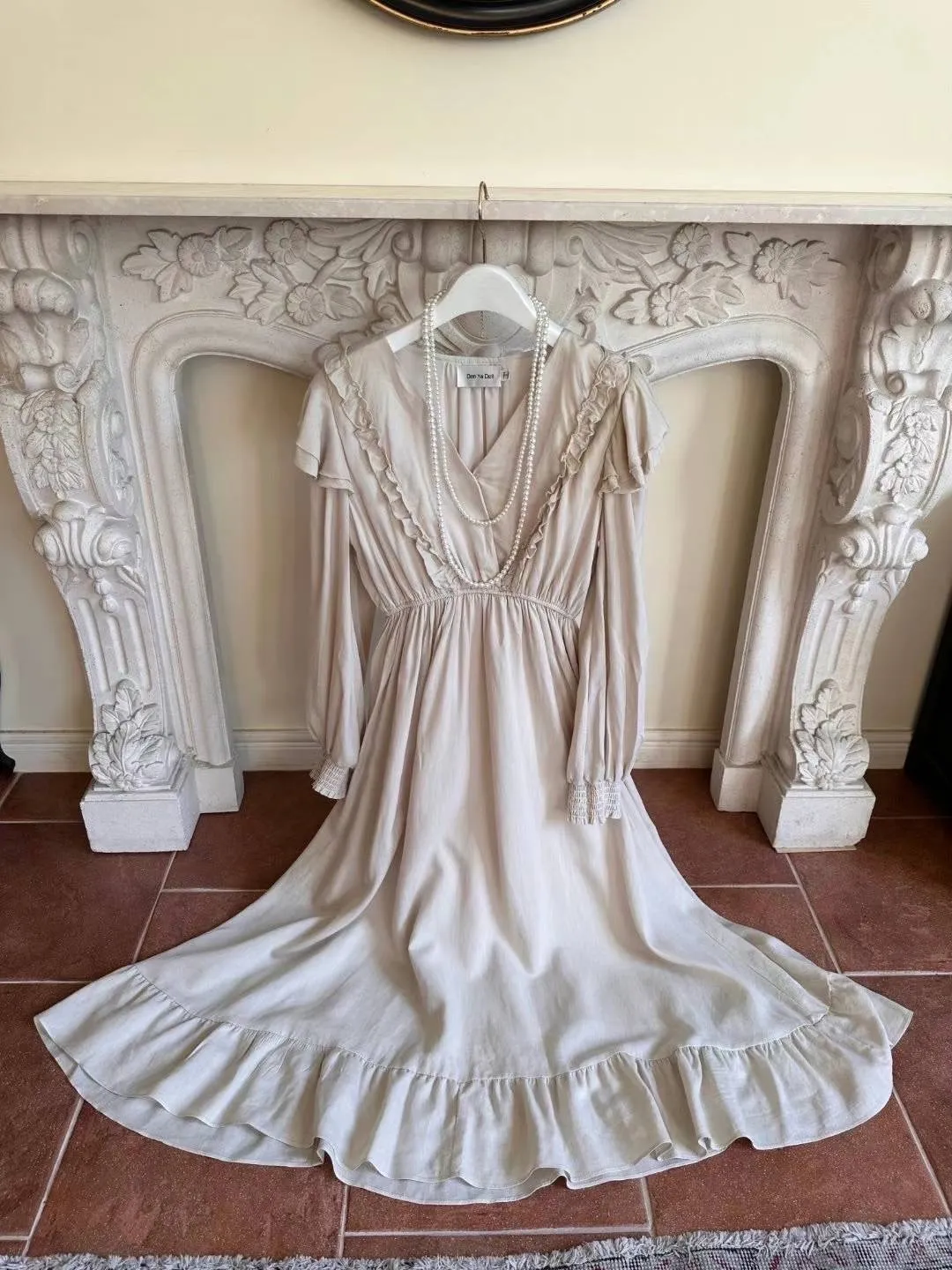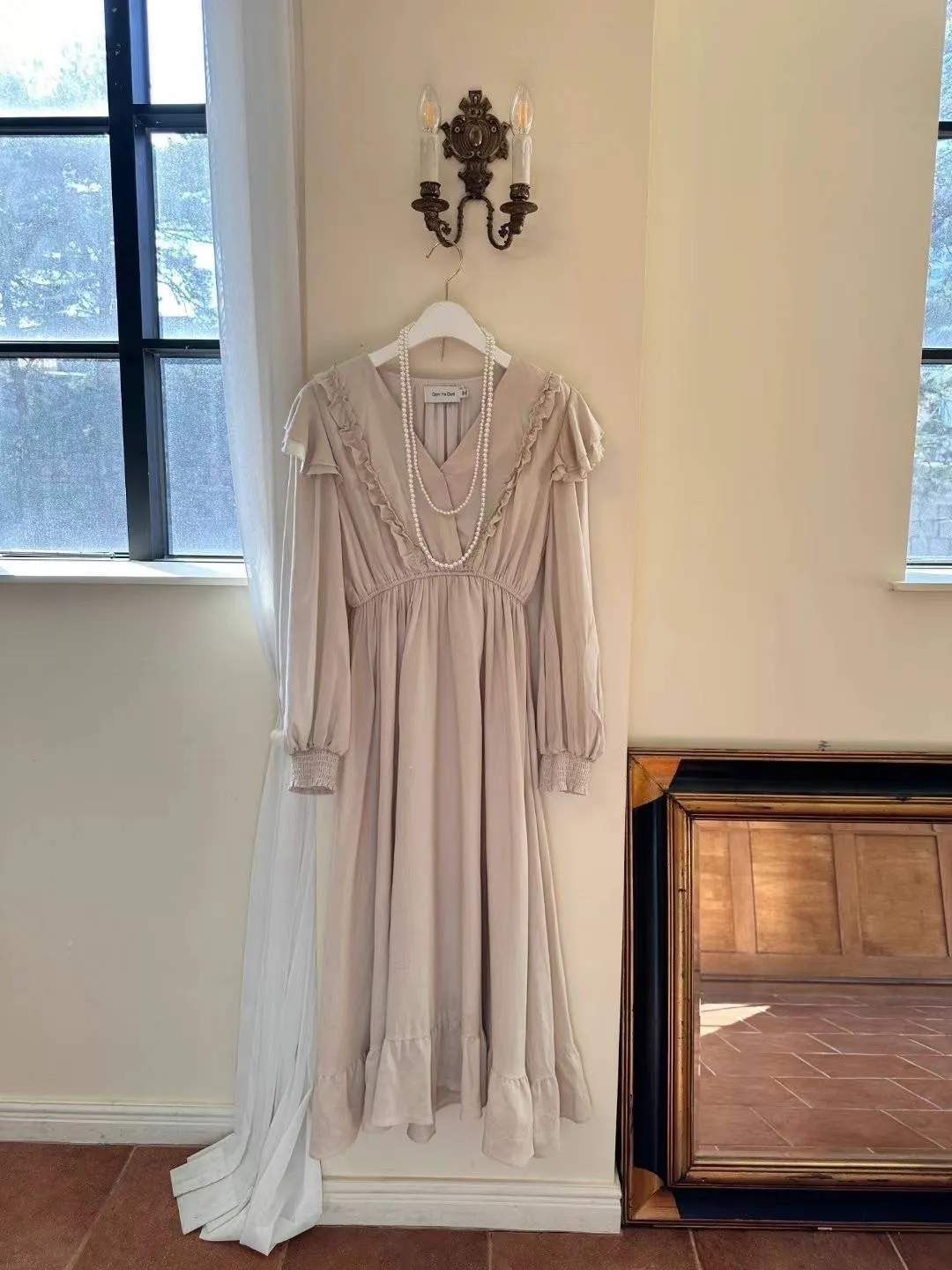CM580極美優雅純色V領飄逸洋裝 奶茶 藍 官網價$1690 線上價$1660