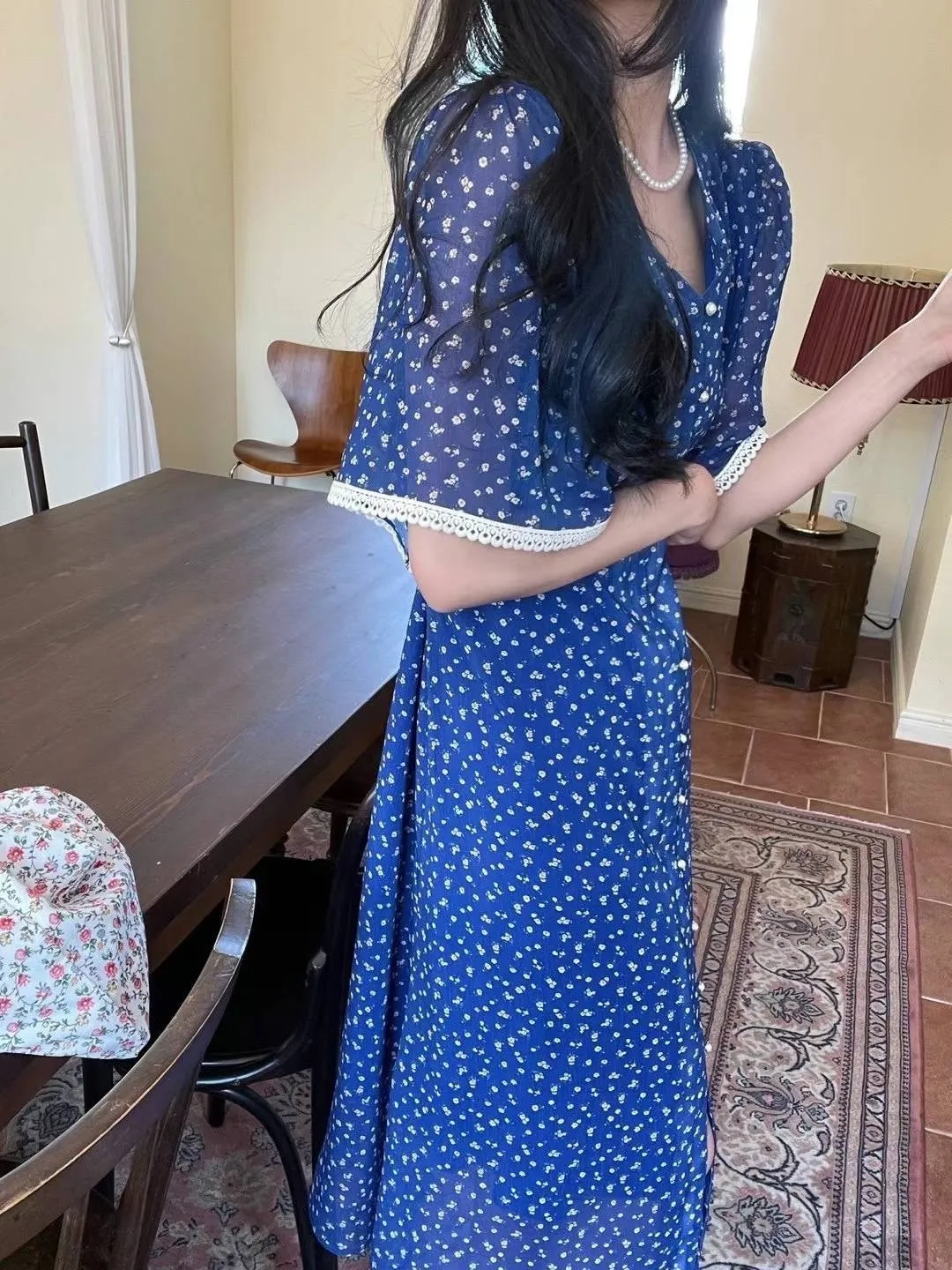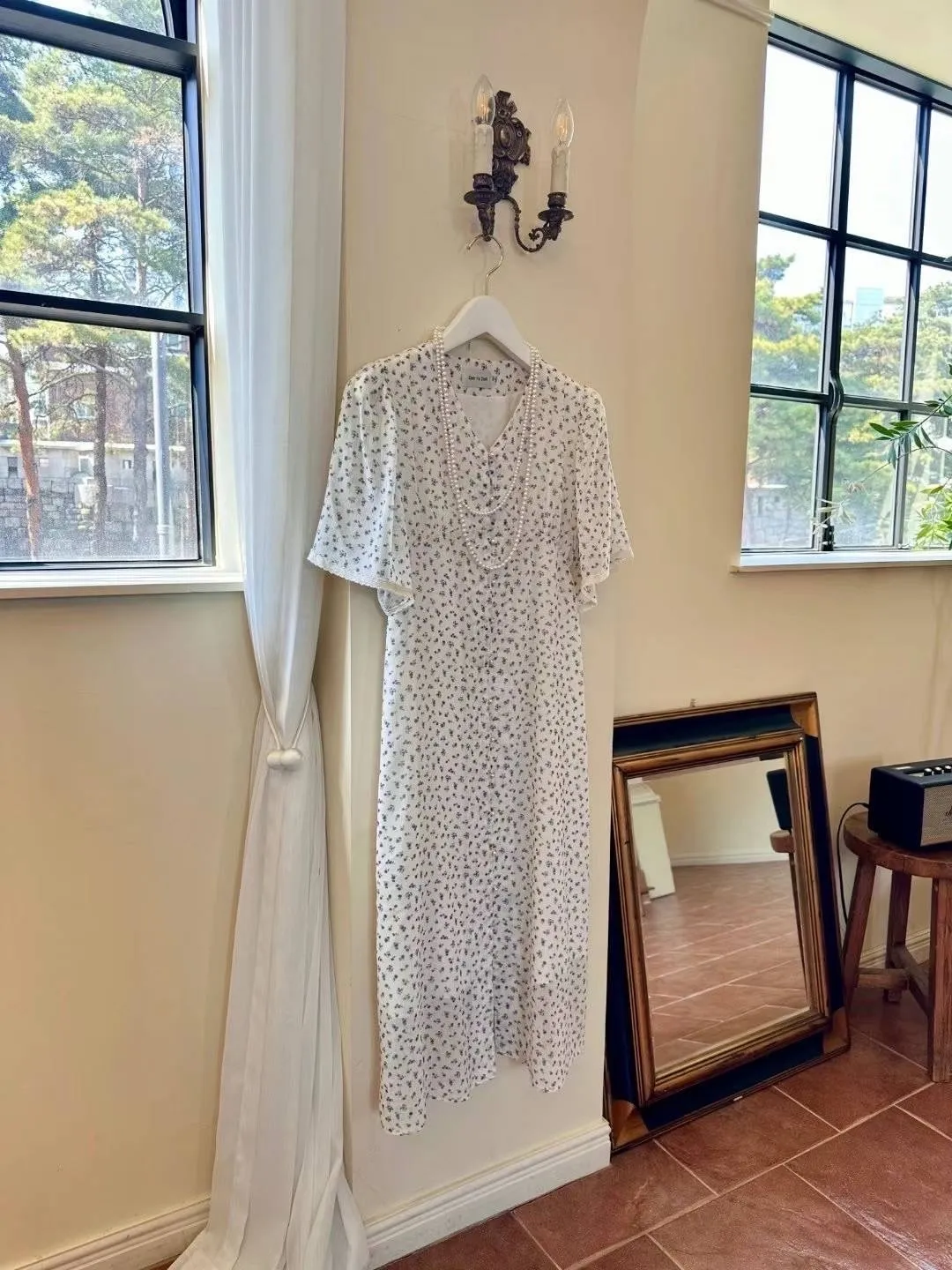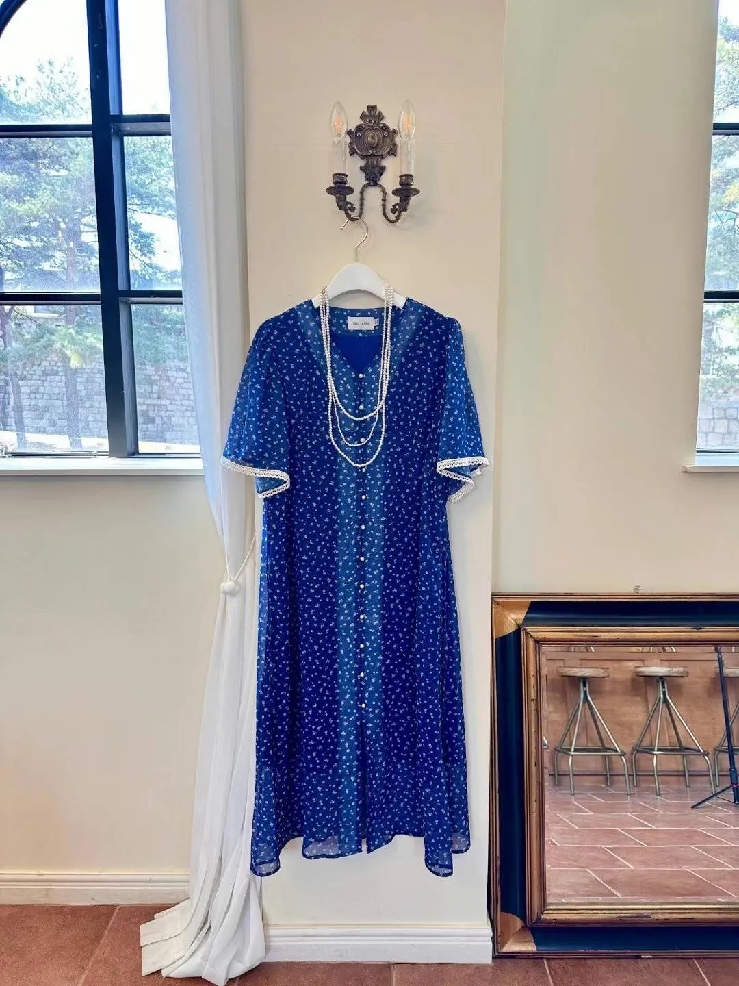 CM582細緻小碎花V領短袖透光美洋裝(附綁帶) 白 藍 官網價$1490 線上價$1460