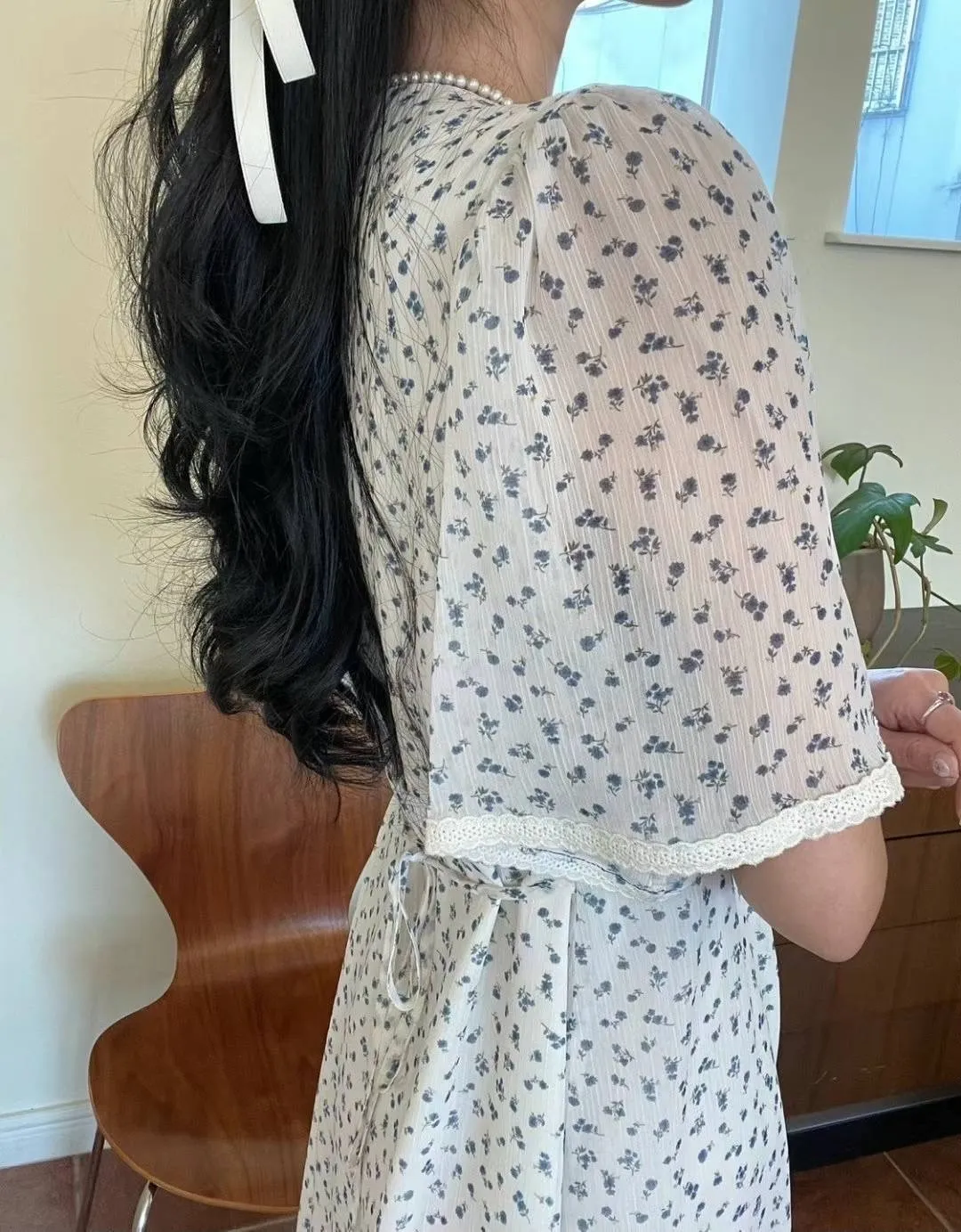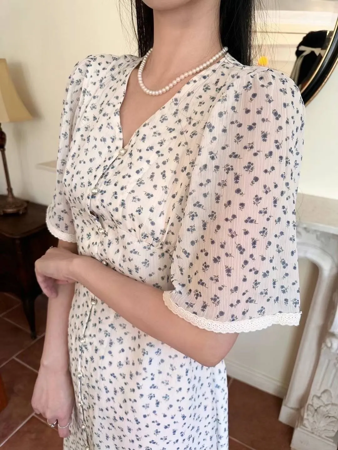 雪紡 排釦穿脫 精緻短袖拼接蕾絲 輕盈透光 適合台灣夏天 有內理 L號友善