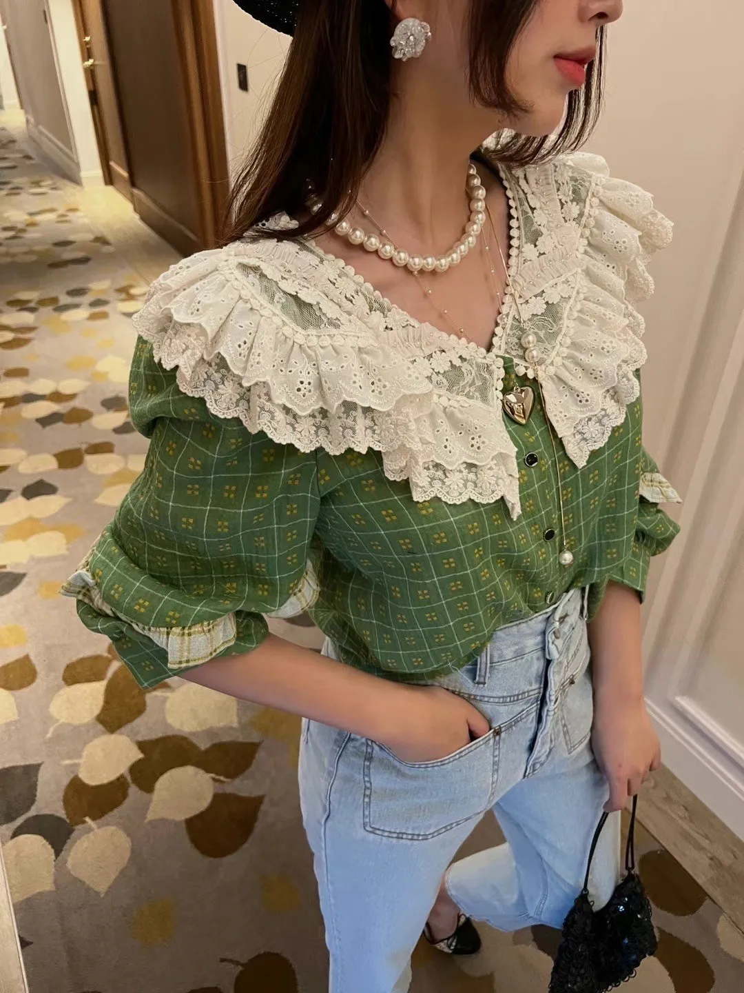 棉+麻 薄款 精緻蕾絲拼接美領 立體面料 手繡有釦 排釦穿脫