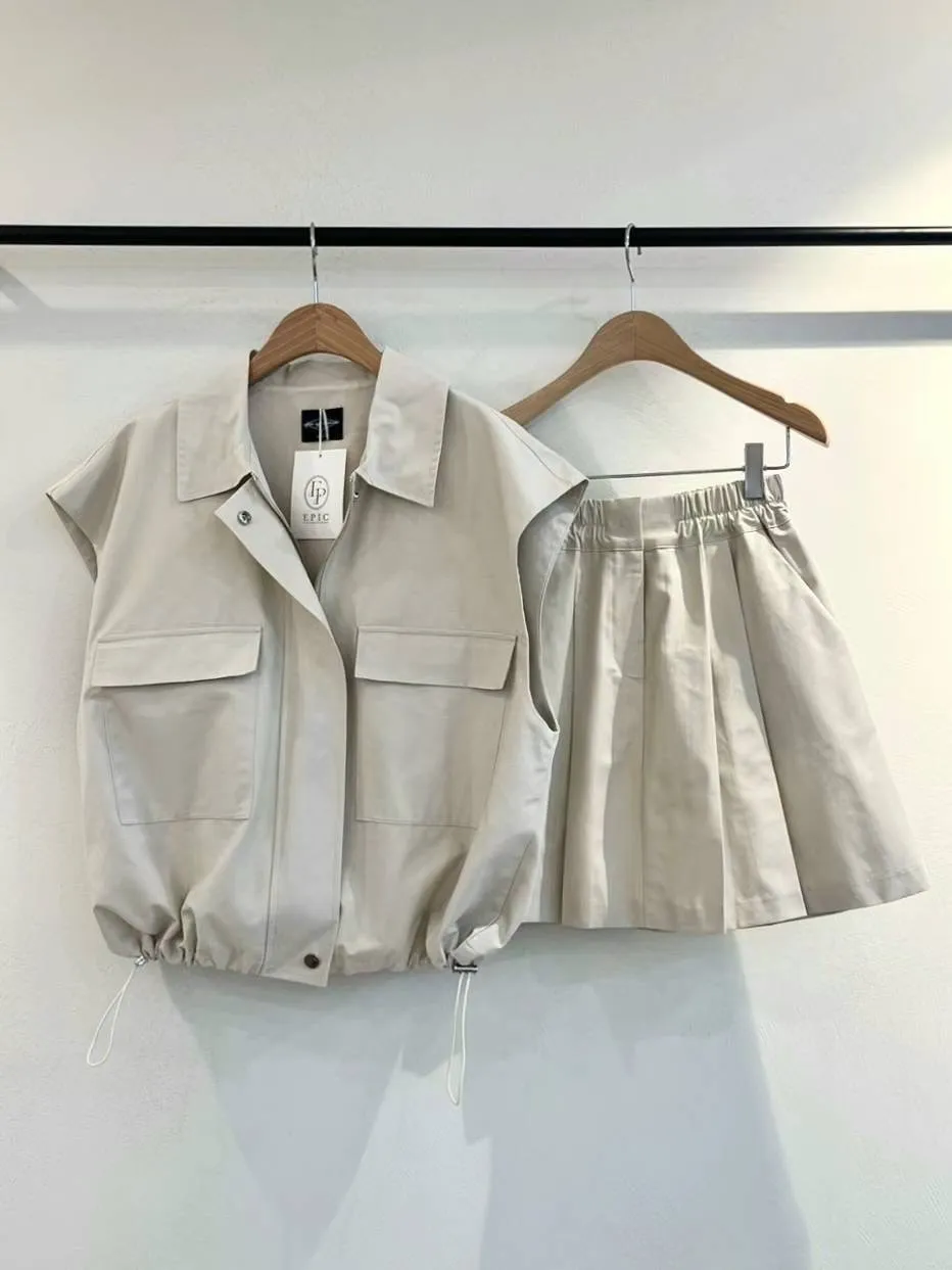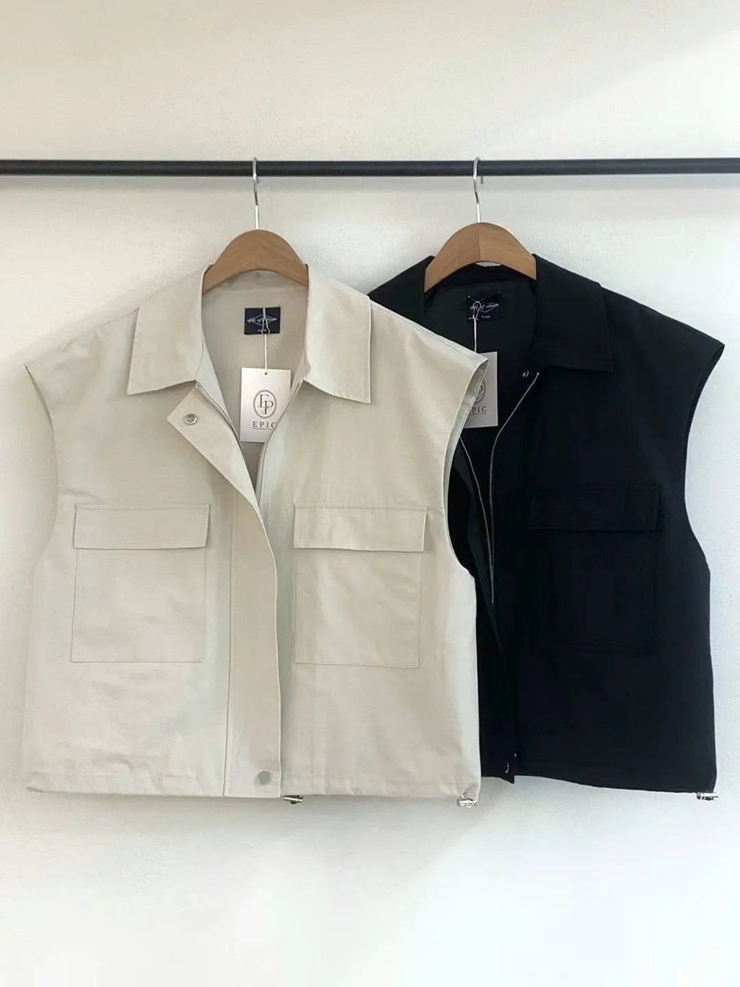 CM854套裝的雙口袋拉鍊背心 米 黑 官網價$1840