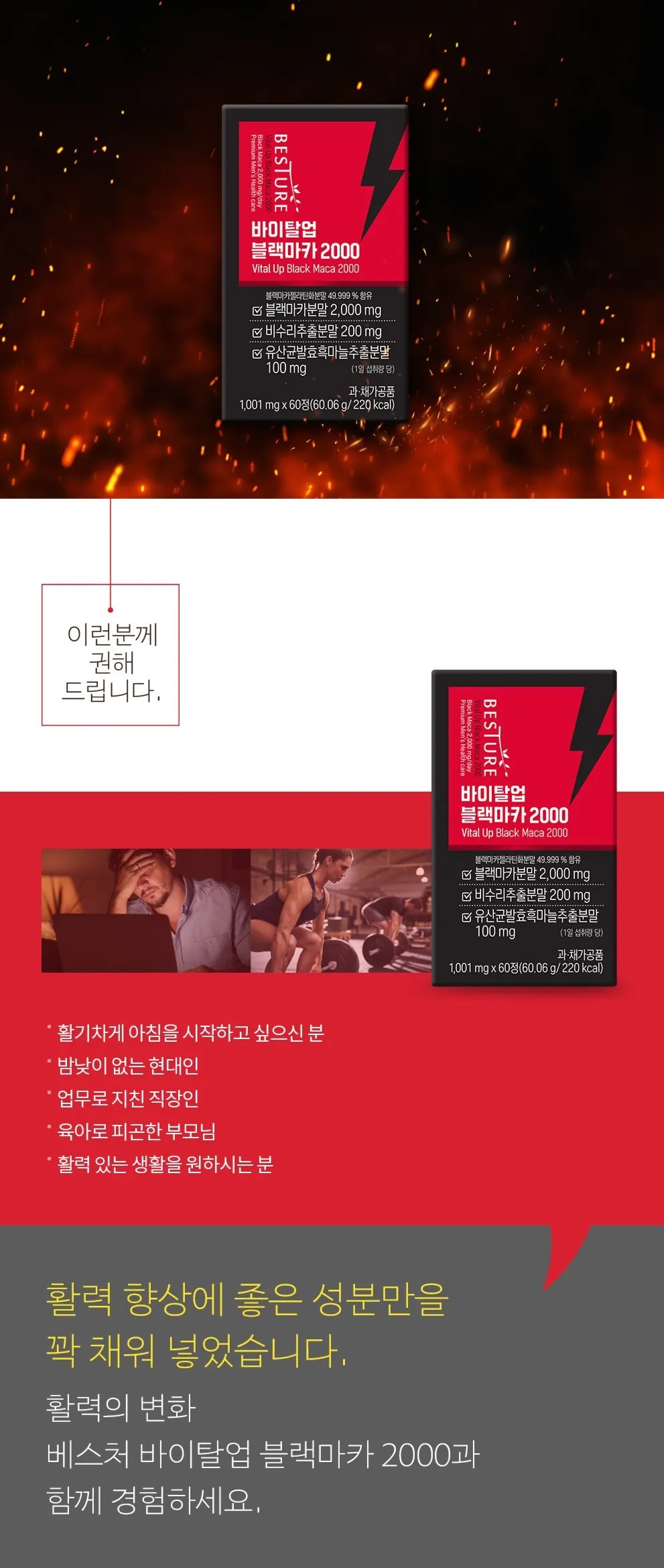 體力提升 : 黃銅類化合物+提高活力的夜光門200mg+黑蒜+山茱萸