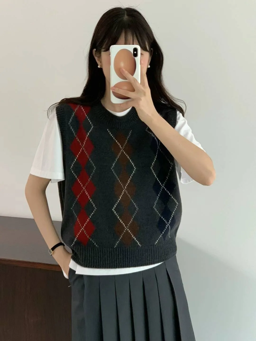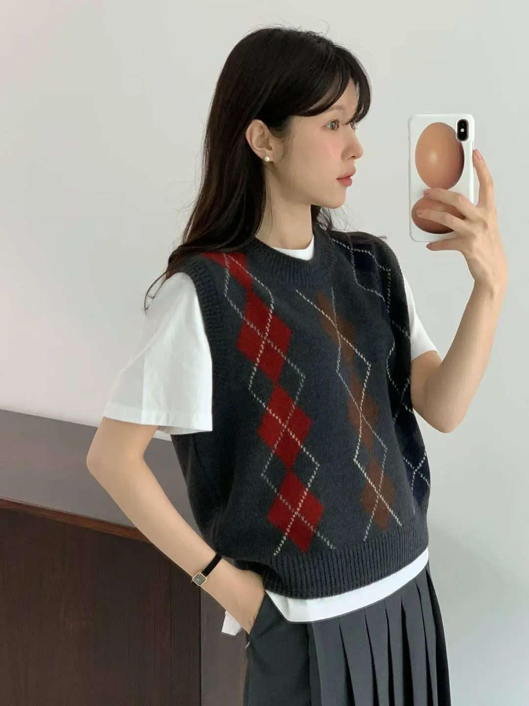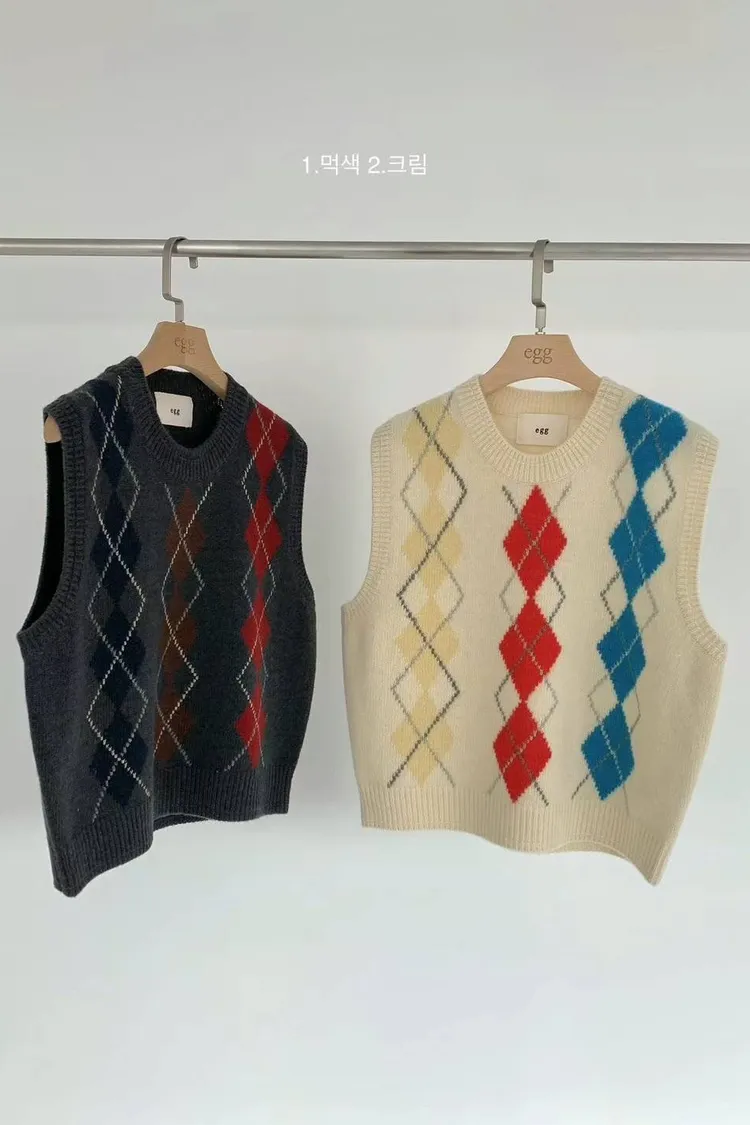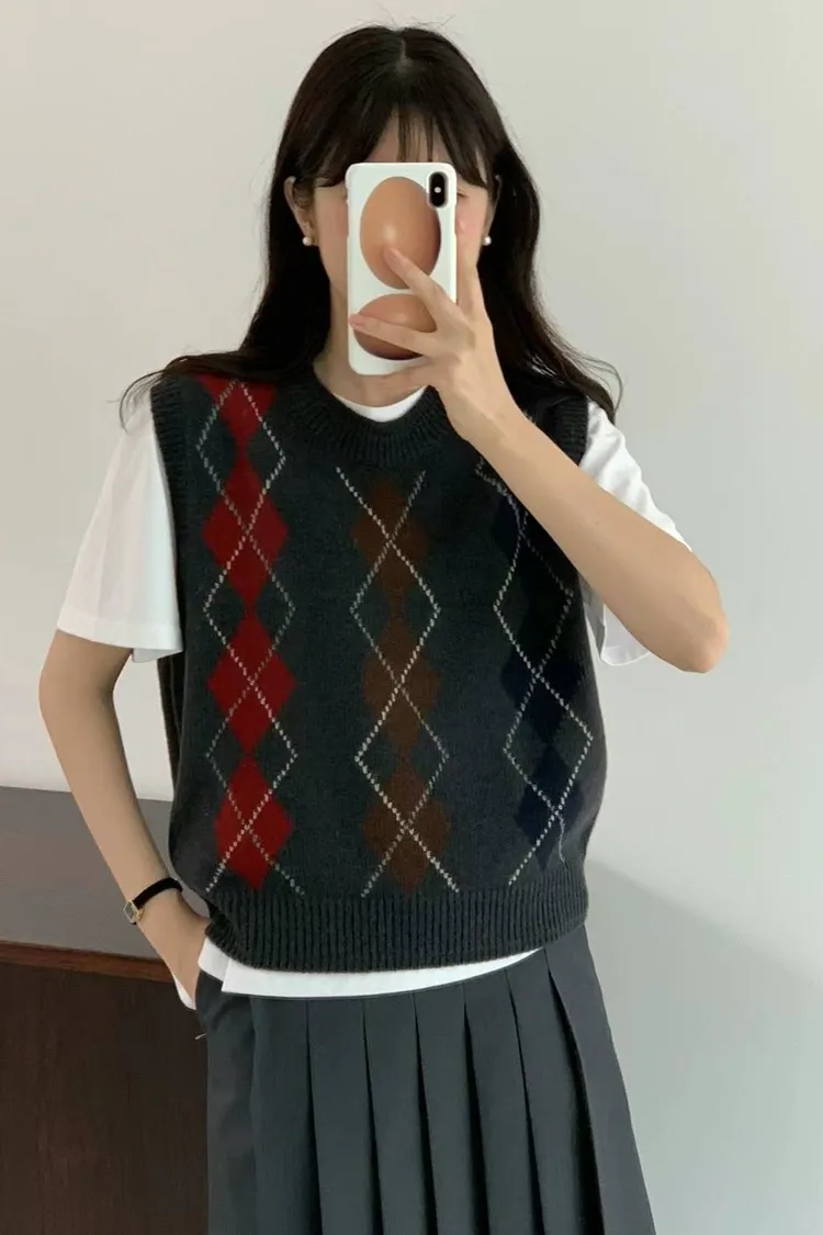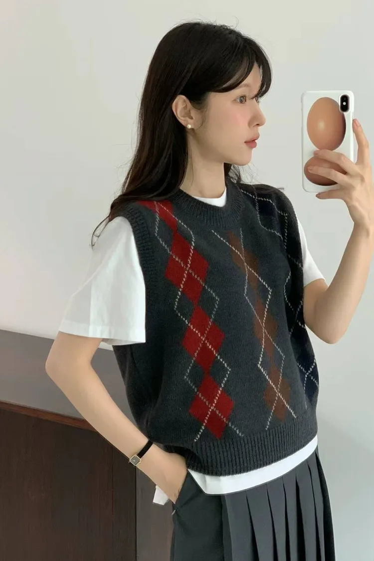 CS011經典菱格色彩短袖針織背心 米 灰 $1620