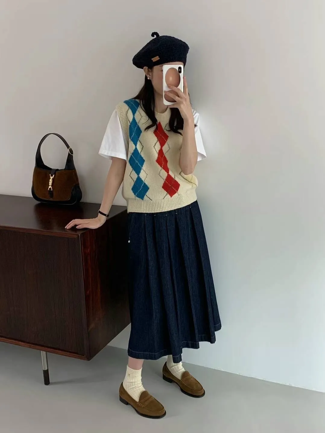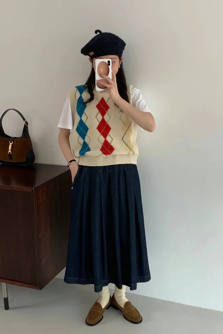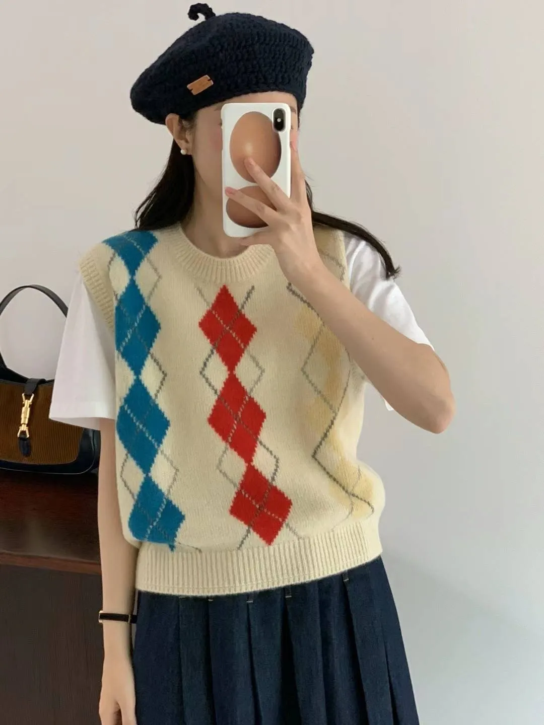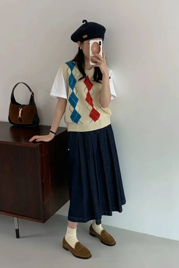 CS011經典菱格色彩短袖針織背心 米 灰 $1620