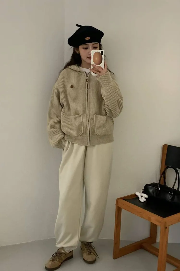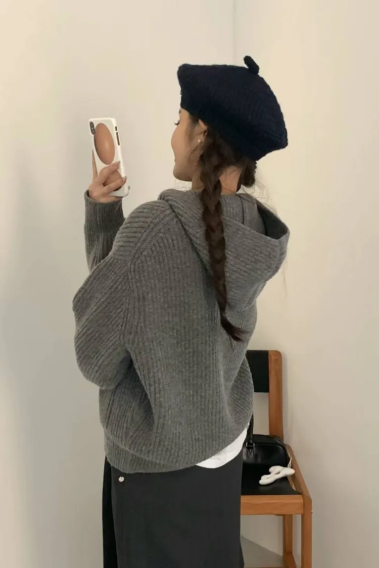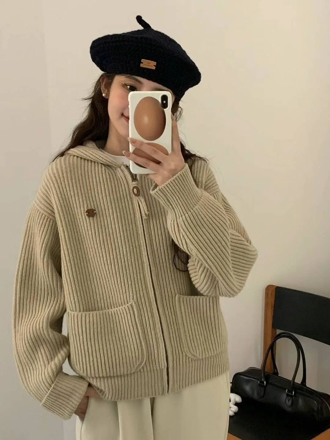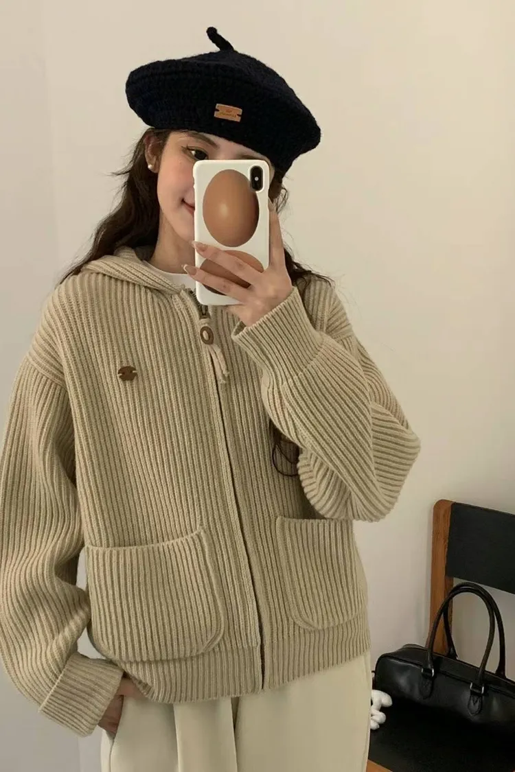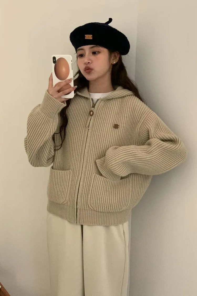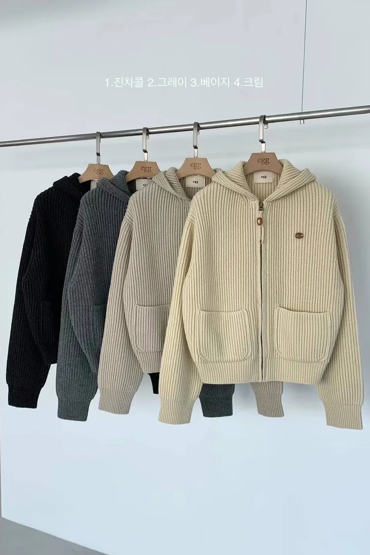 CS021熱銷款羊毛雙口袋坑條小標針織連帽外套 奶茶 黃 淺灰 深灰 $2560