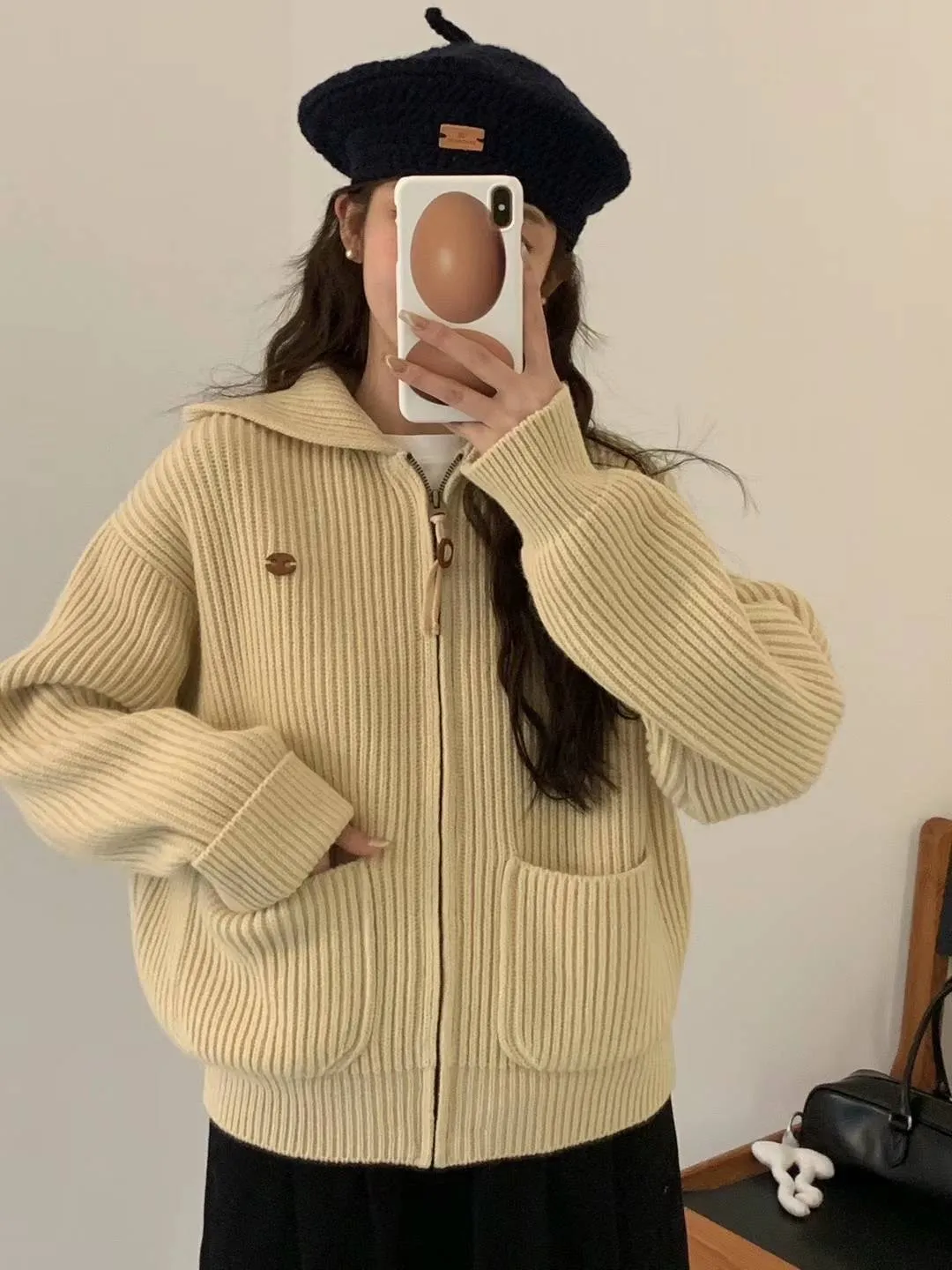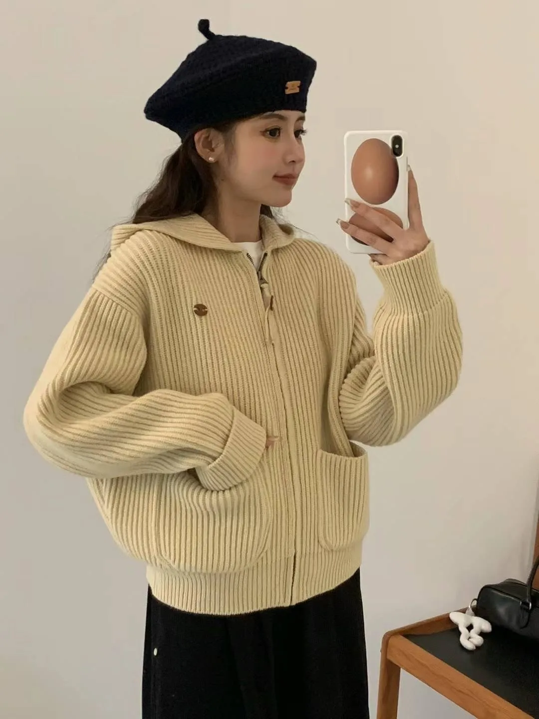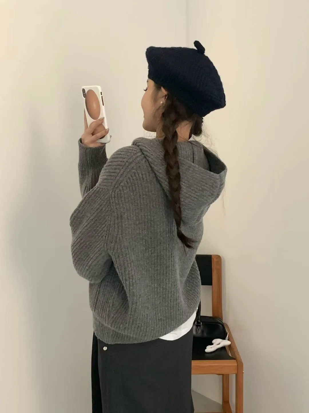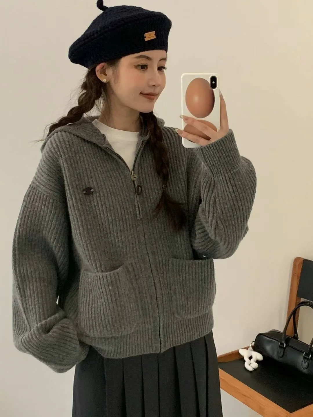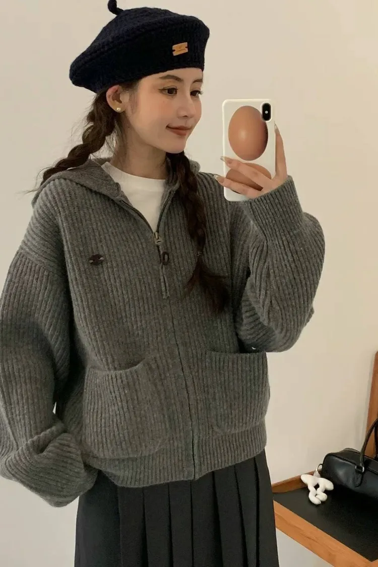 CS021熱銷款羊毛雙口袋坑條小標針織連帽外套 奶茶 黃 淺灰 深灰 $2560