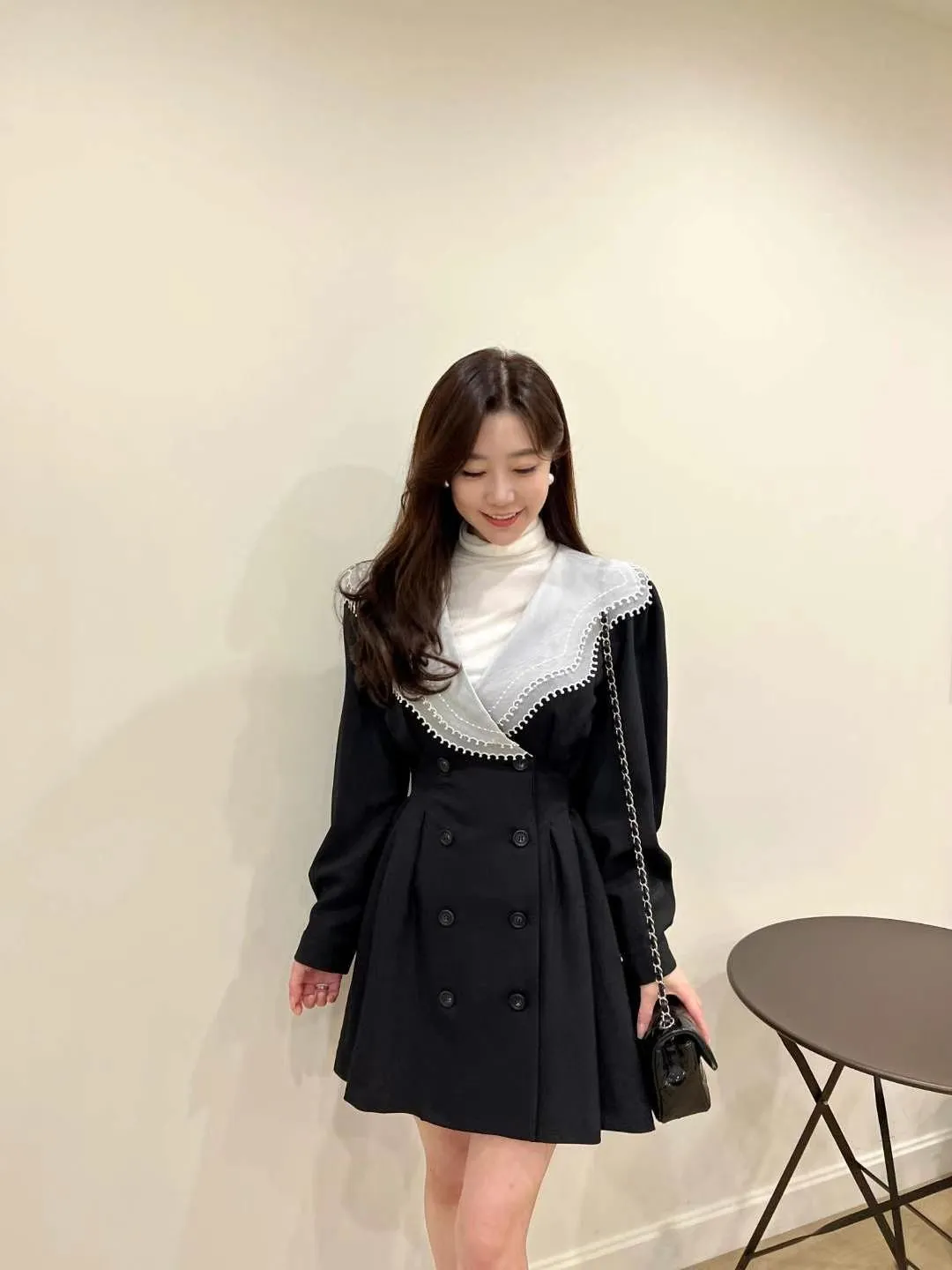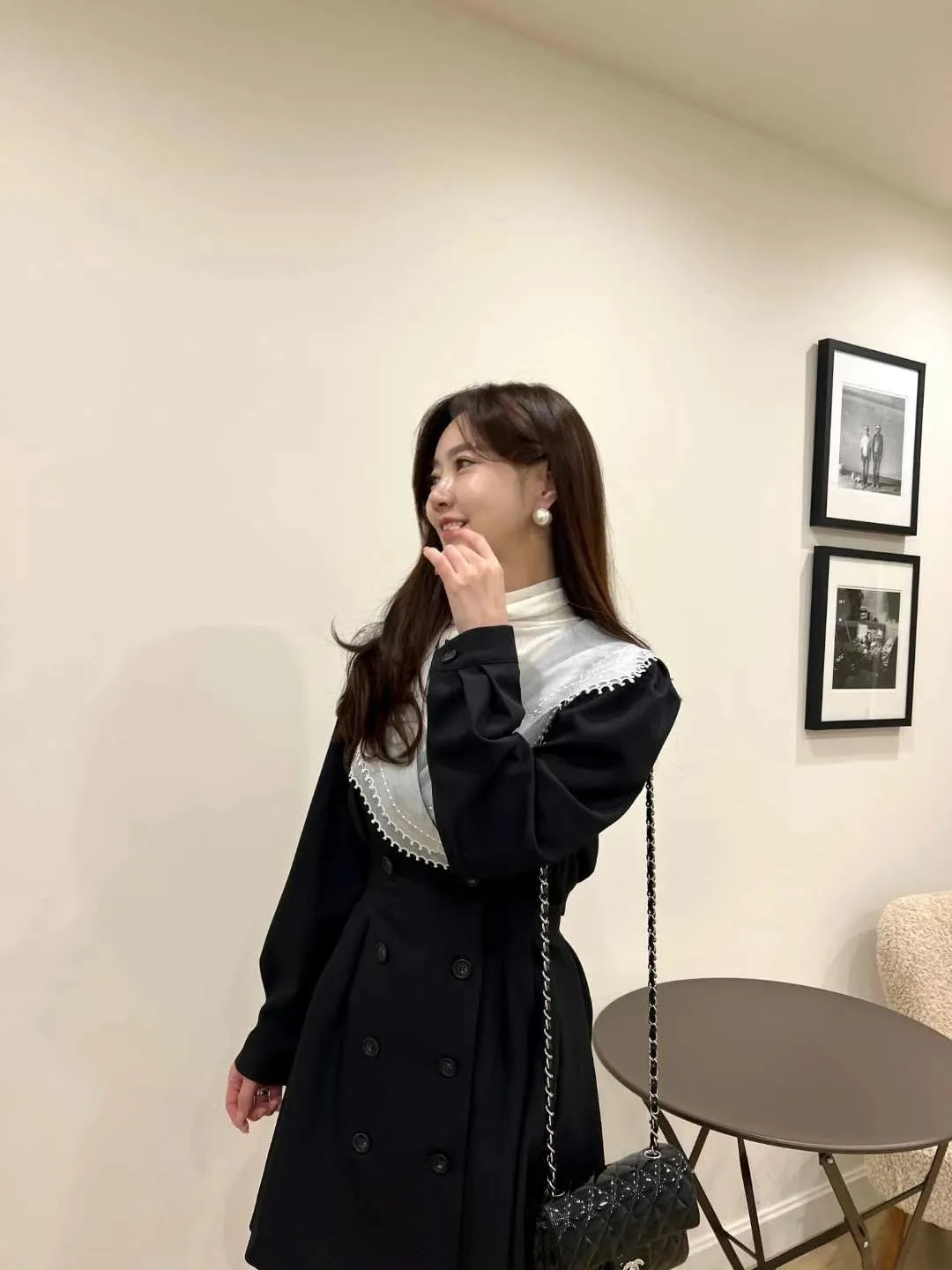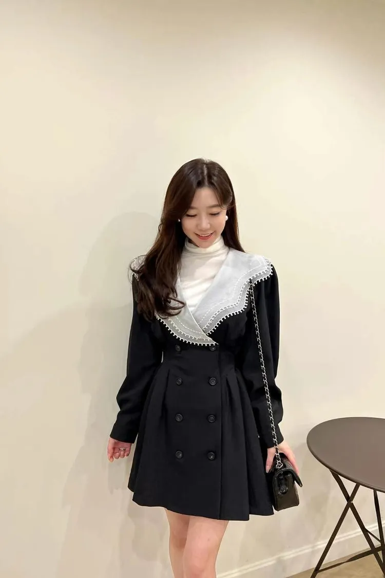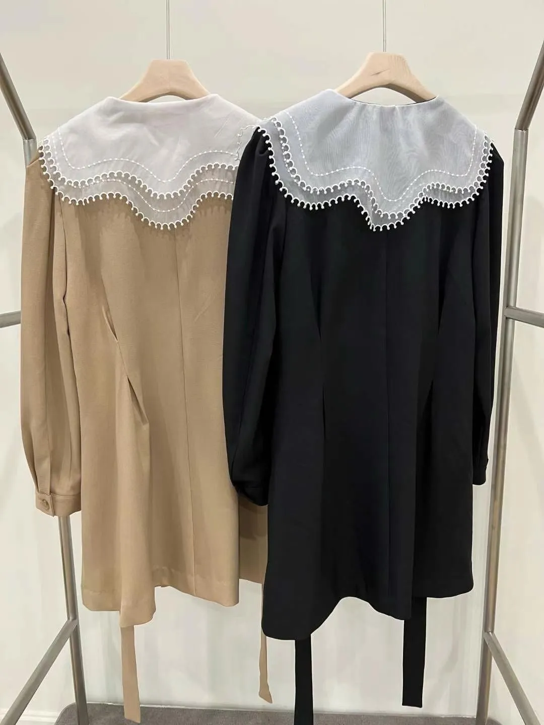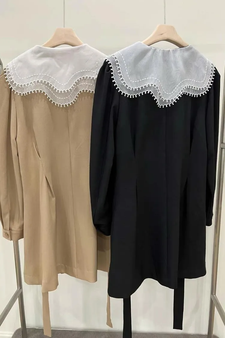 CS042雙層歐根紗翻領雙排釦洋裝 黑 奶茶 $1490