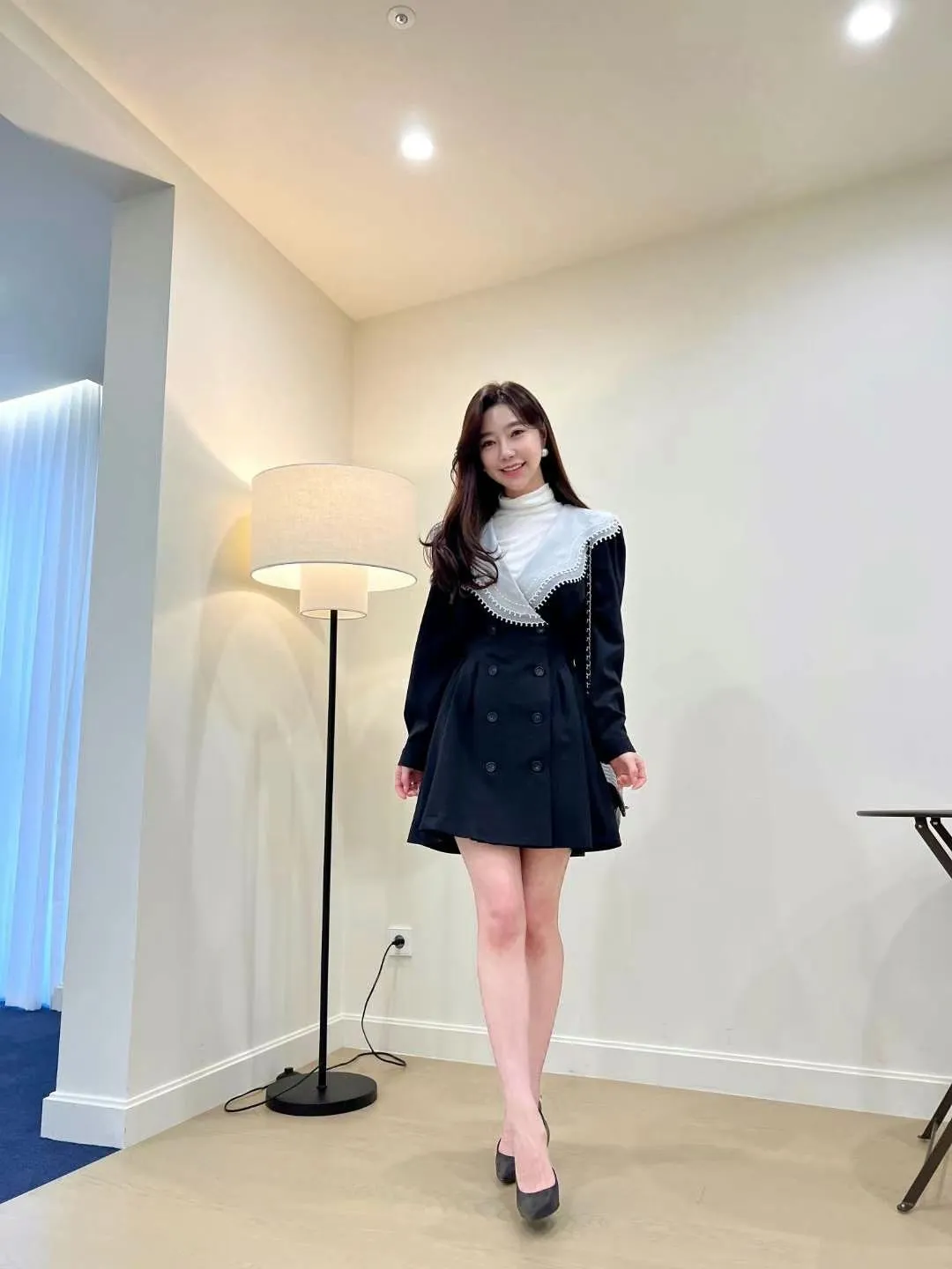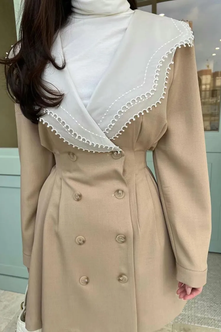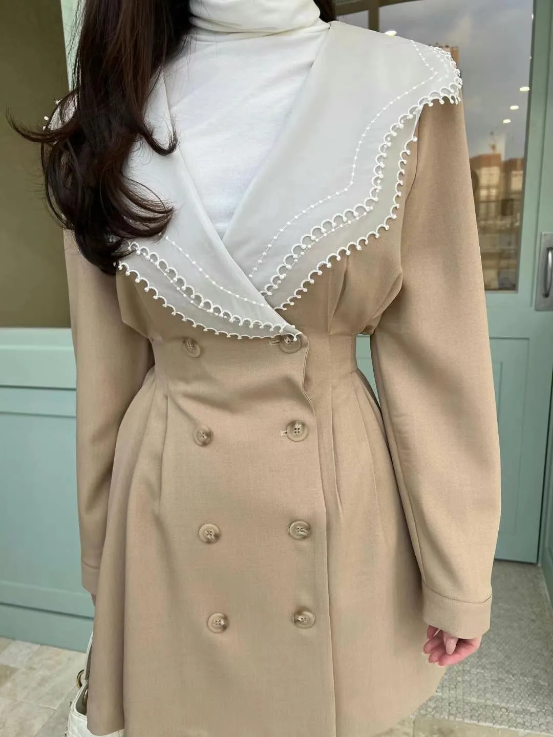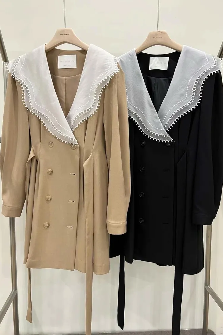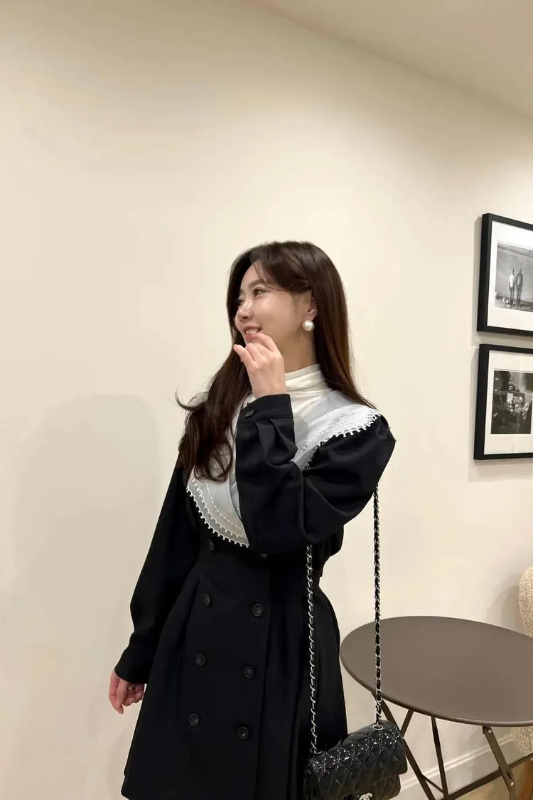 CS042雙層歐根紗翻領雙排釦洋裝 黑 奶茶 $1490