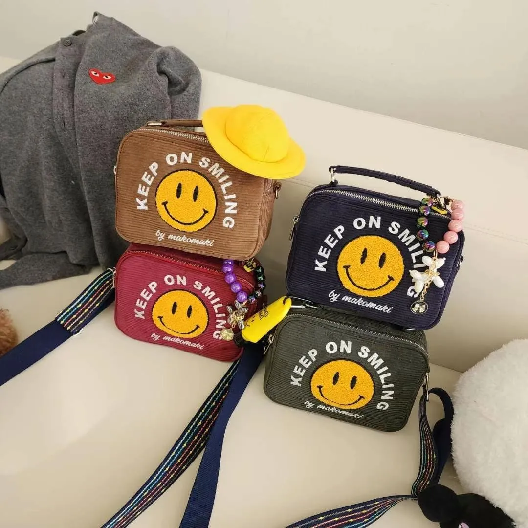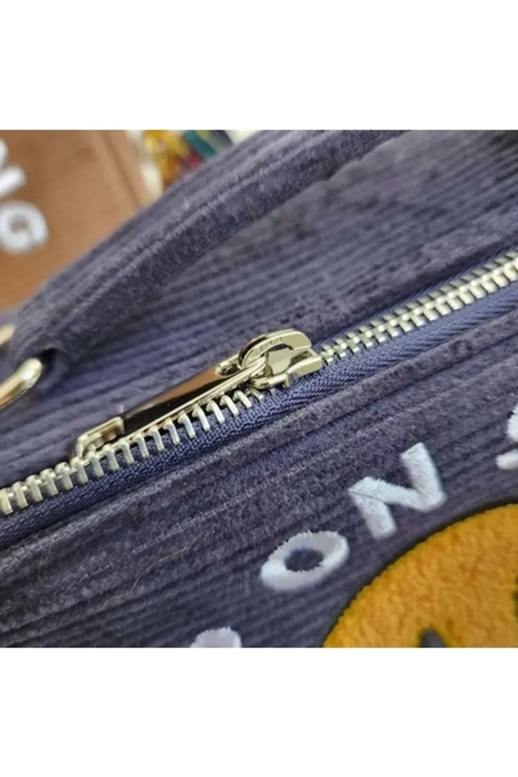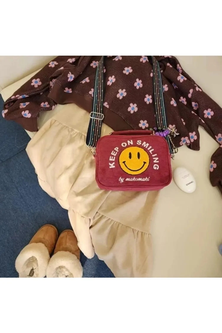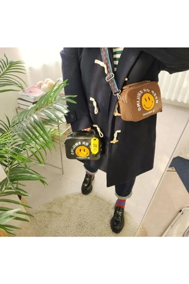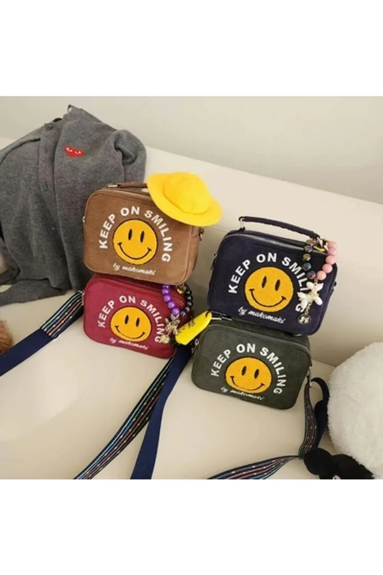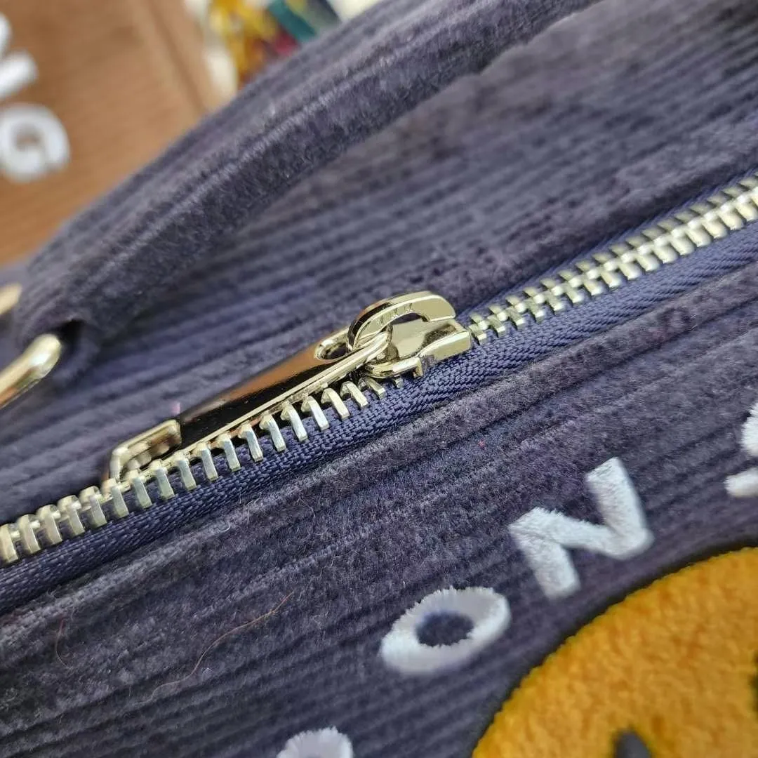 拉鍊封口 有提帶有背帶 可愛毛呢笑臉 刺繡英文 22*16*8公分
