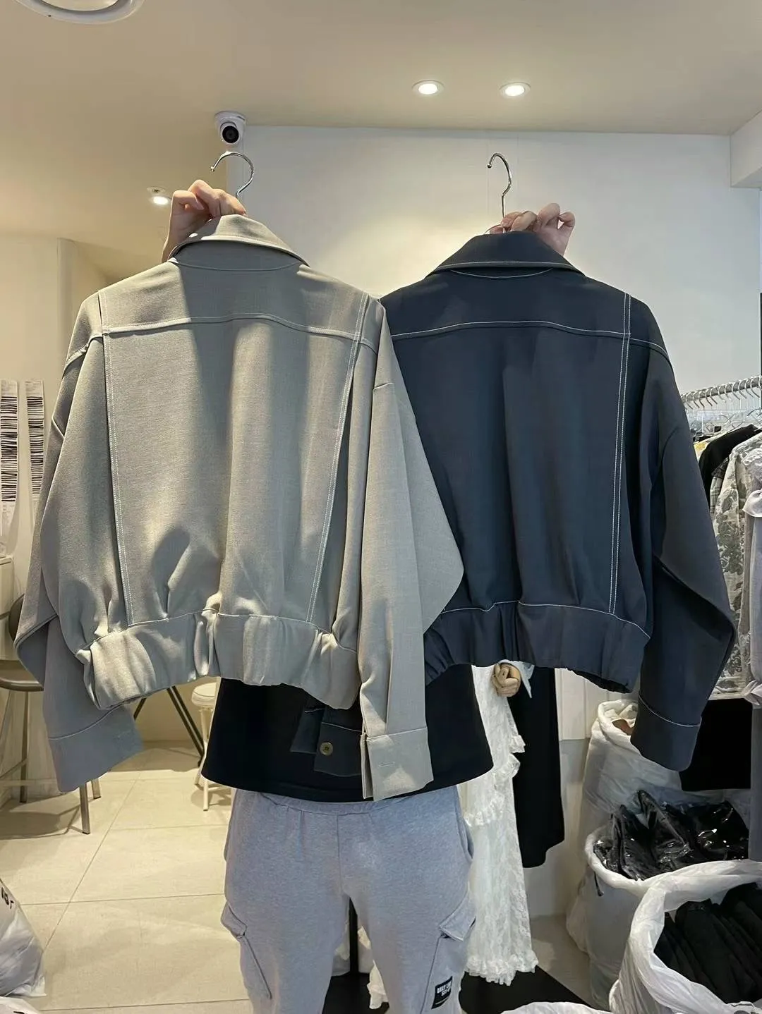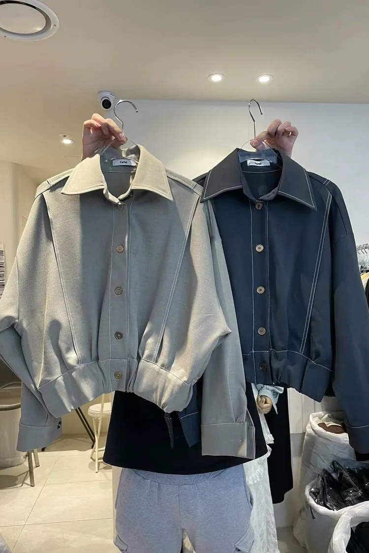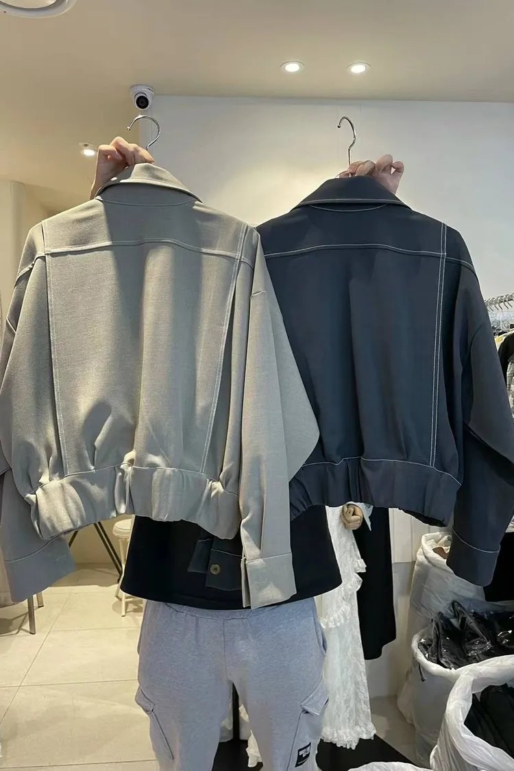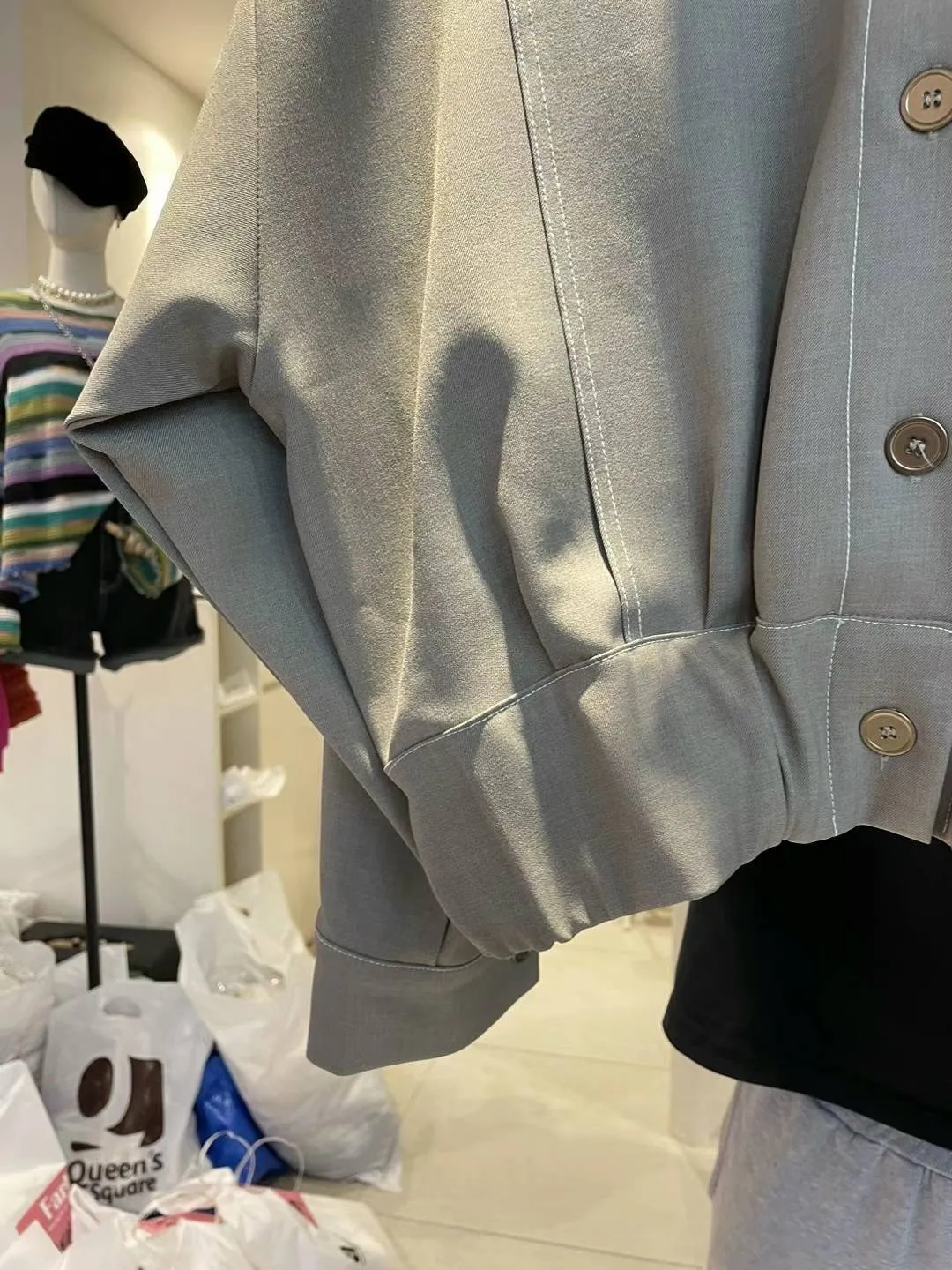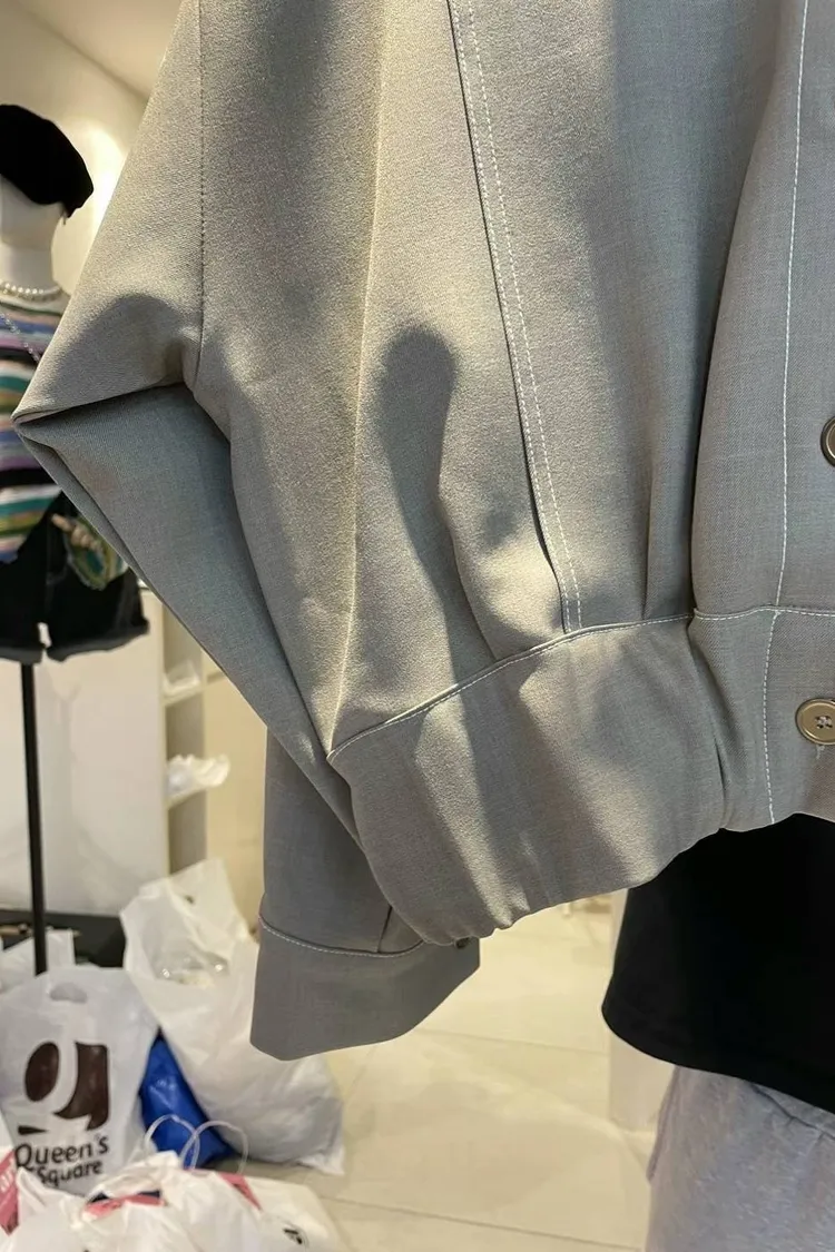 西裝面料 滑順感 立體車線 金屬釦 可上衣可外套 寬腰鬆緊短版比例佳