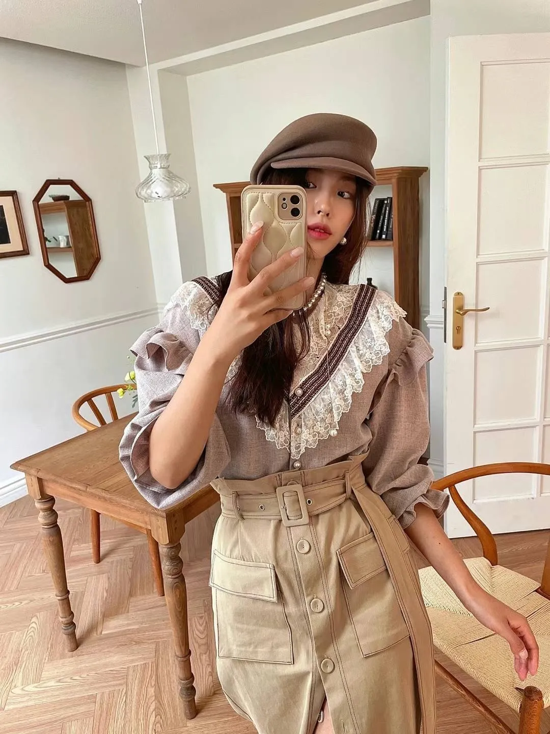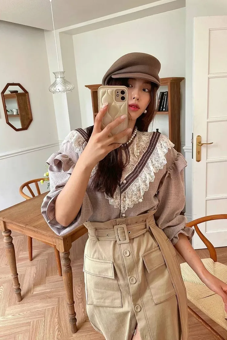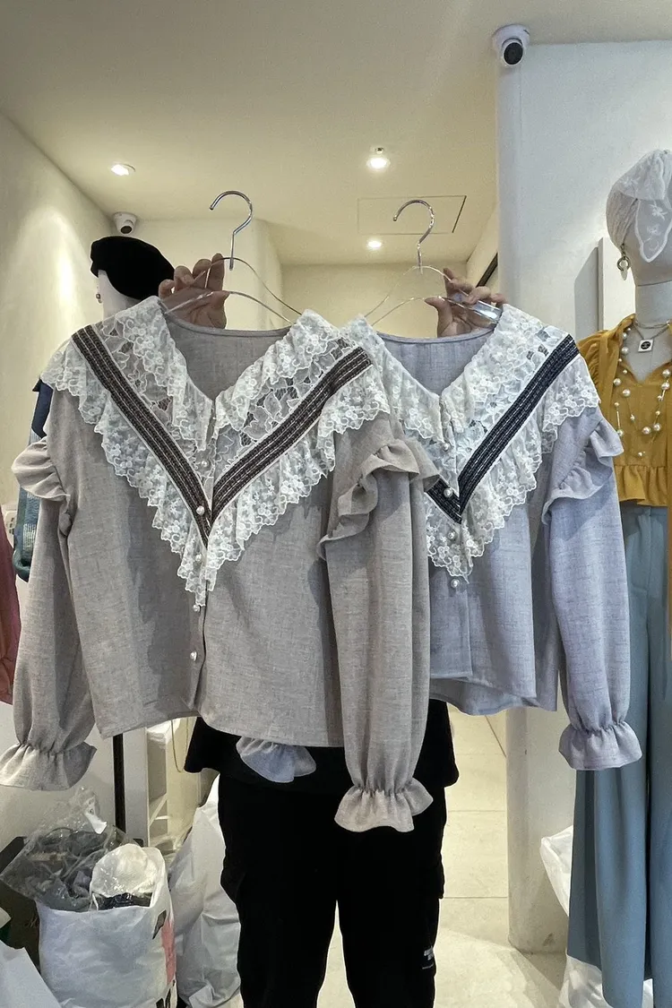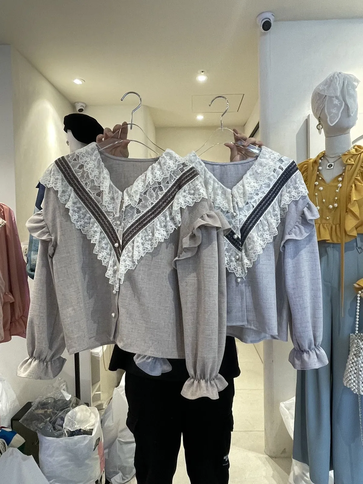 CS1073拼接V領蕾絲溫柔上衣 藍 奶茶 線上價$1190 官網價$1220