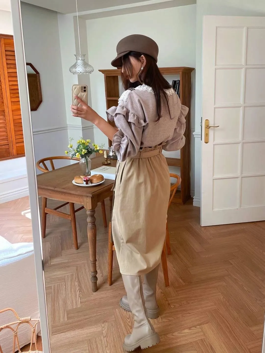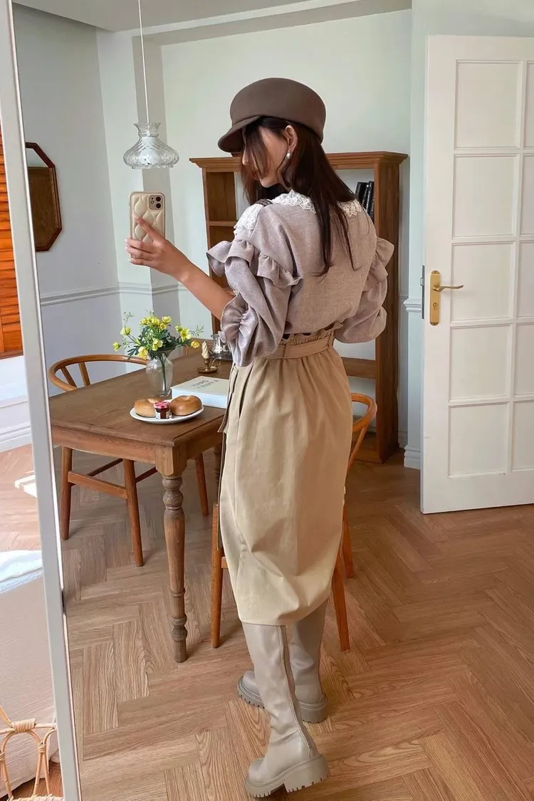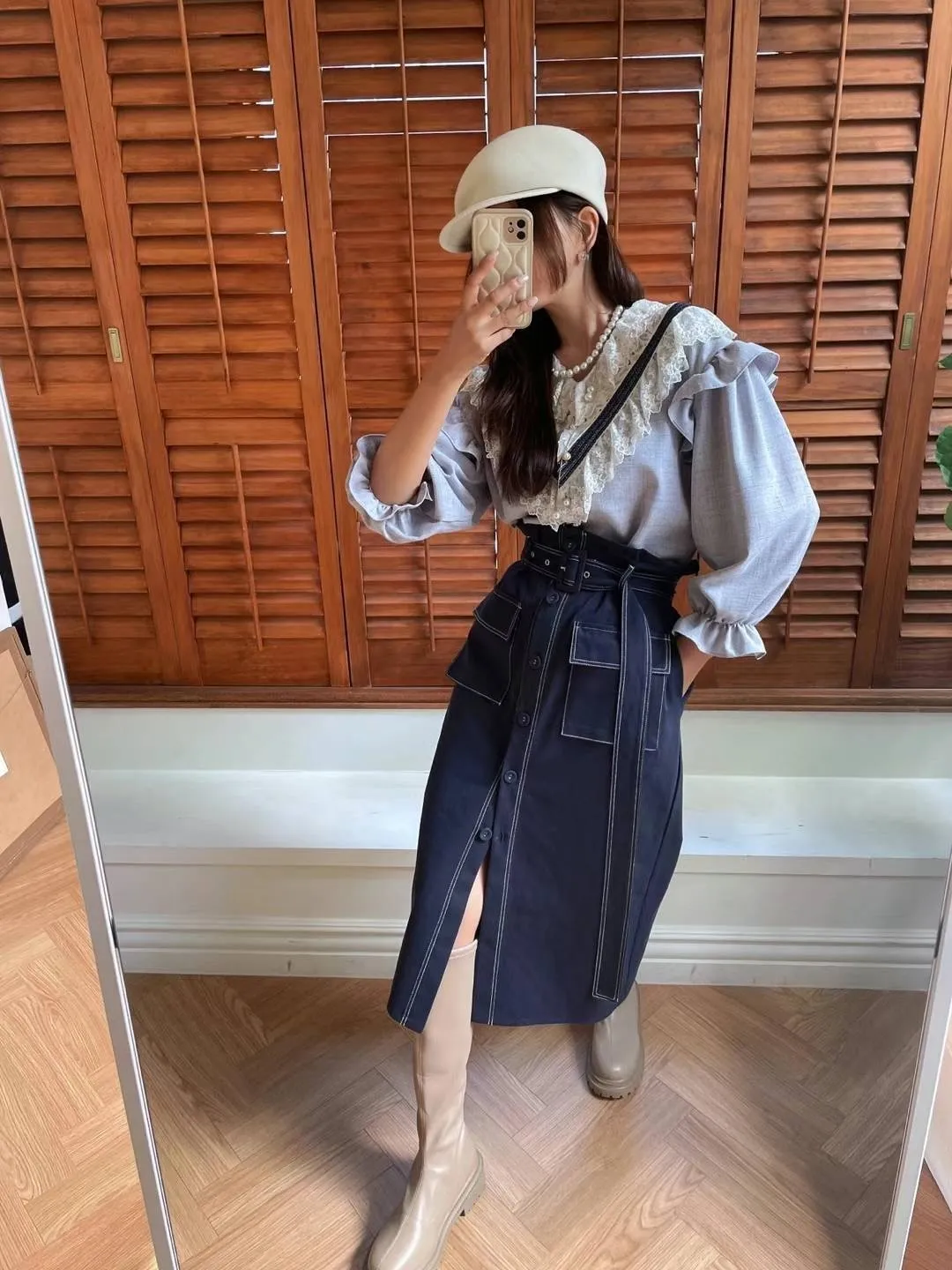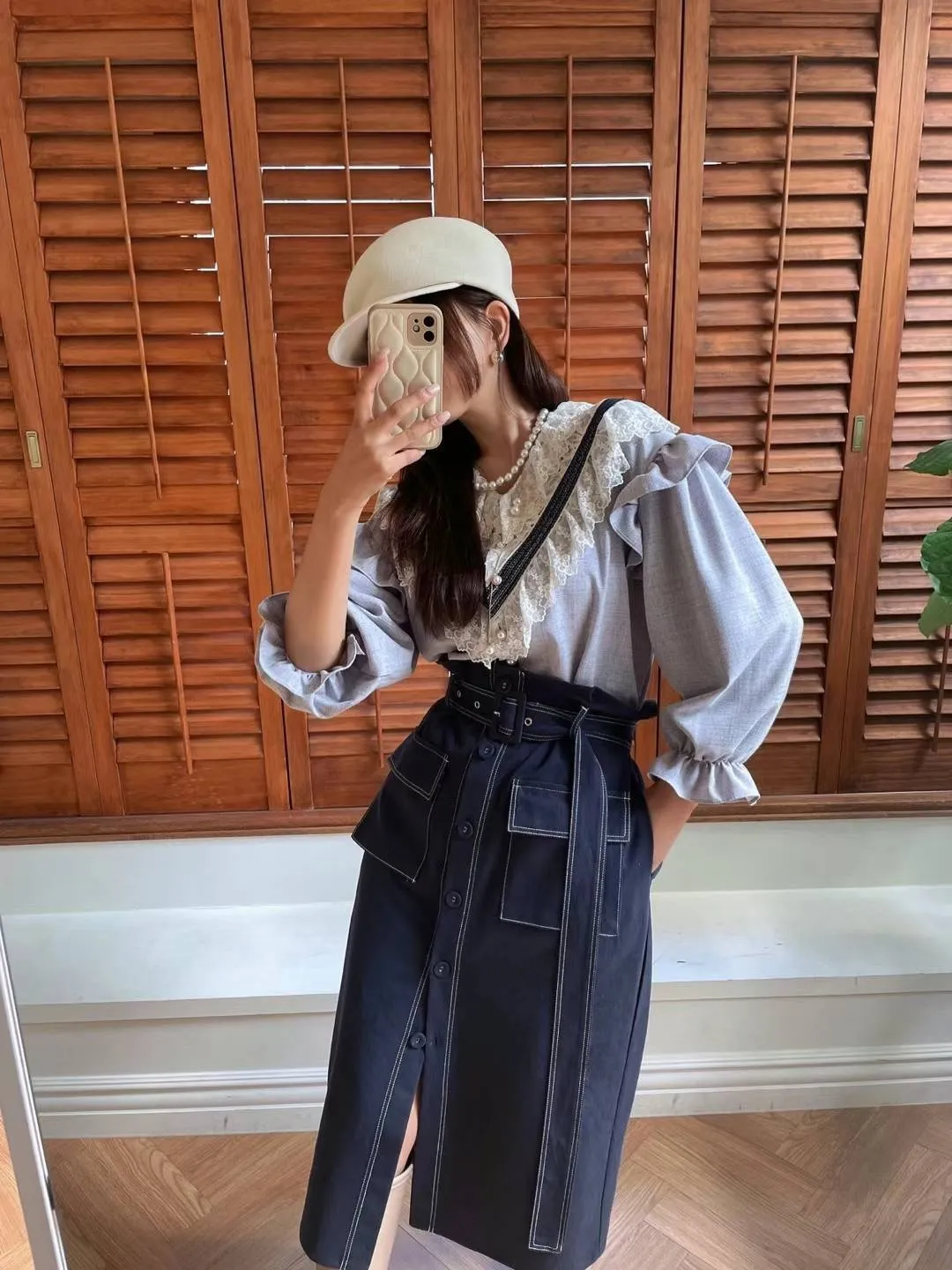 CS1073拼接V領蕾絲溫柔上衣 藍 奶茶 線上價$1190 官網價$1220