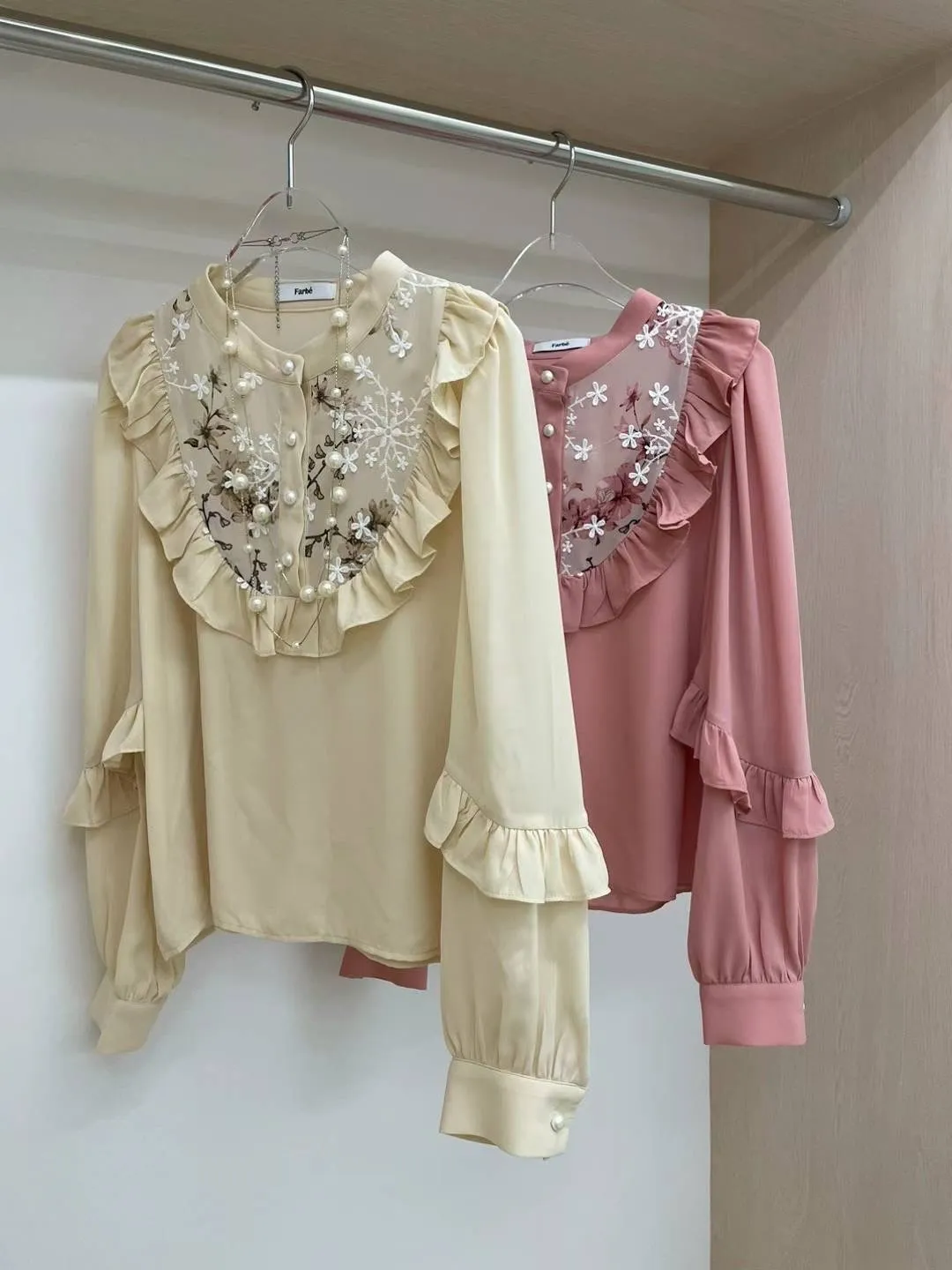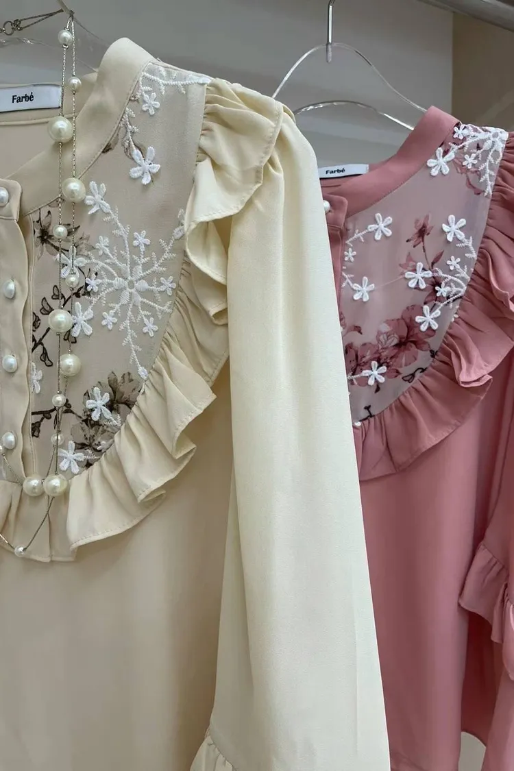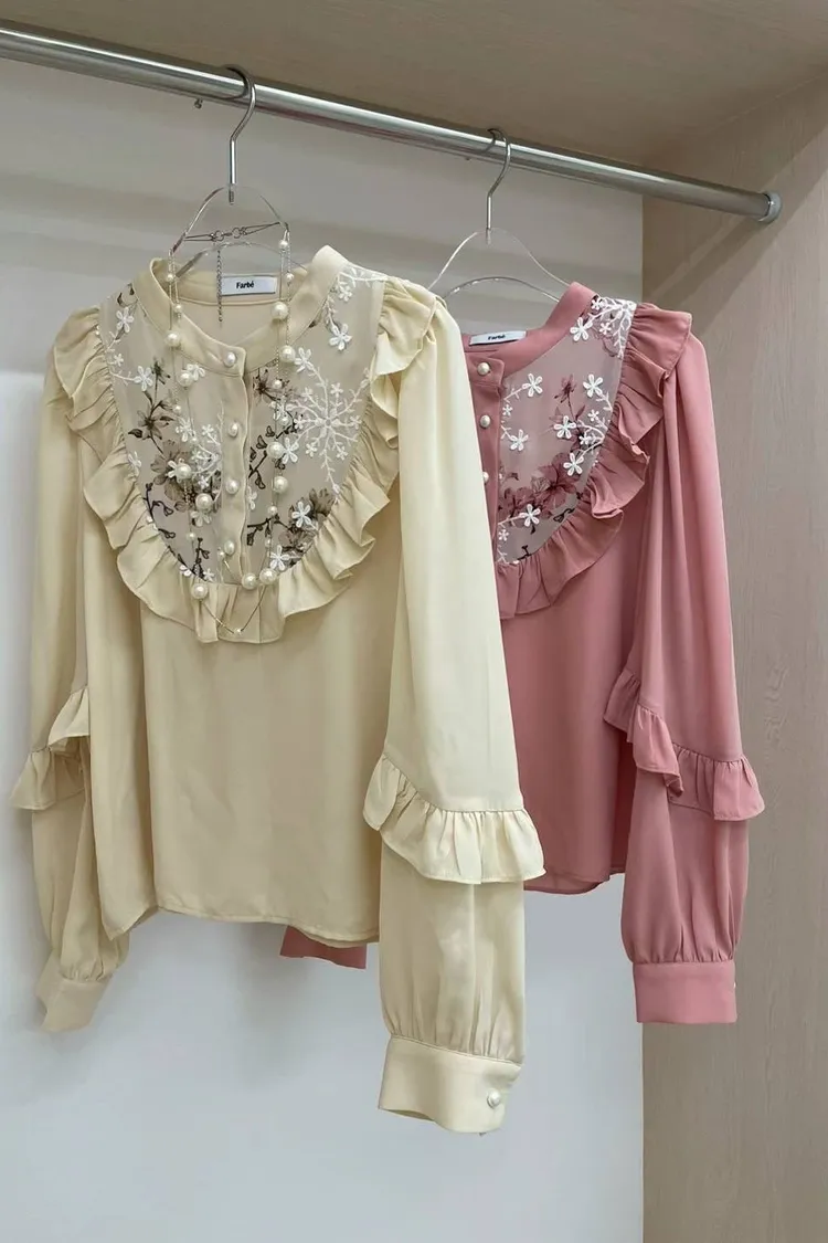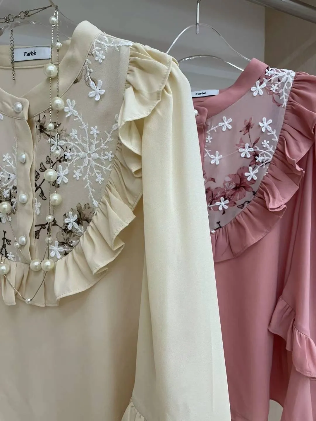 CS1075雪紡超美網紗刺繡小花美領上衣 粉 黃 線上價$1190 官網價$1220