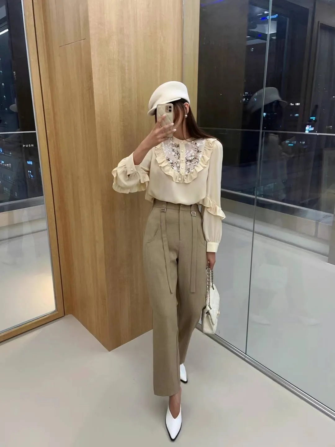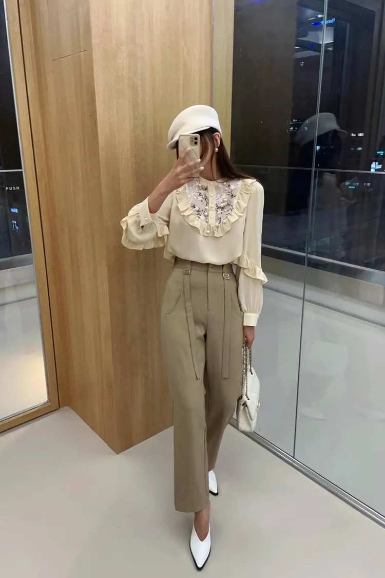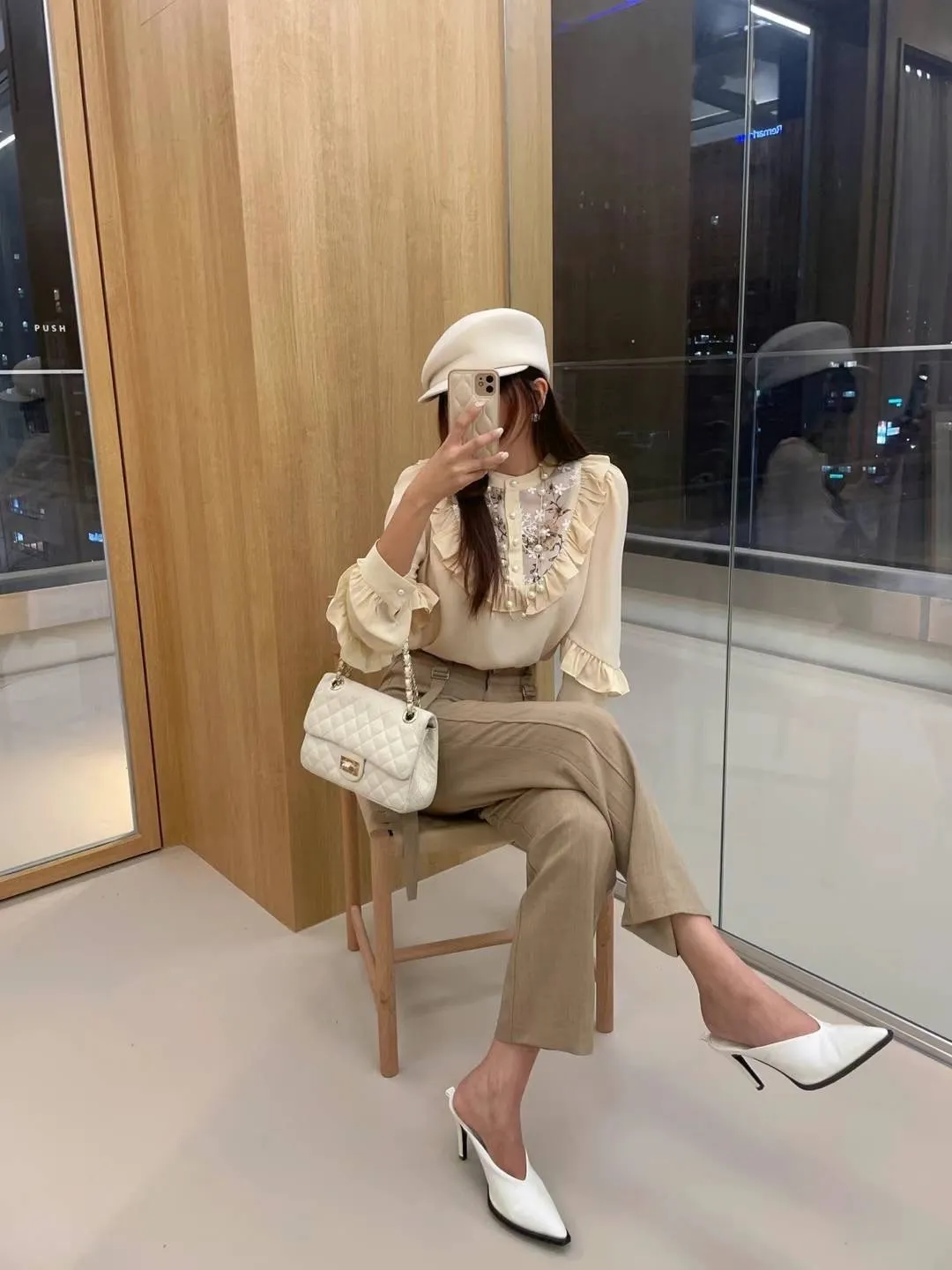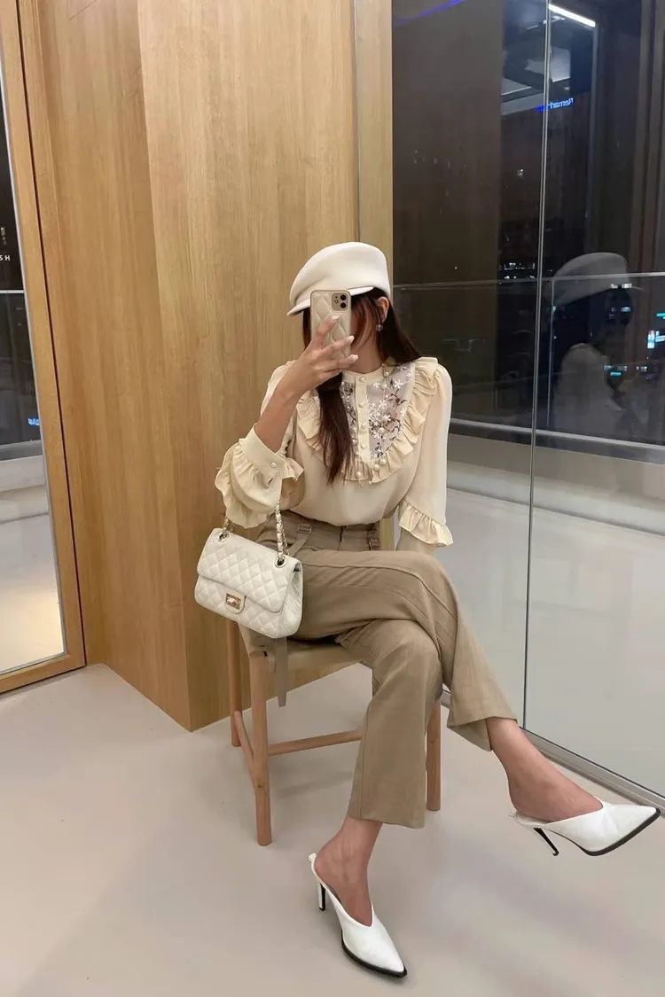 雪紡 薄款夏季雪紡 舒適親膚 精緻棉蕾絲網紗 背後與手袖皆荷葉設計 袖口有釦