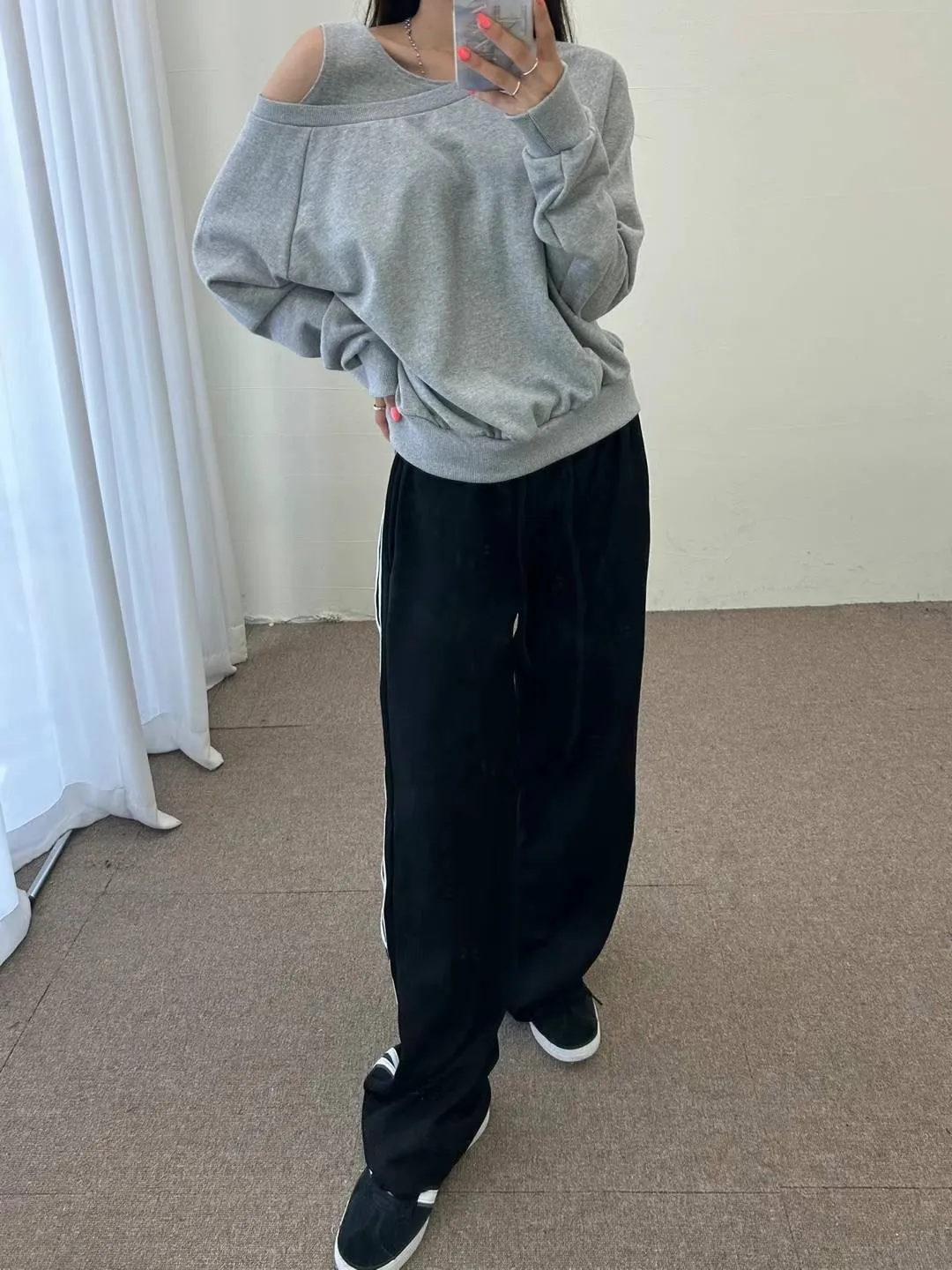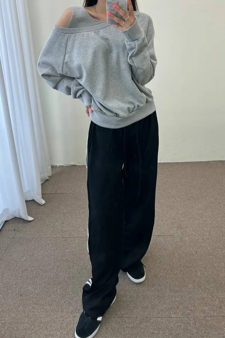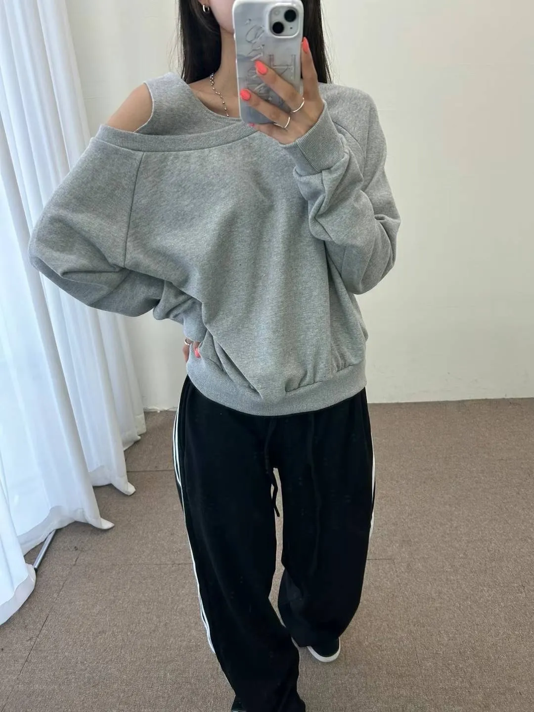 CS1084不對稱小露肩設計款大學T 白 灰 黑 線上價$469 官網價$499
