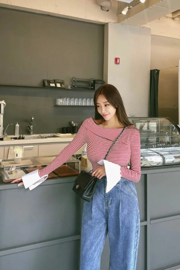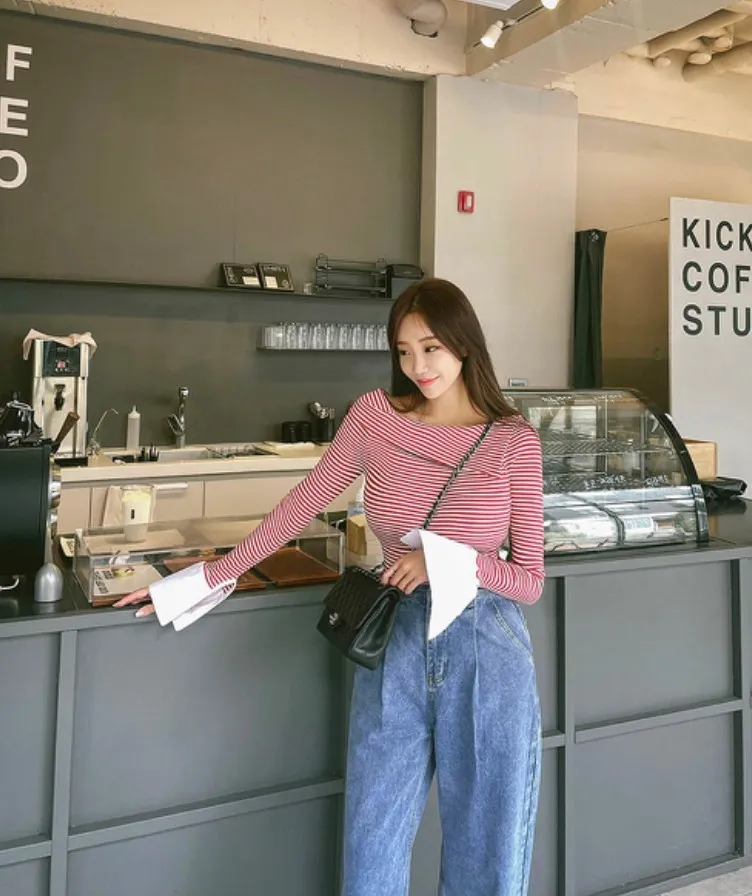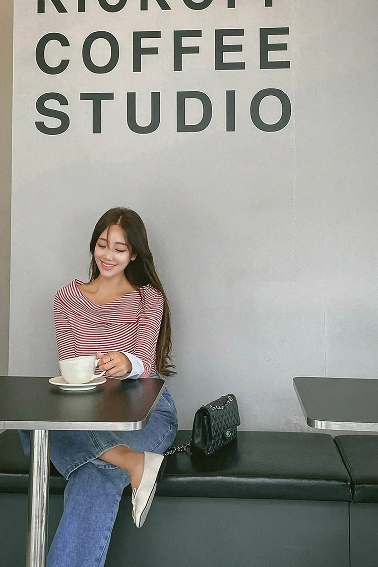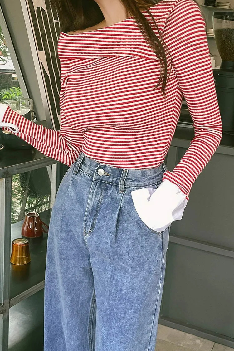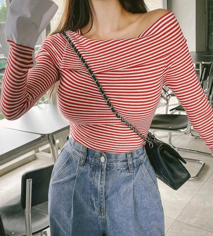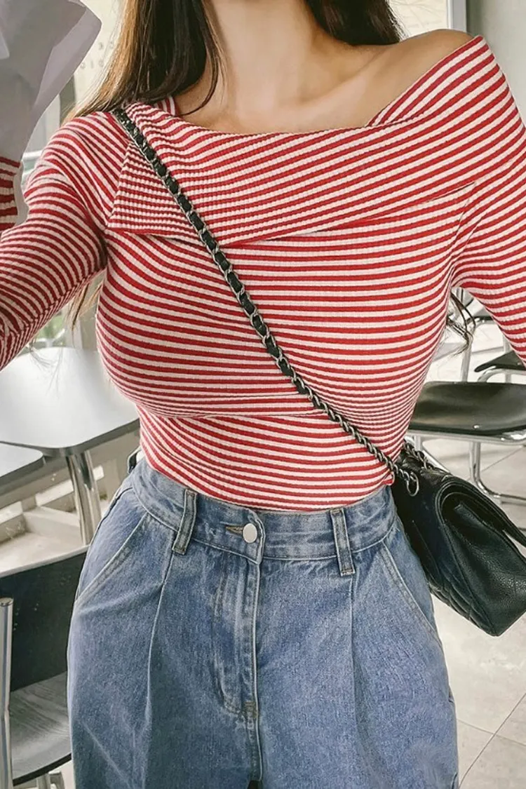 CS1094一字翻領條紋好身材上衣 紅 黑 線上價$530 官網價$560
