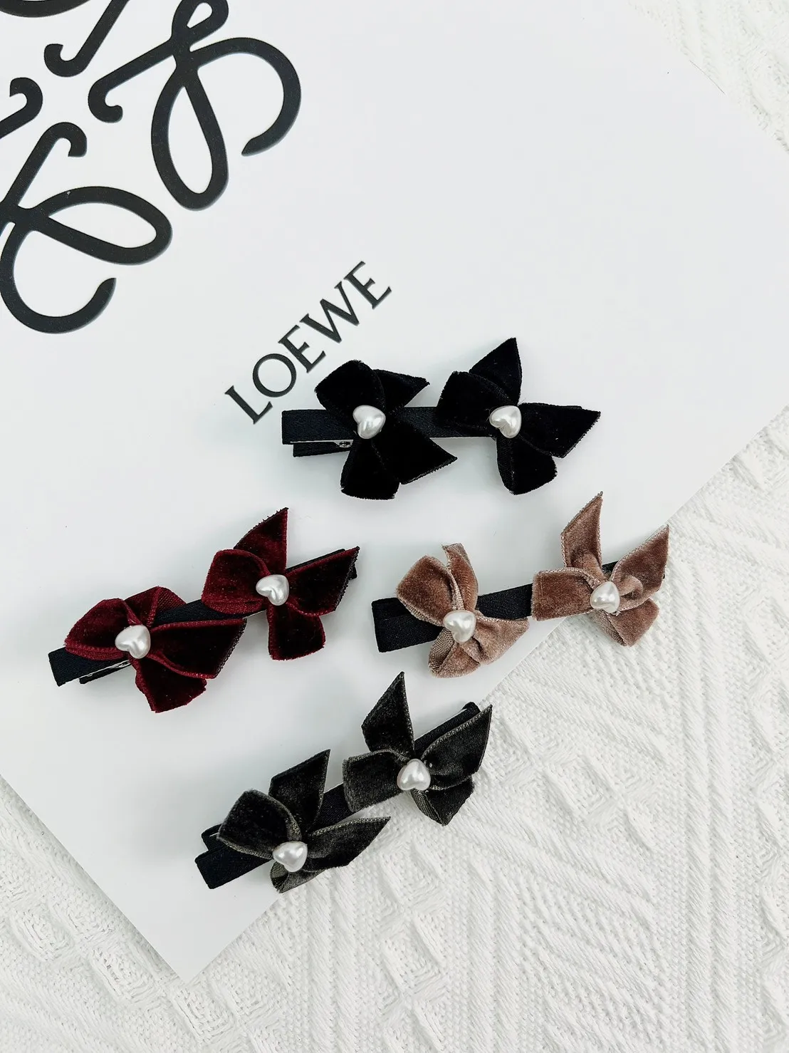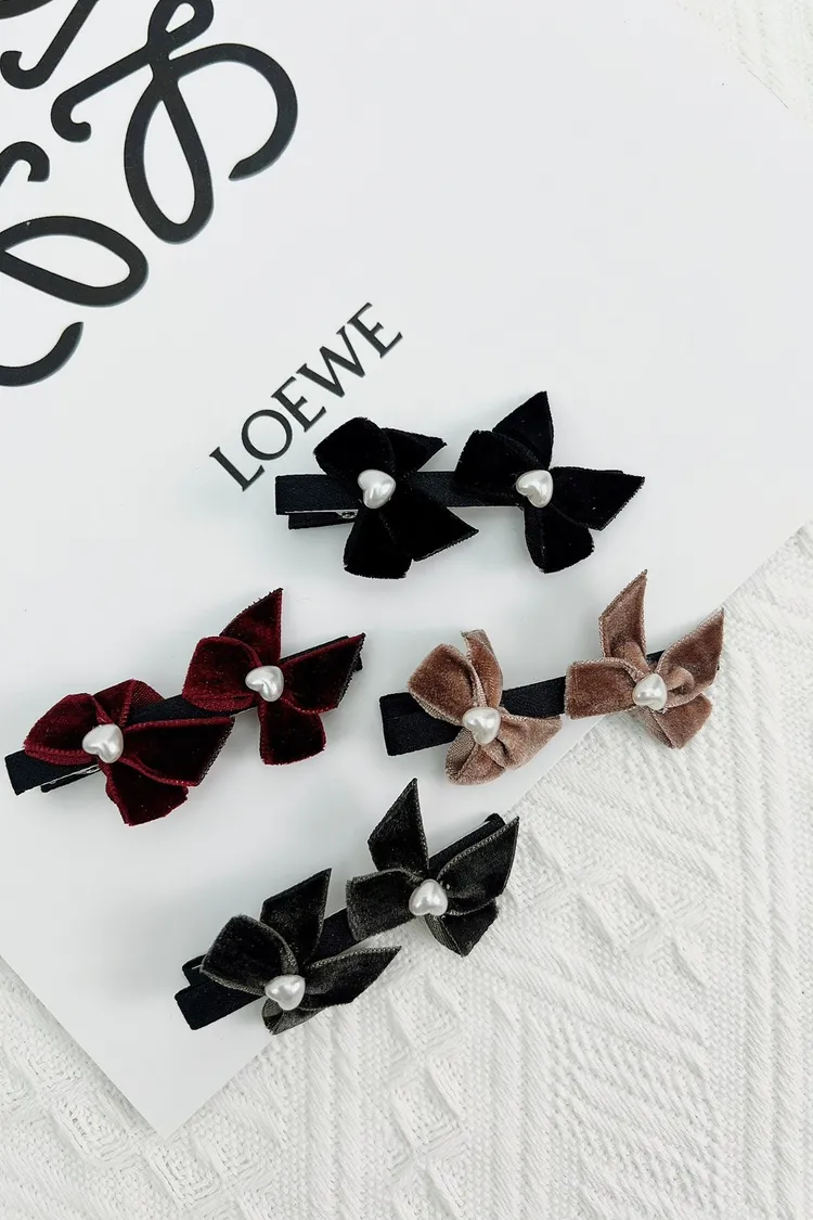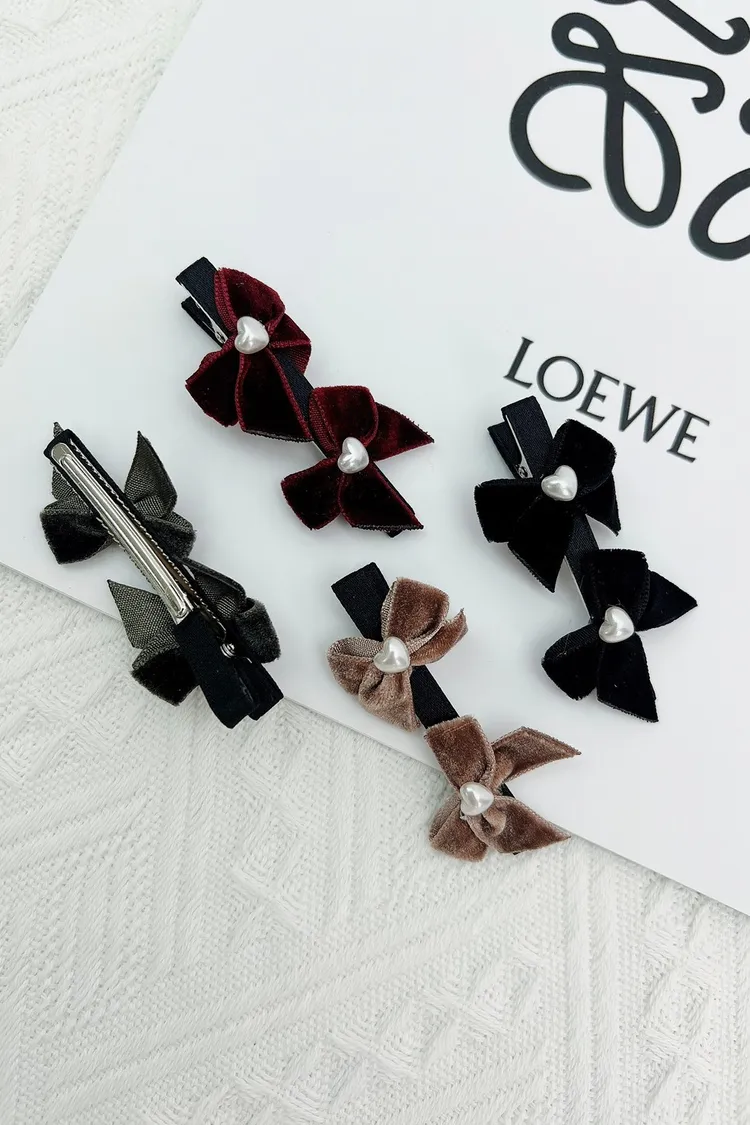 CS218絨面緞帶愛心珍珠髮夾 綠 咖 紅 黑 $99