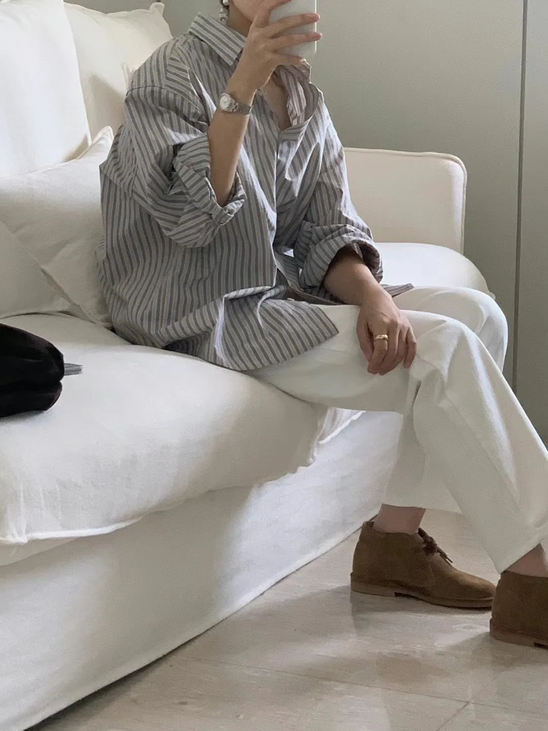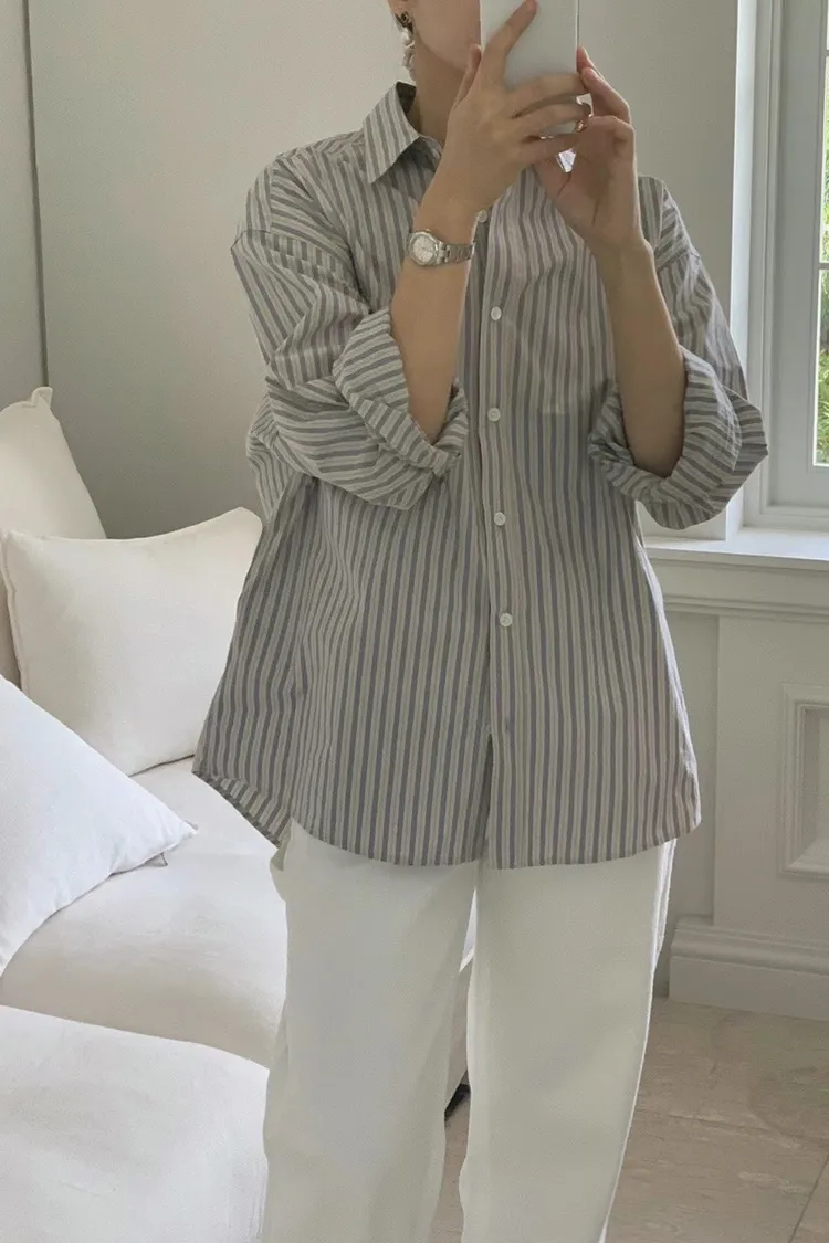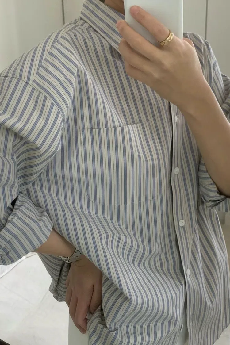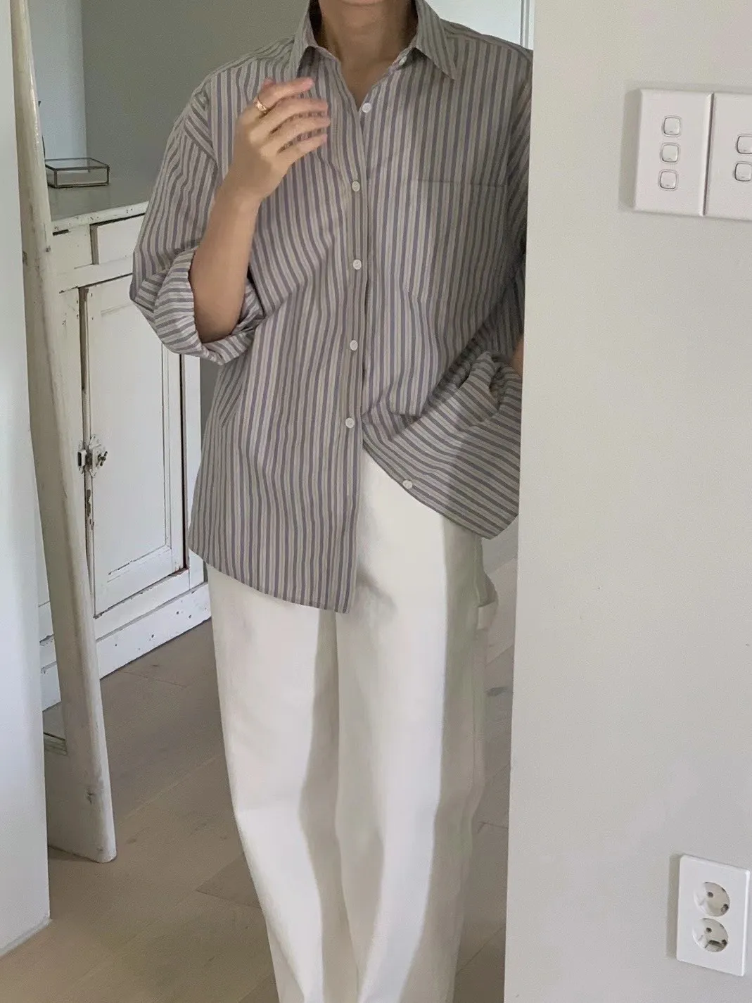 CS314復古直條紋單口袋灰藍色長袖襯衫 線上價$1960 官網價$1990