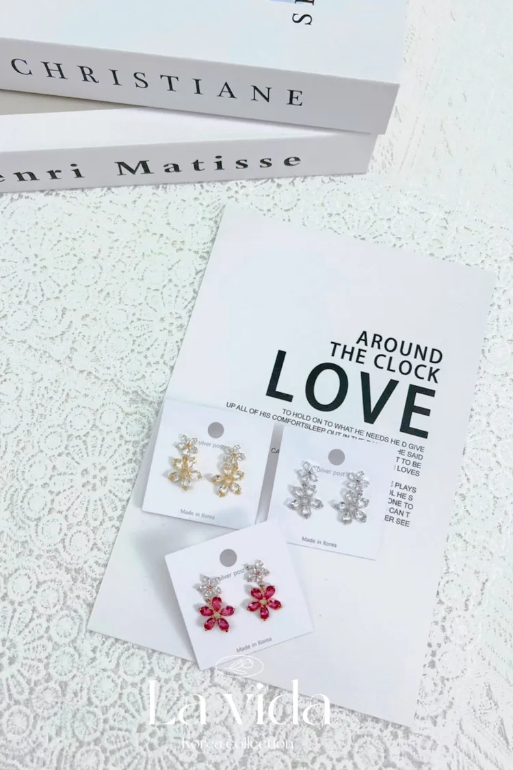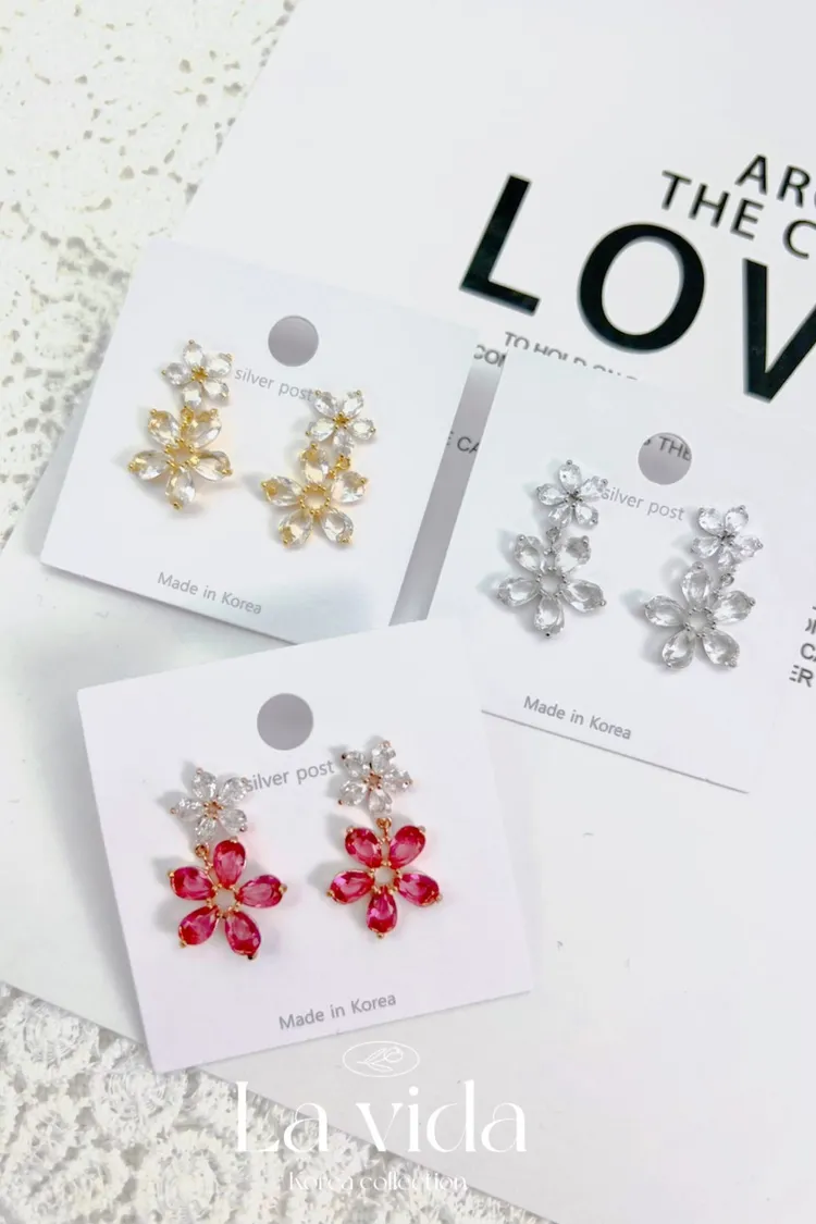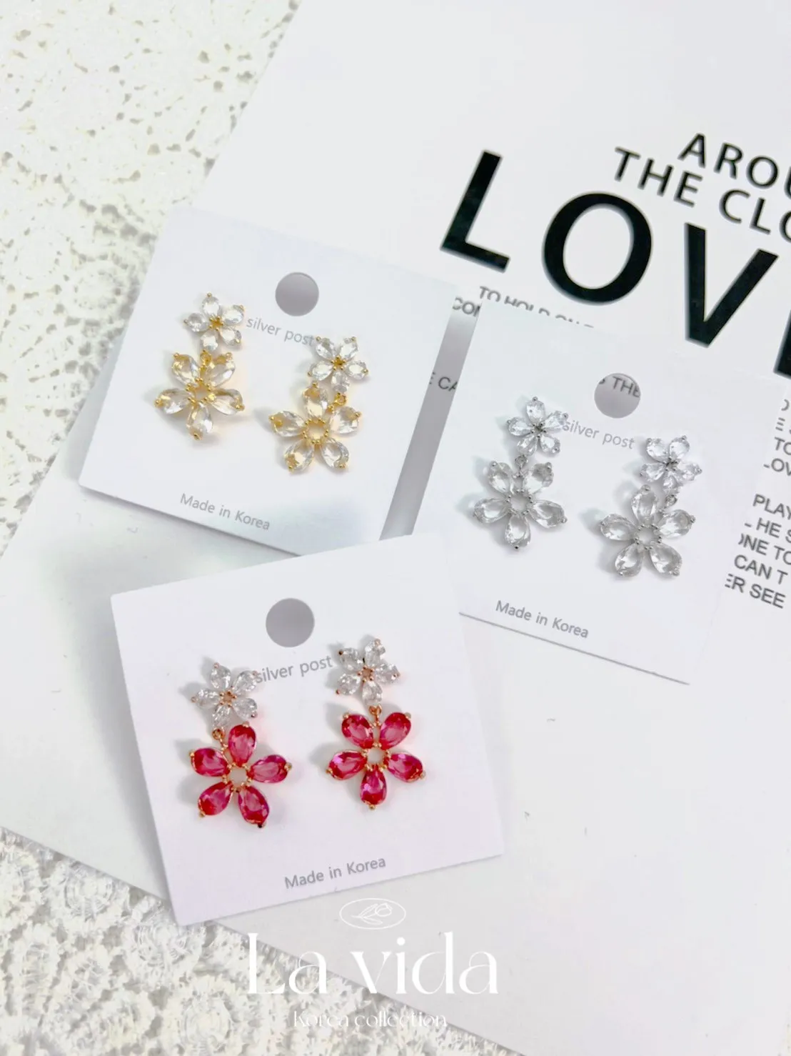 CS374鋯石雙鑽花搖曳耳環 金 銀 粉 耳針$235 耳夾(矽膠夾)$255