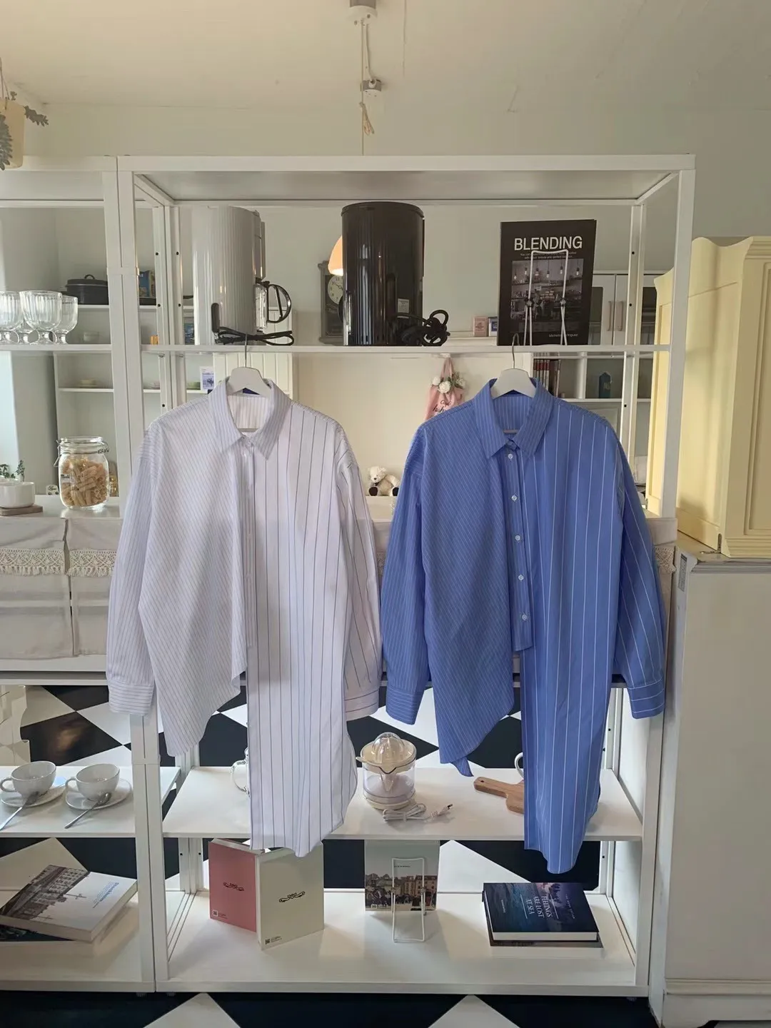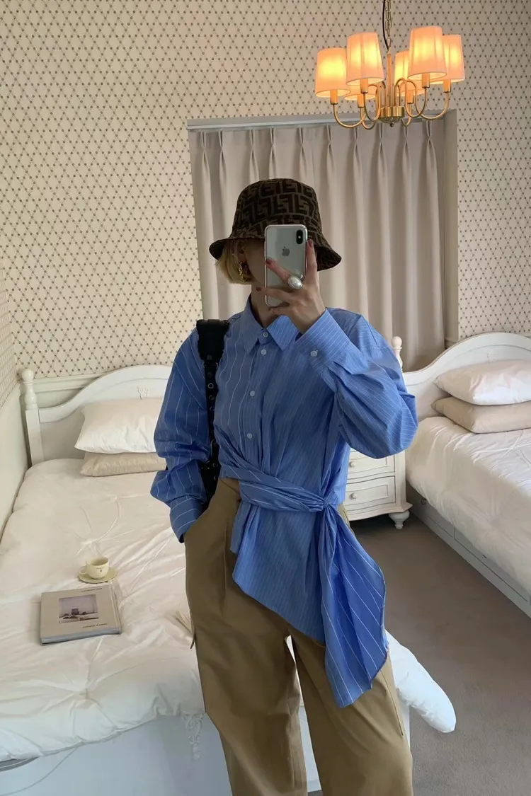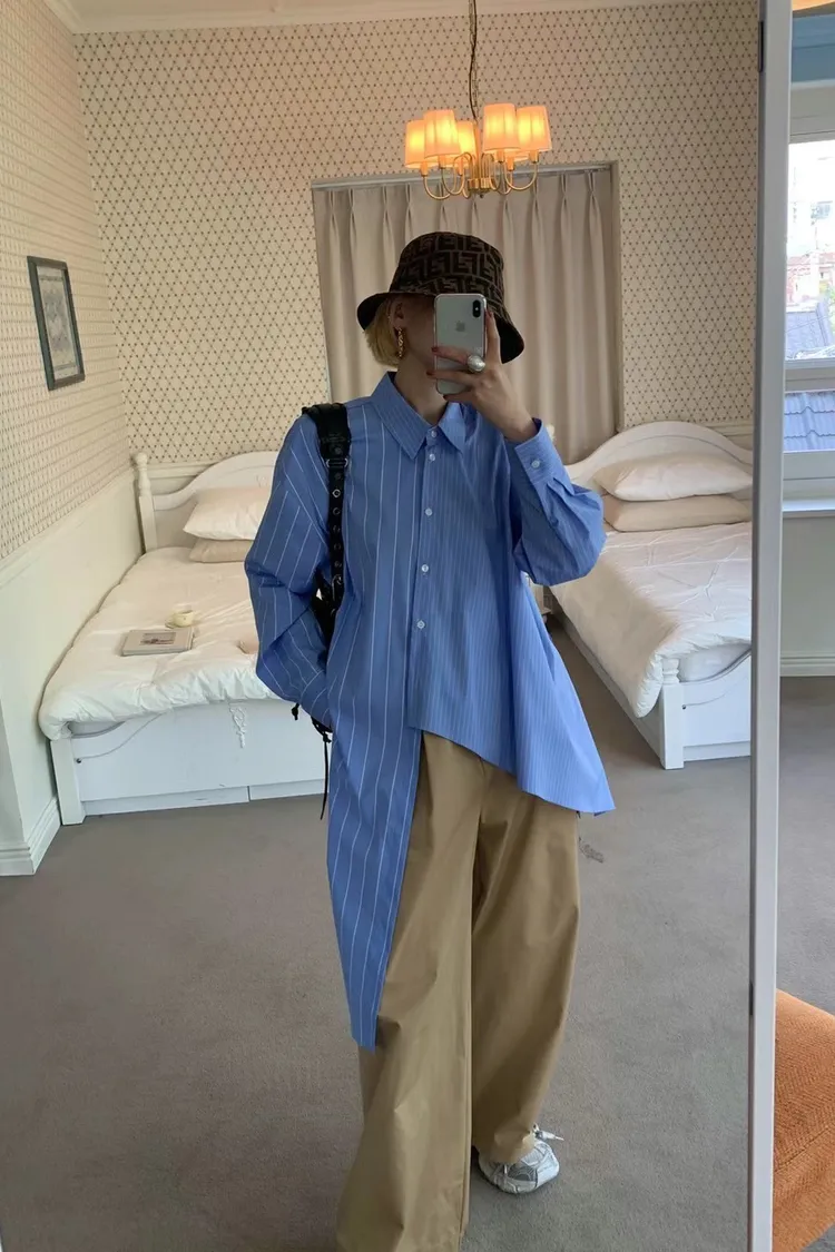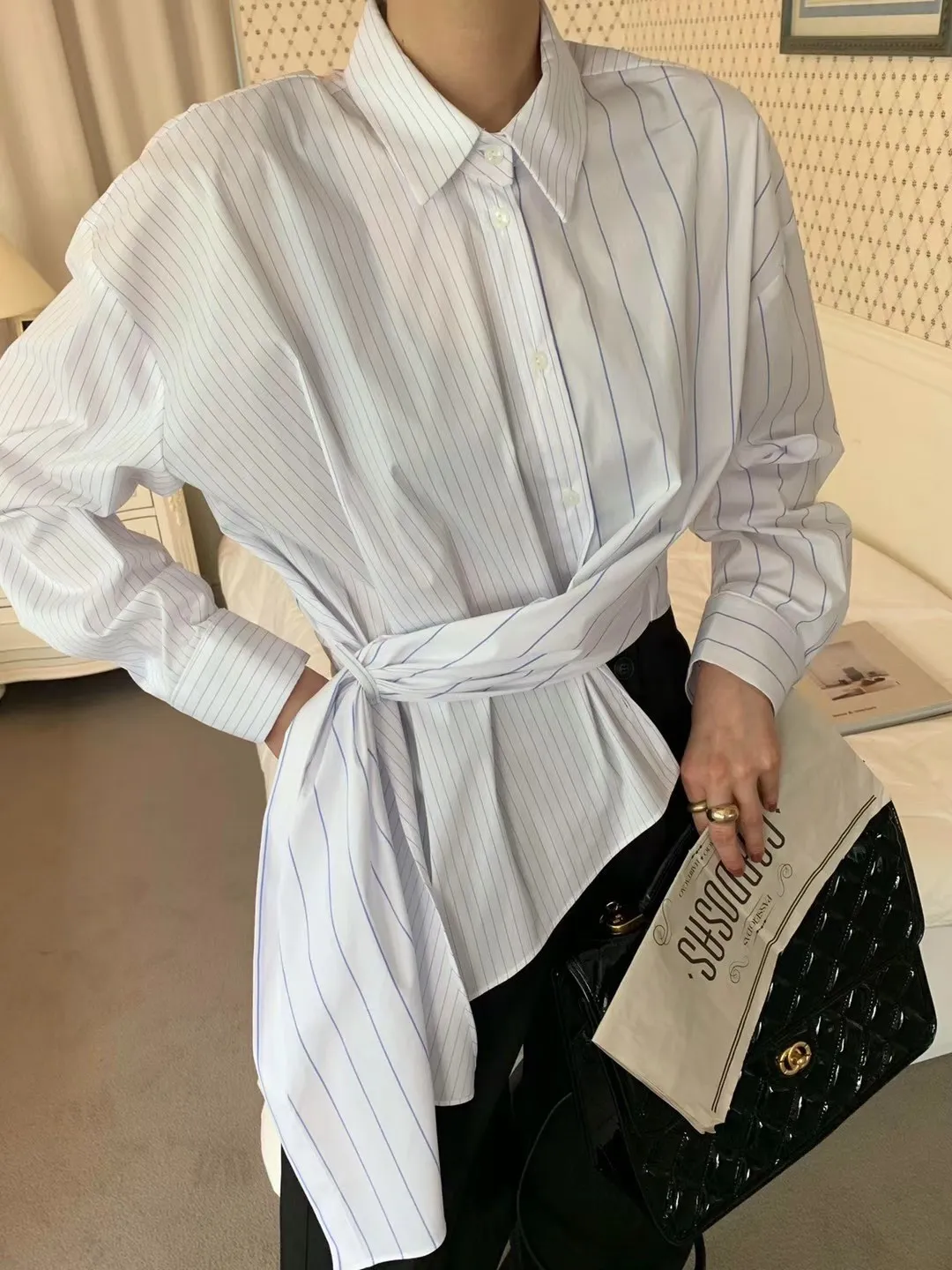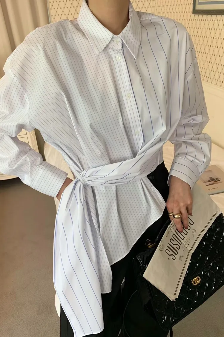 CS447設計藝術感拚接不對稱下擺襯衫 白 藍 線上價$1290 官網價$1320