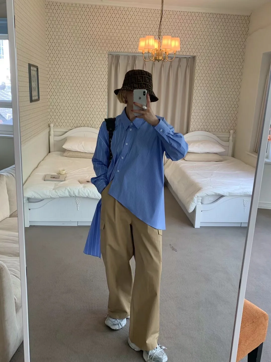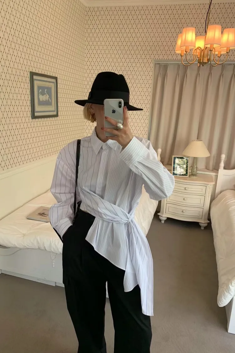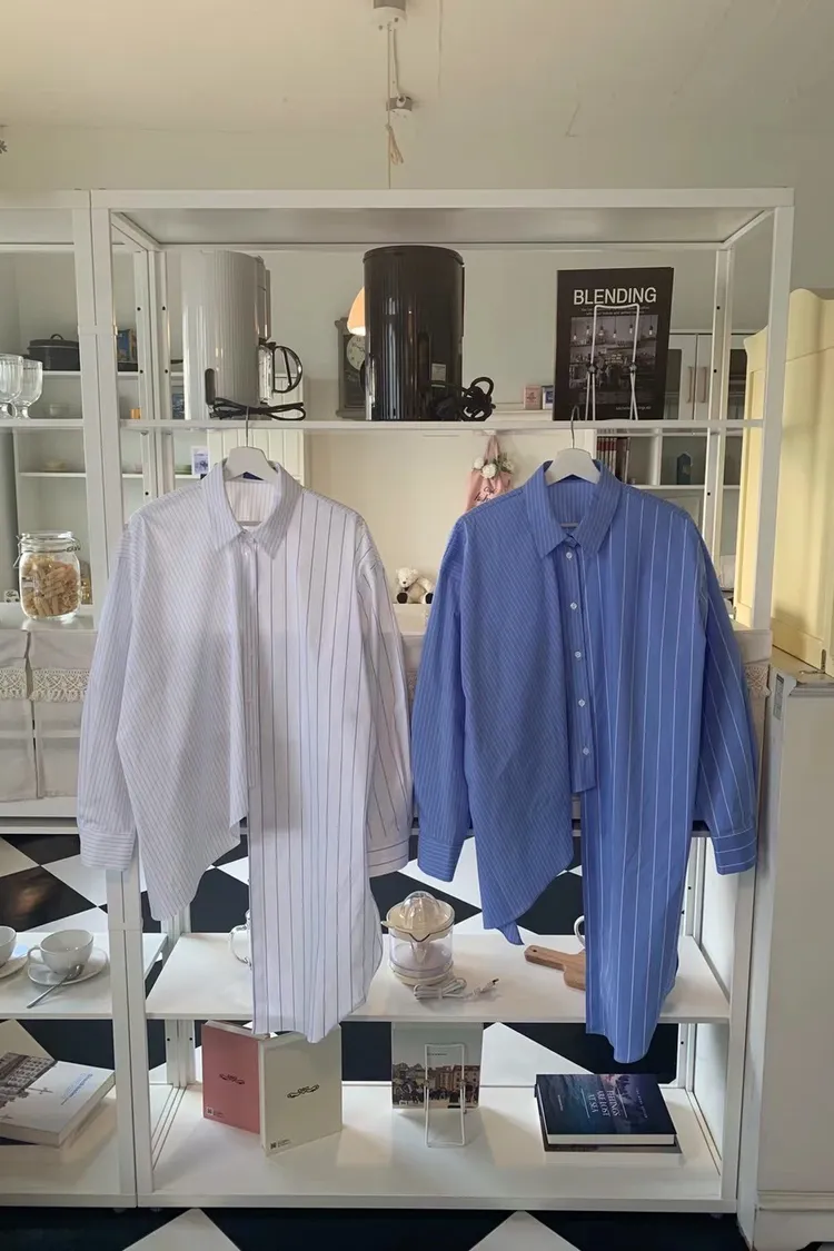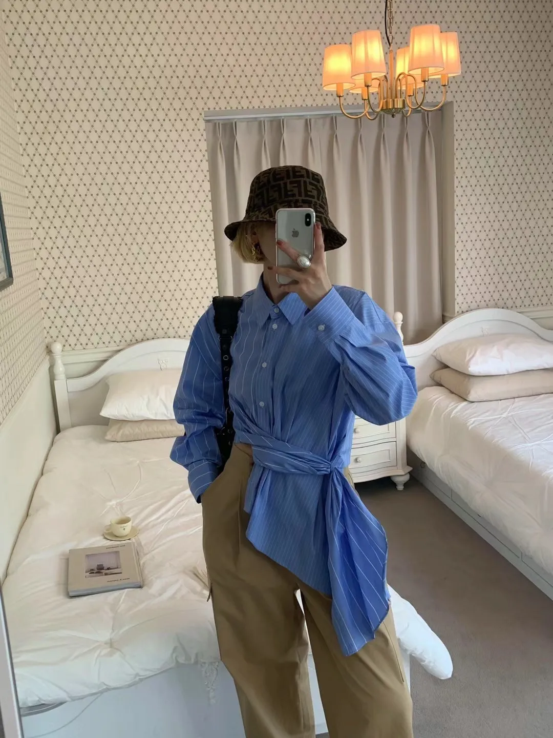 CS447設計藝術感拚接不對稱下擺襯衫 白 藍 線上價$1290 官網價$1320