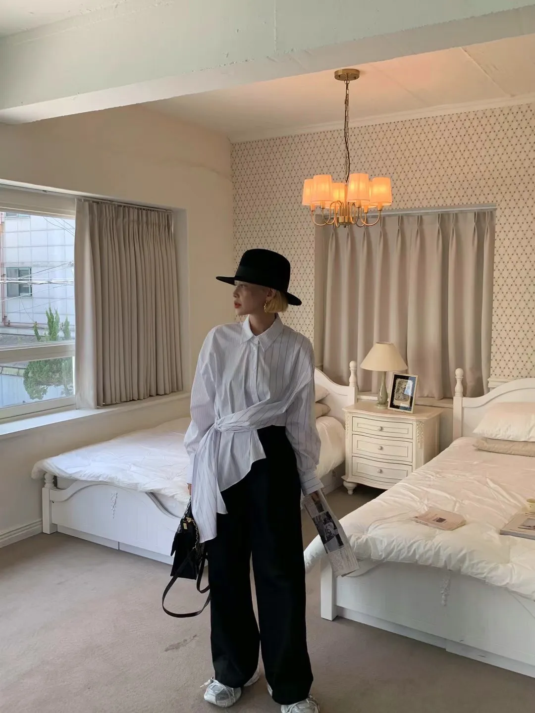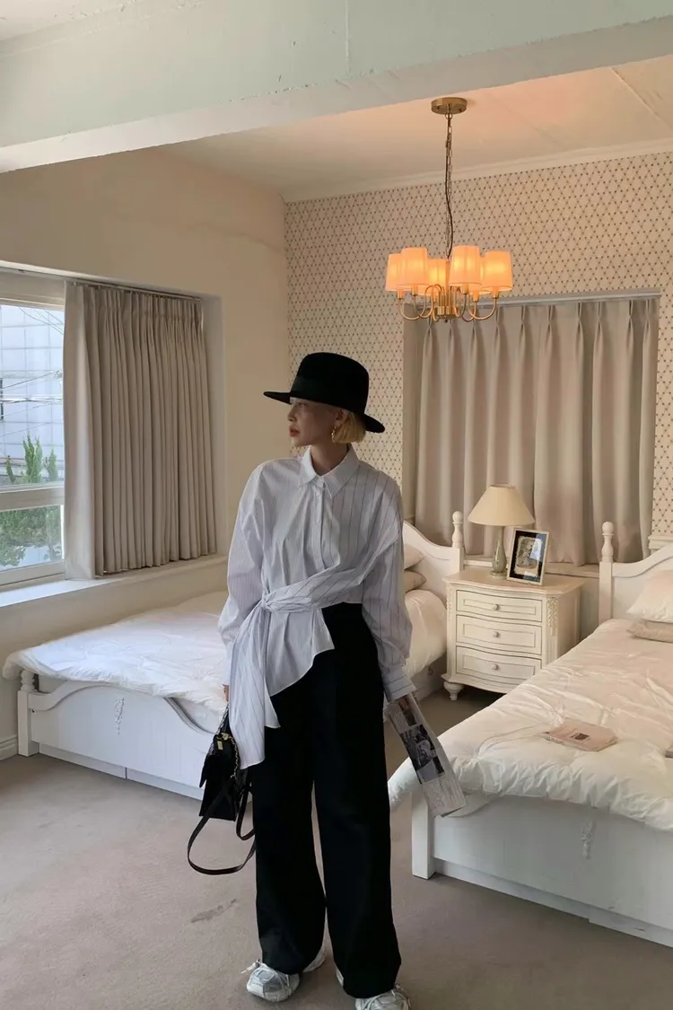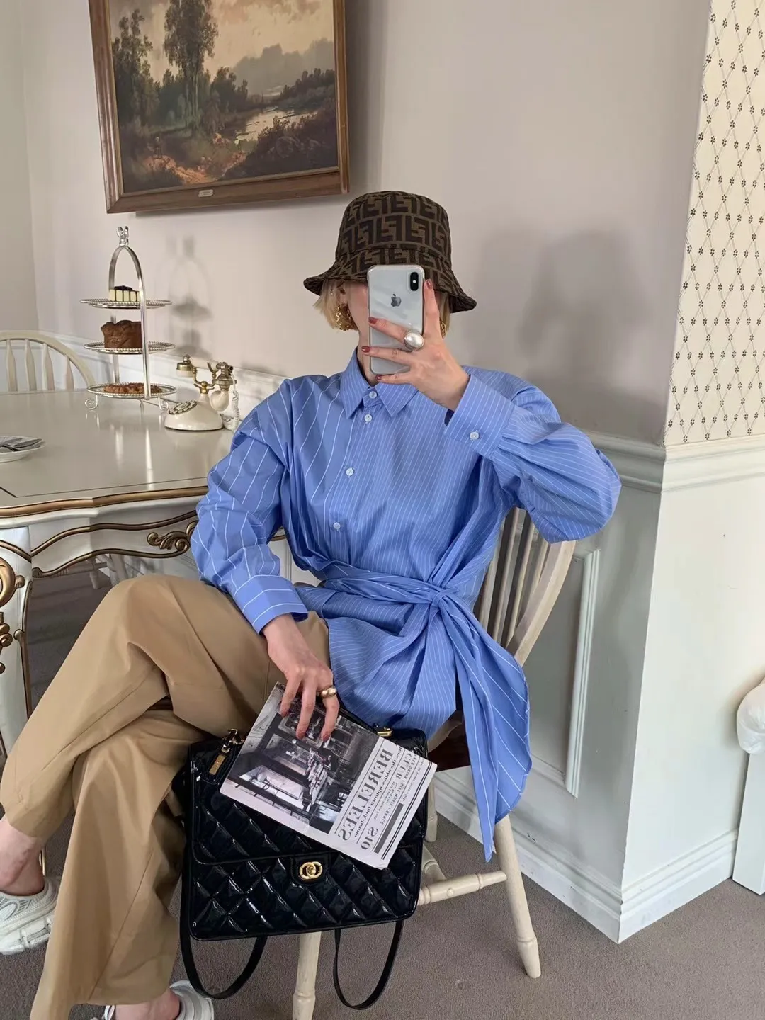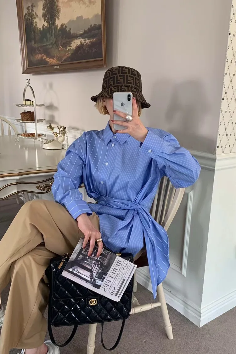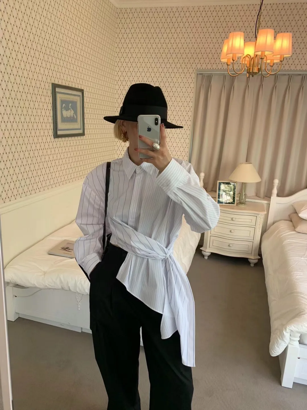 CS447設計藝術感拚接不對稱下擺襯衫 白 藍 線上價$1290 官網價$1320