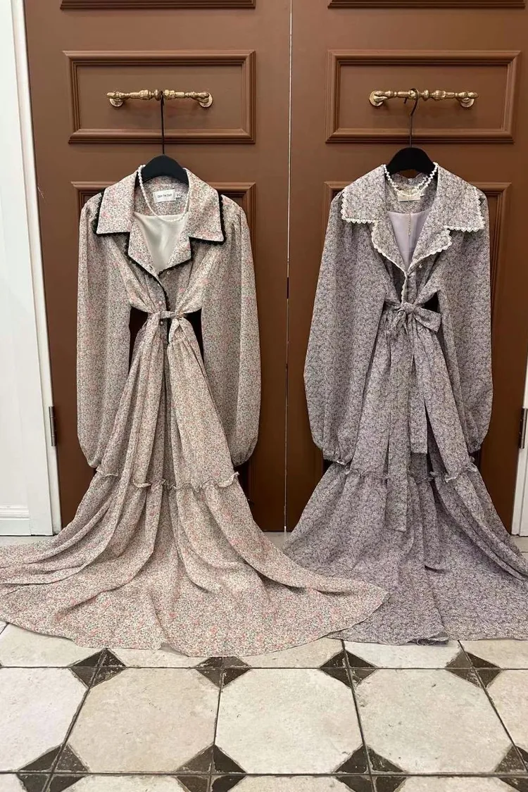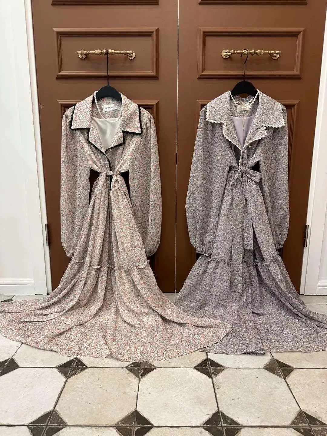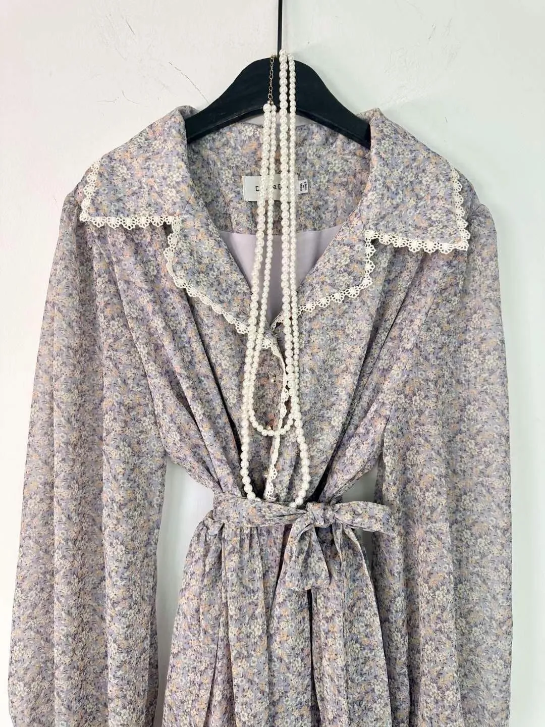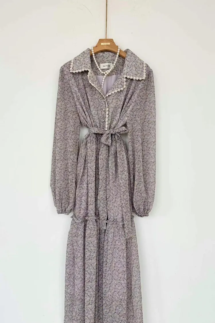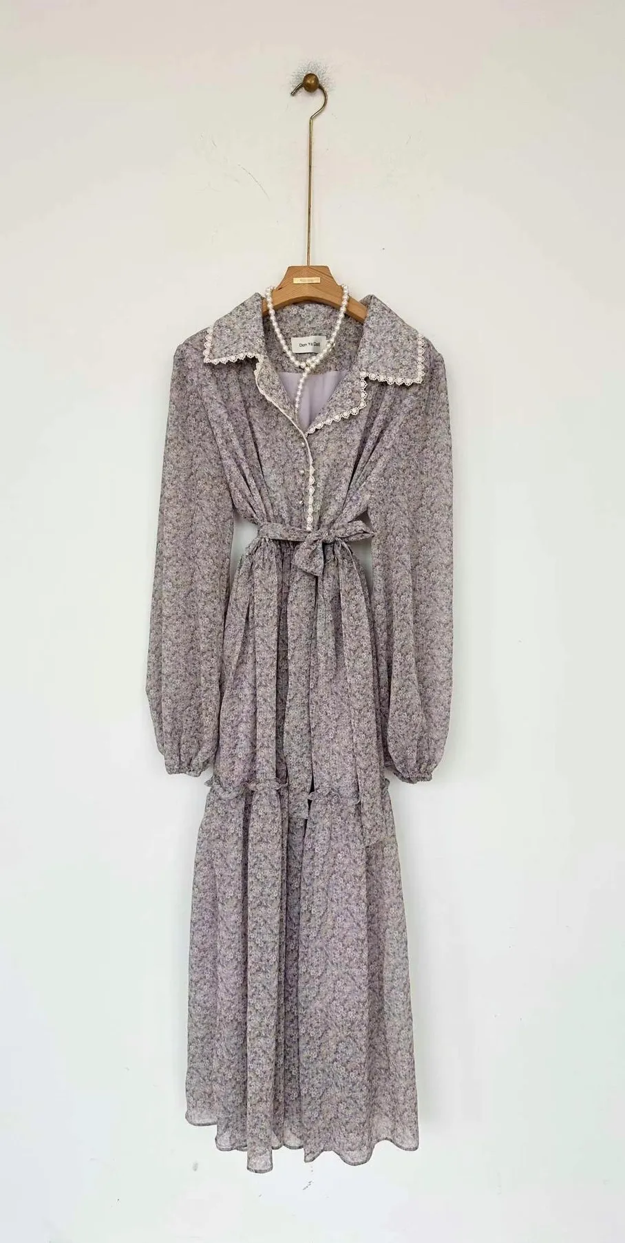 CS491精緻美領蕾絲滾邊碎花洋裝 米 紫 線上價$1790 官網價$1820