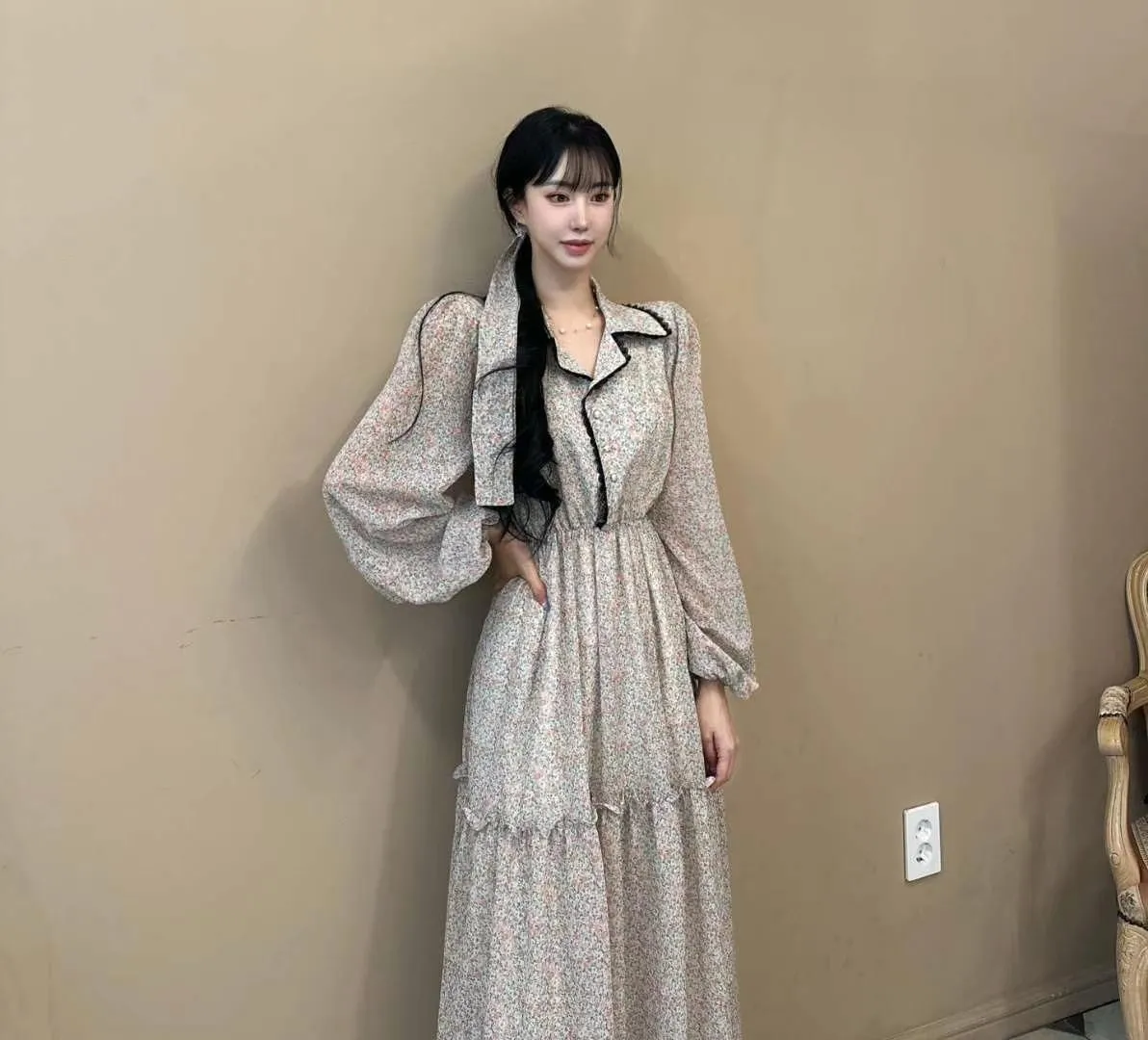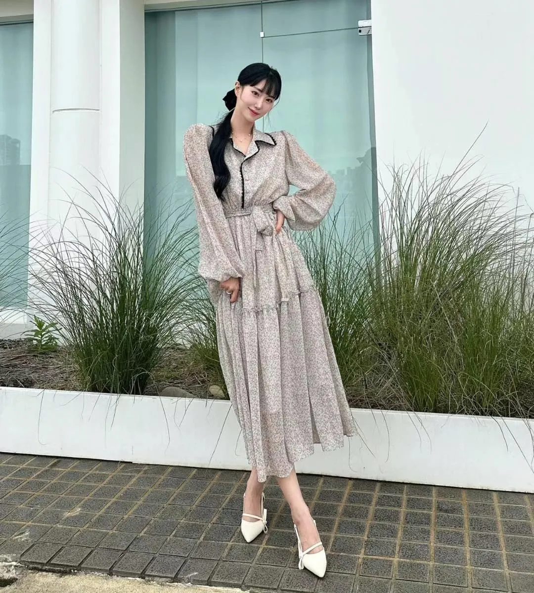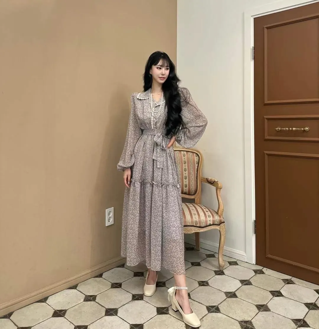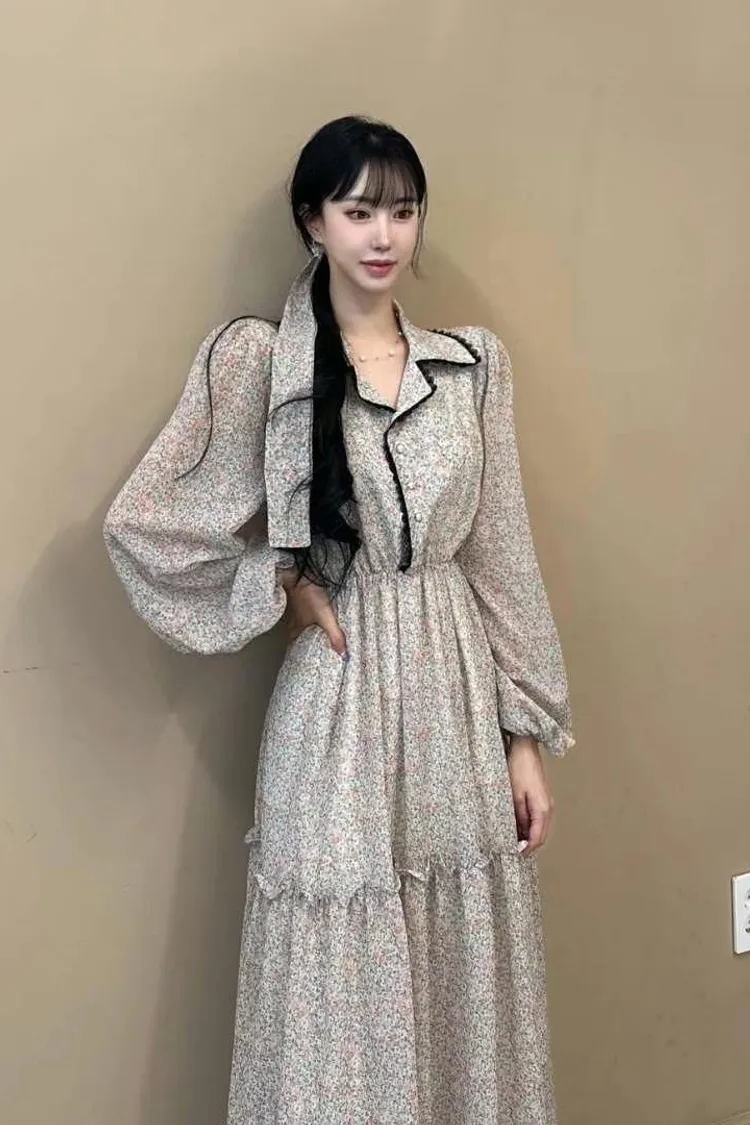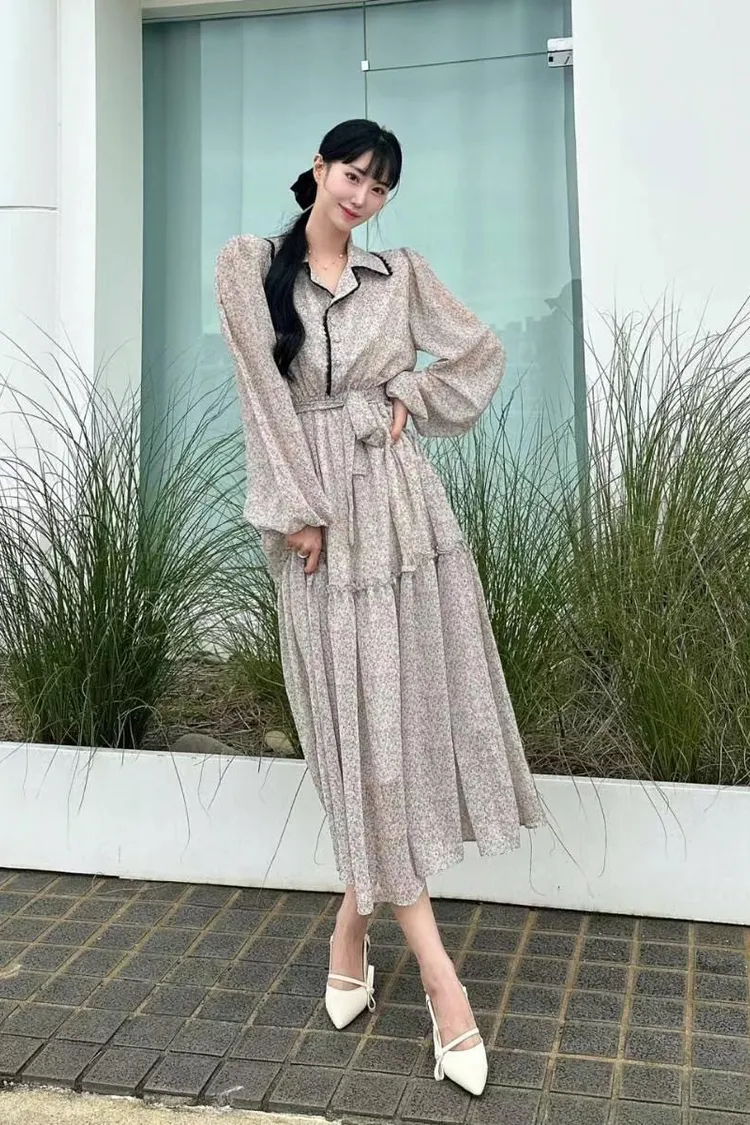 CS491精緻美領蕾絲滾邊碎花洋裝 米 紫 線上價$1790 官網價$1820