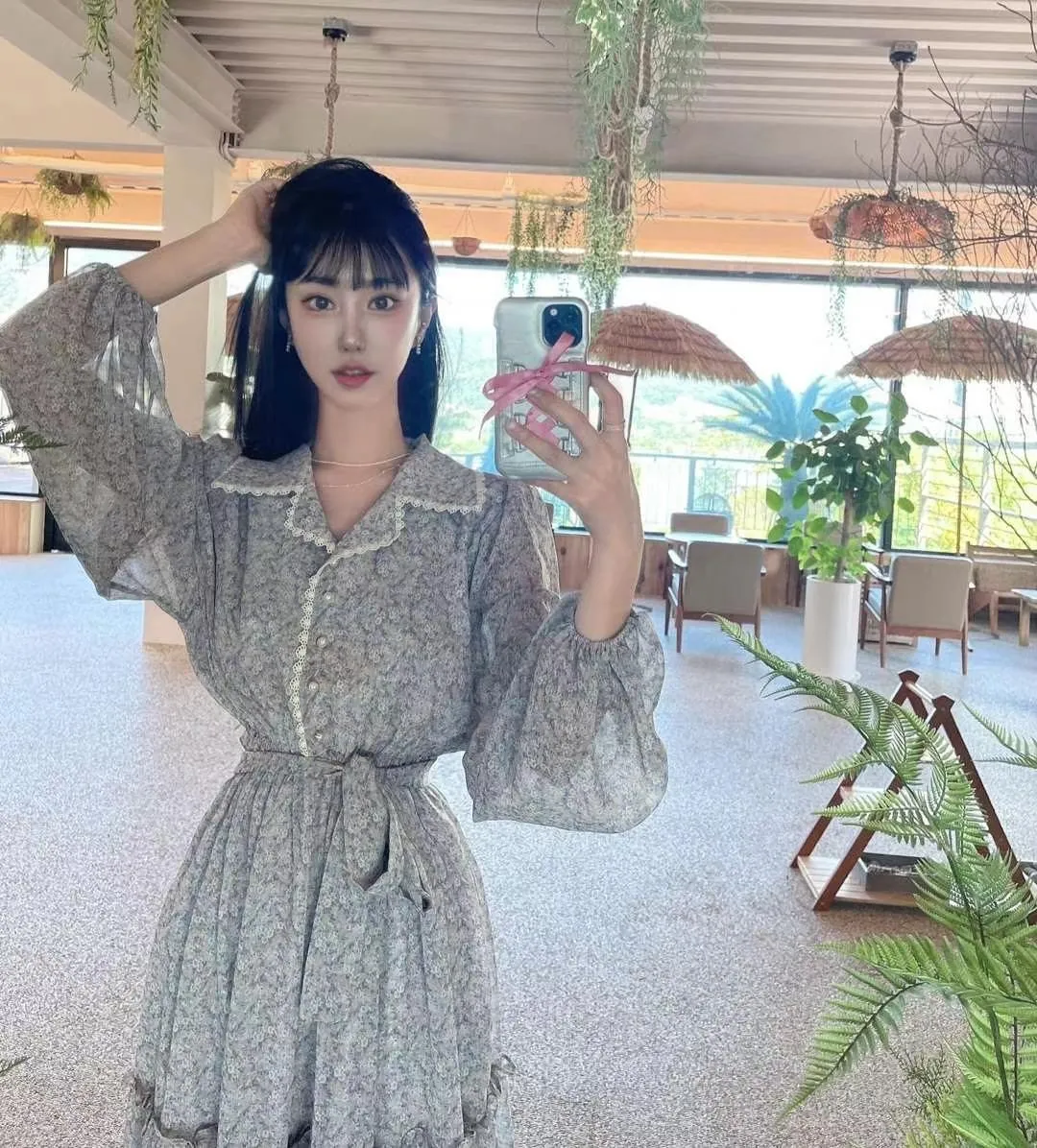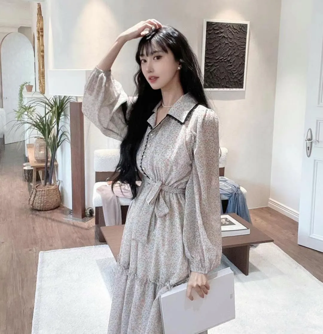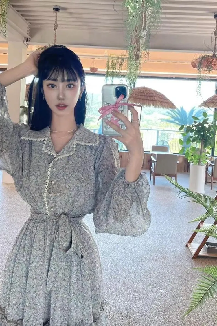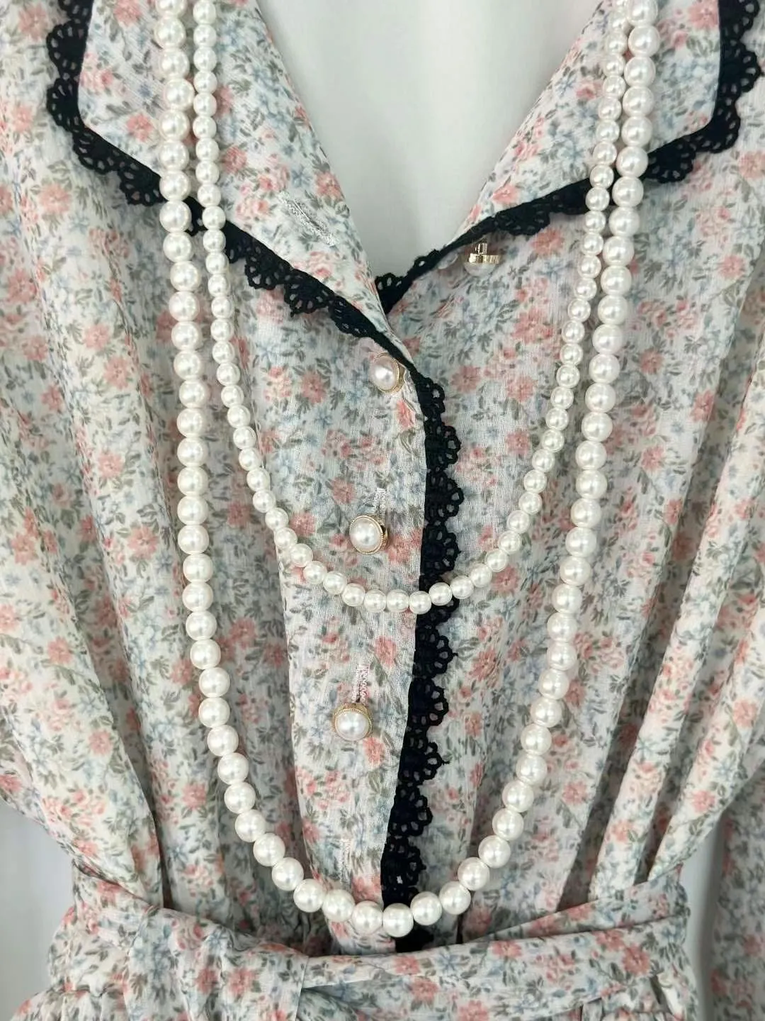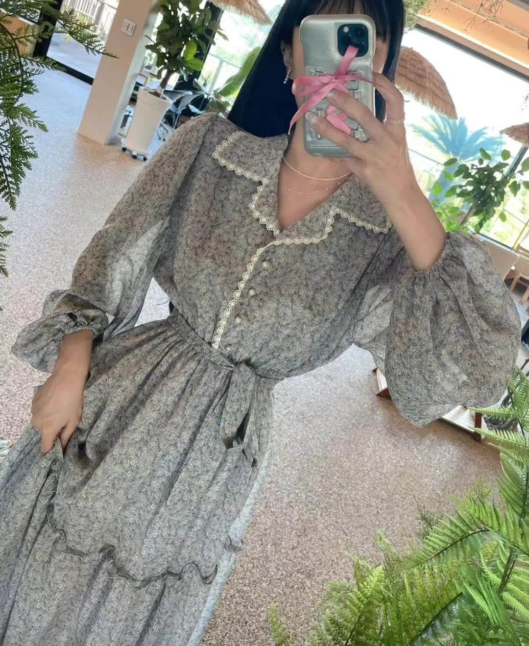 CS491精緻美領蕾絲滾邊碎花洋裝 米 紫 線上價$1790 官網價$1820
