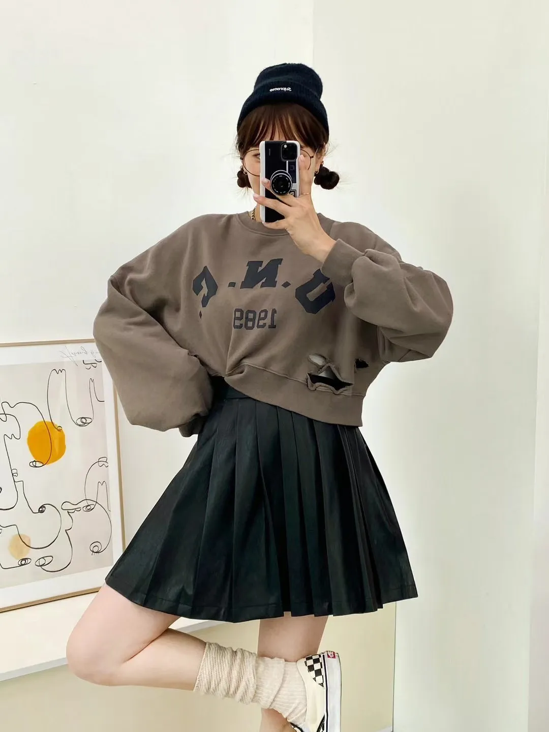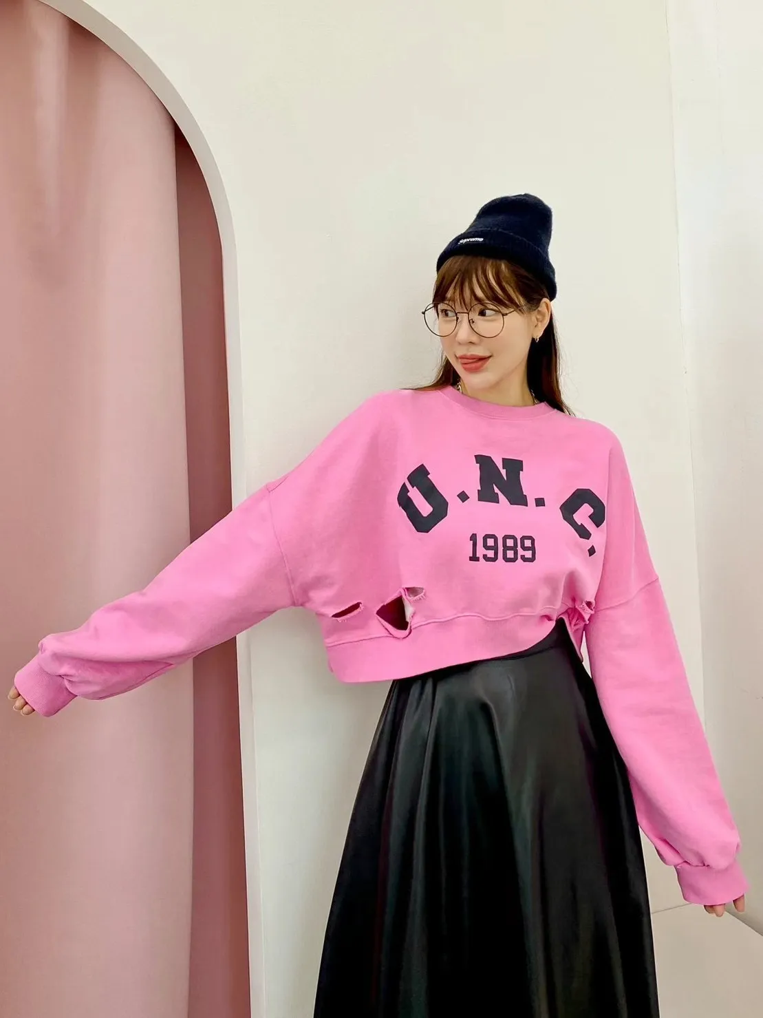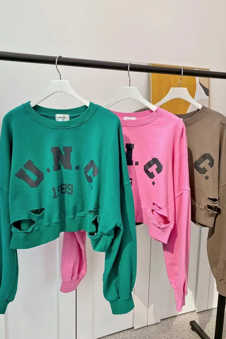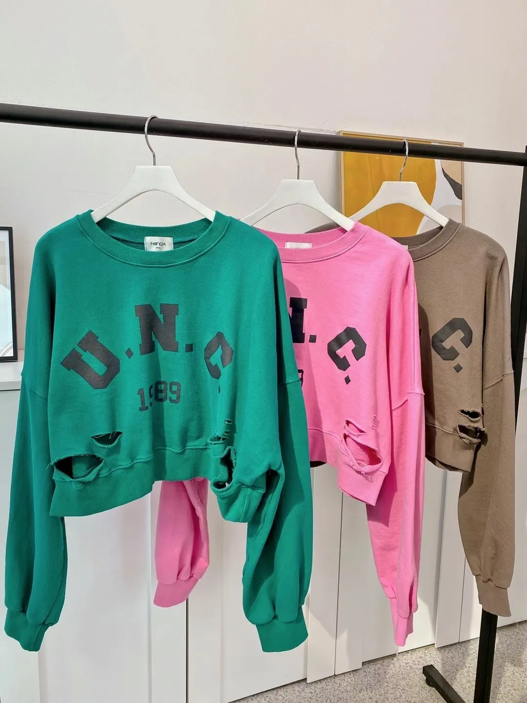 棉 落肩款 短版好比例 抓破藝術設計 下擺袖口鬆緊