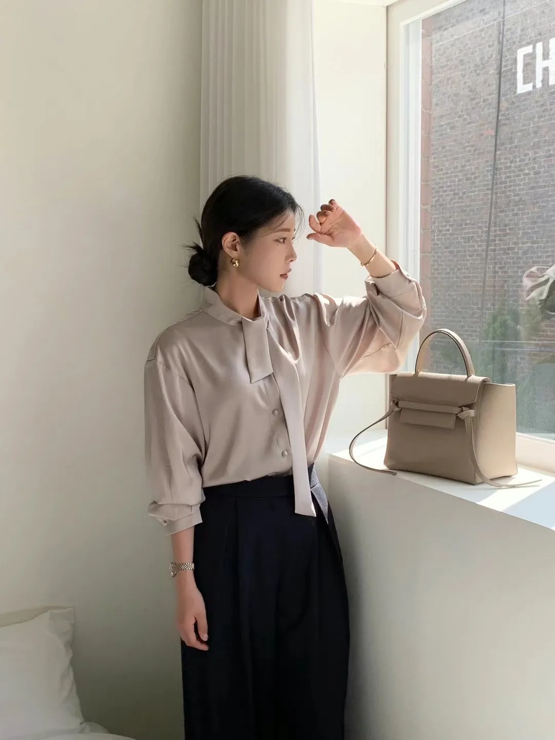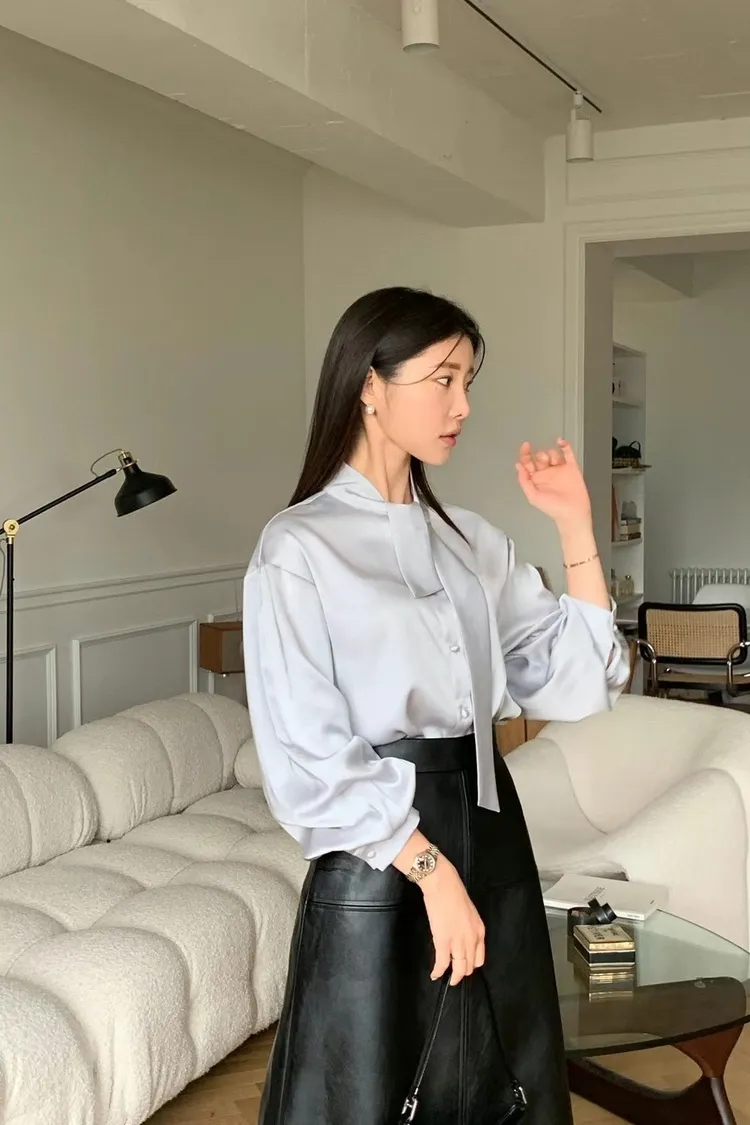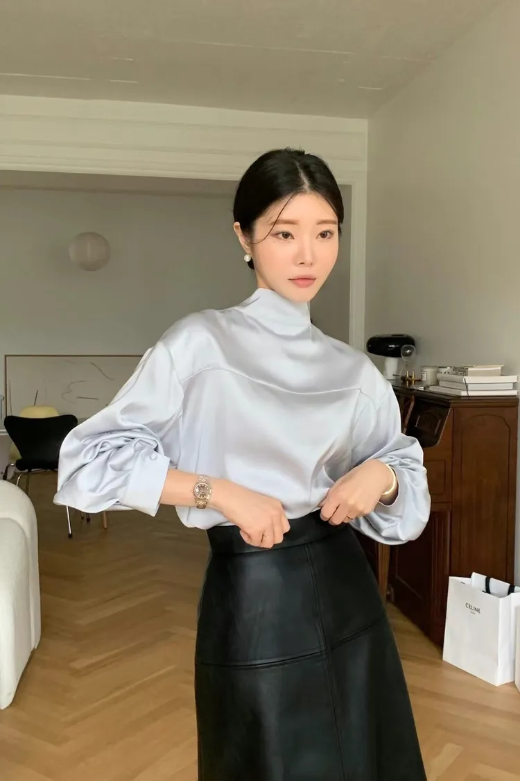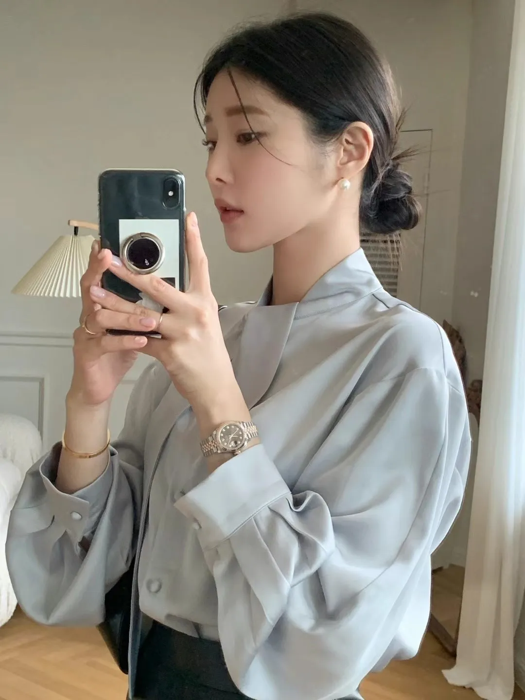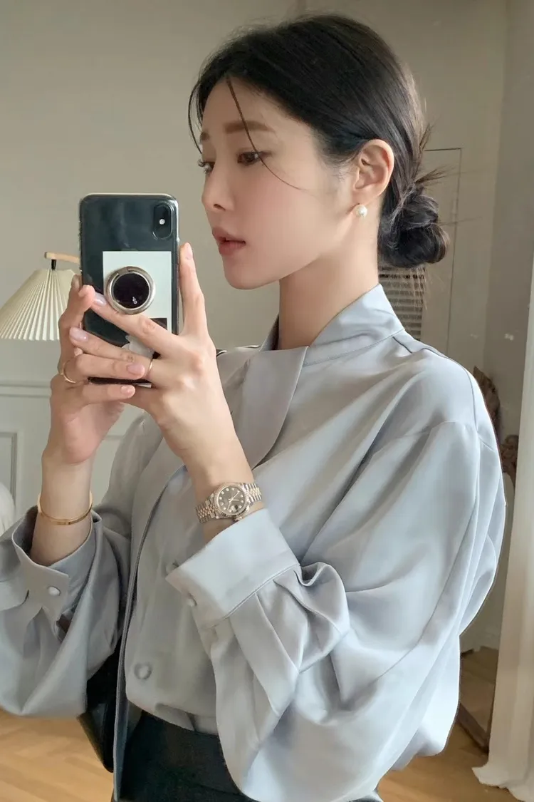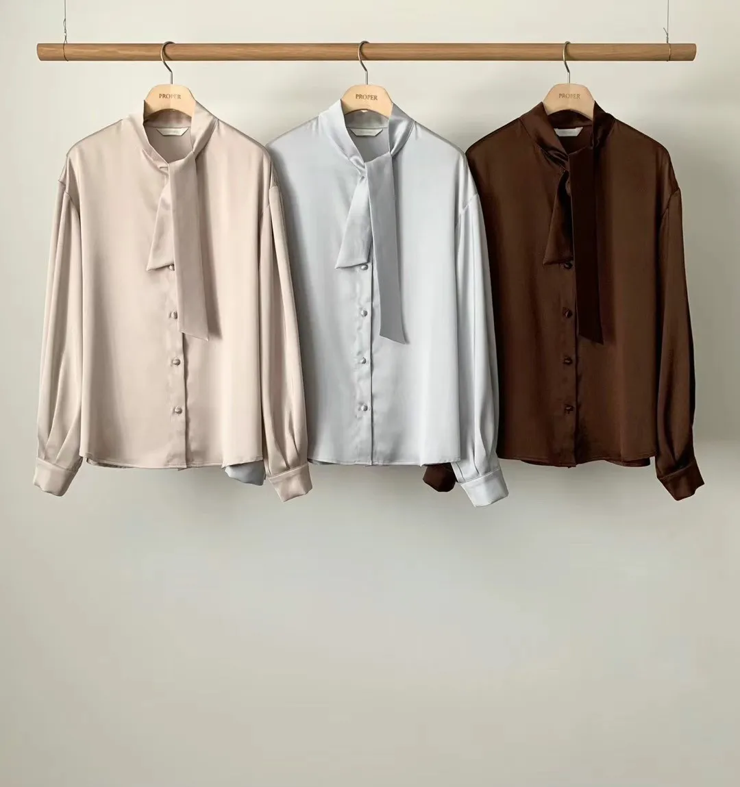 聚酯 冰涼絲滑 光澤緞面 滑順親膚 胸寬友善 入秋厚度 布包釦 袖口有釦