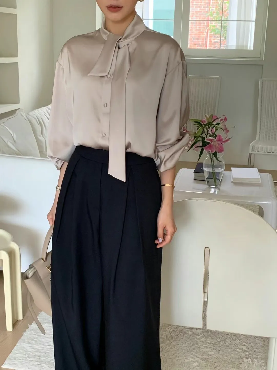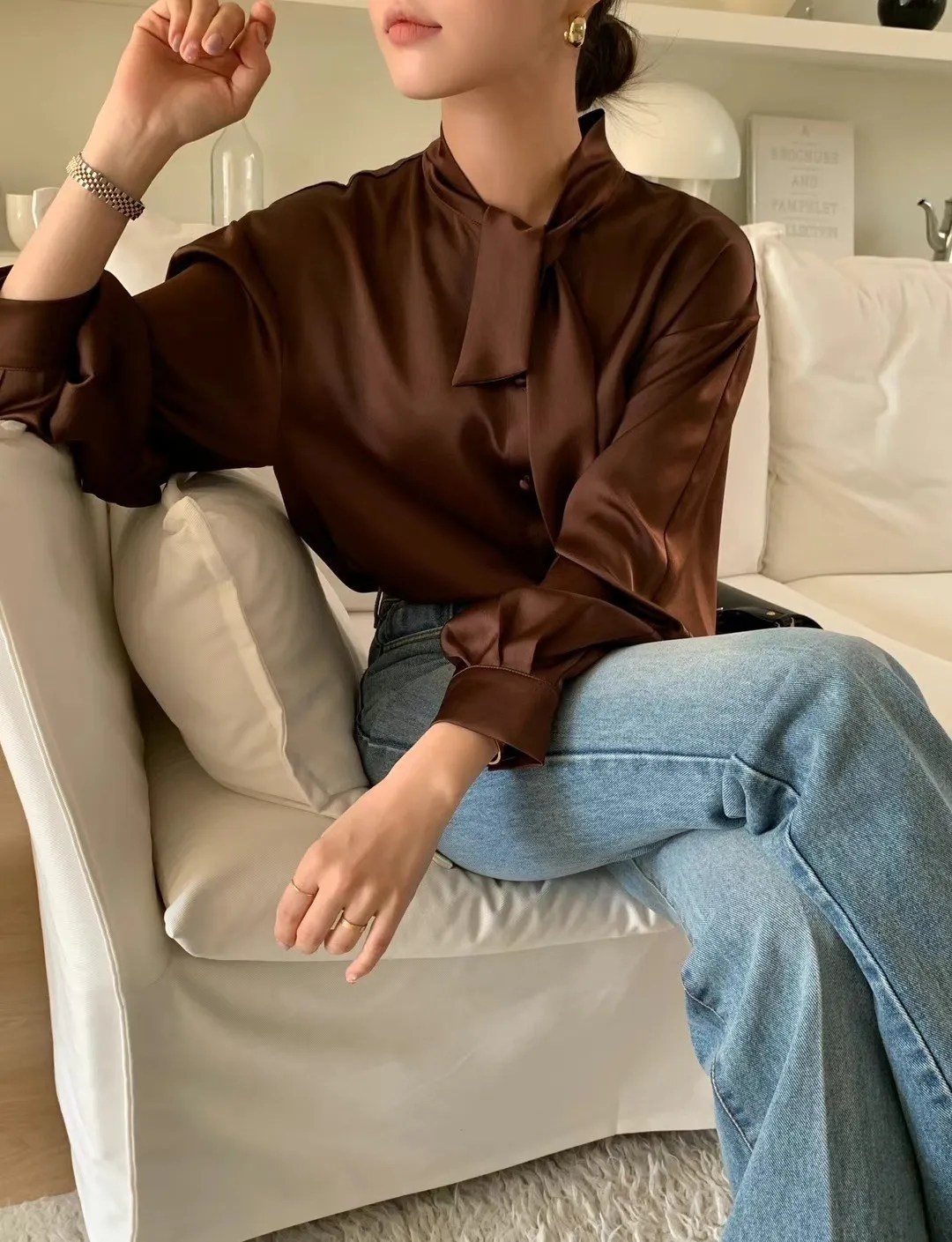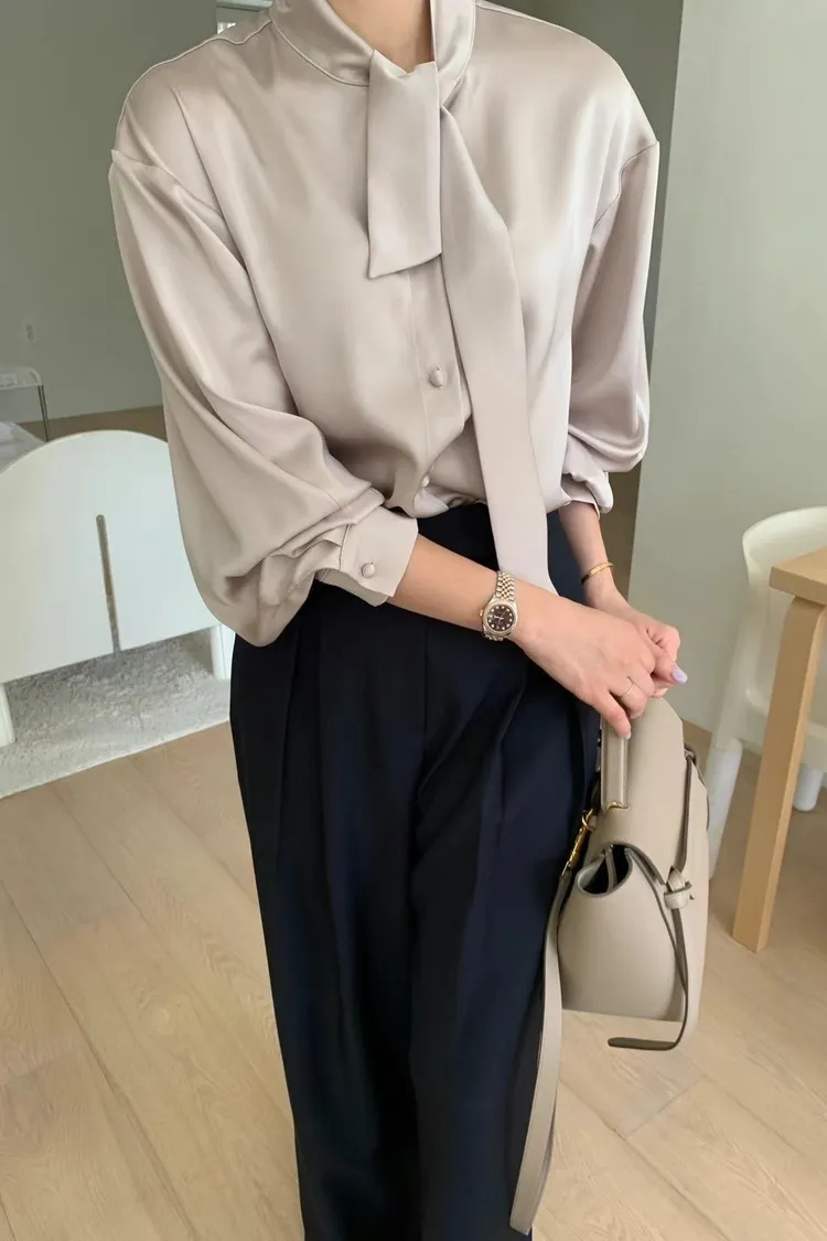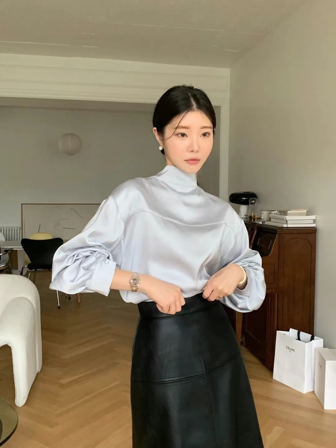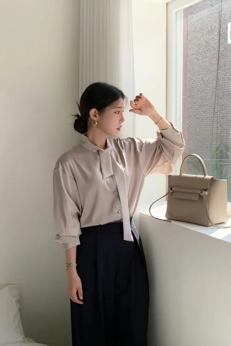 聚酯 冰涼絲滑 光澤緞面 滑順親膚 胸寬友善 入秋厚度 布包釦 袖口有釦
