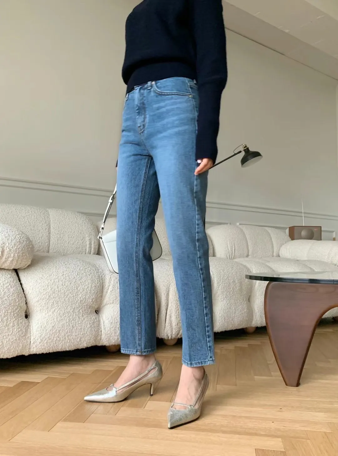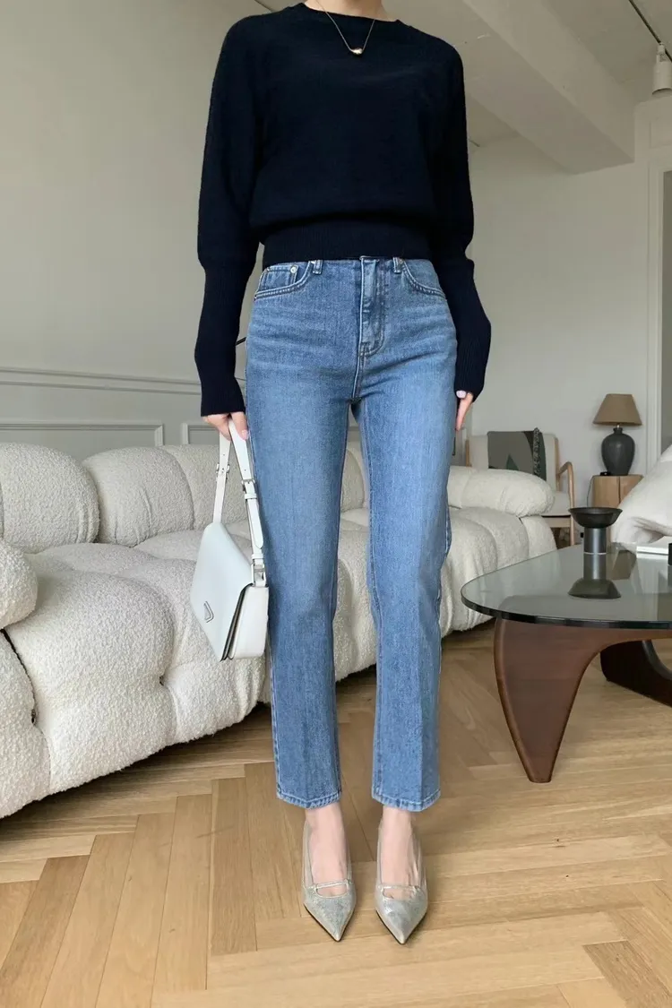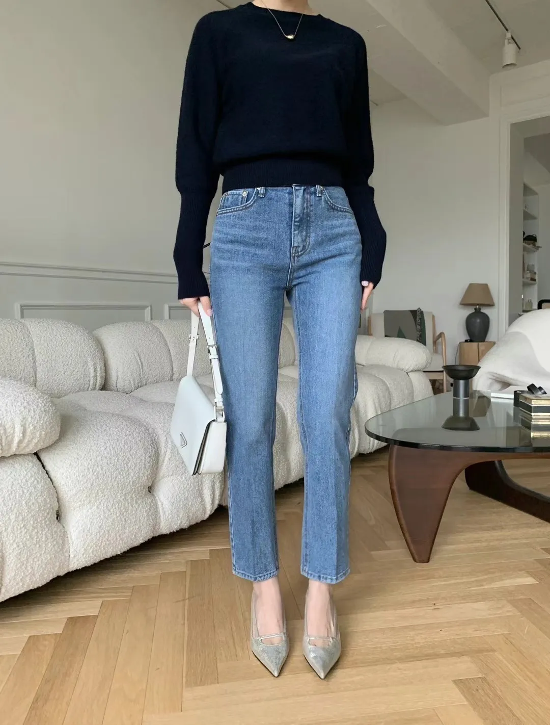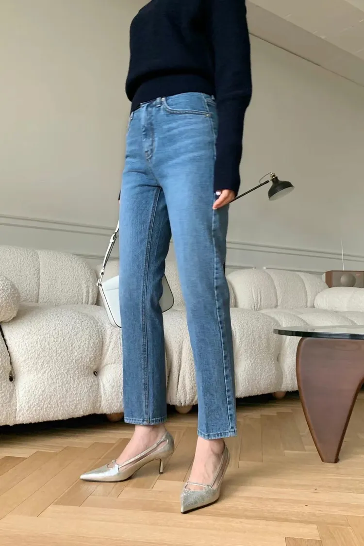 CS579直腿皮革標小個牛仔長褲 白 藍 S M 線上價$1190 官網價$1220