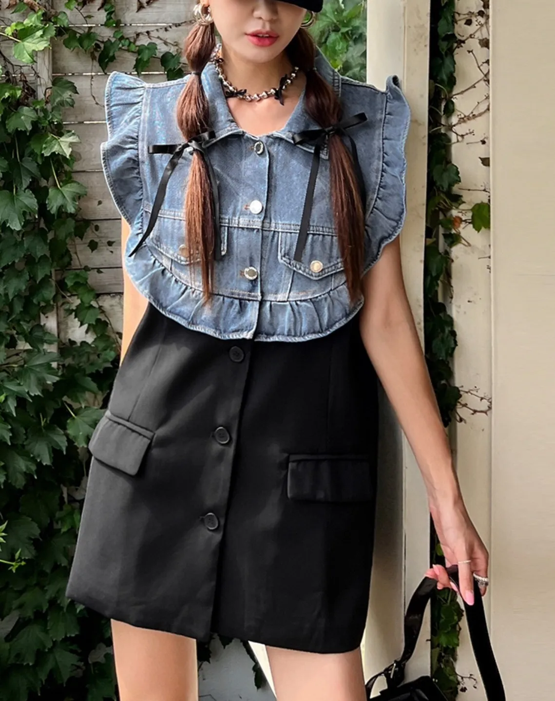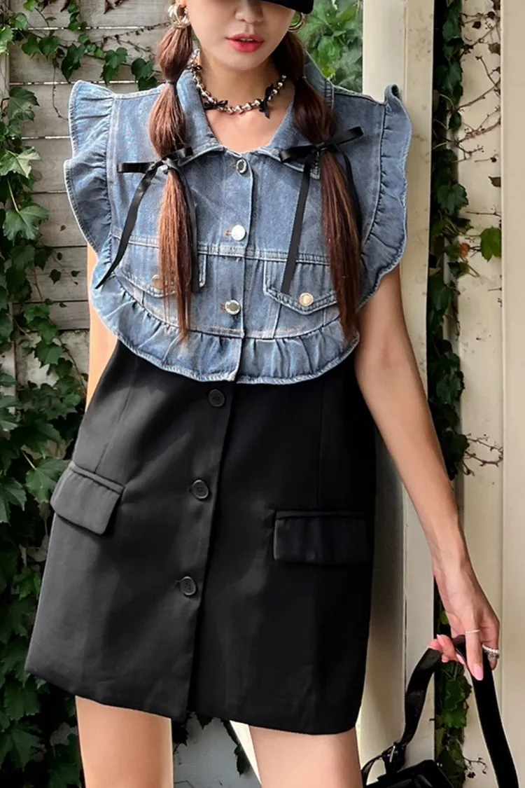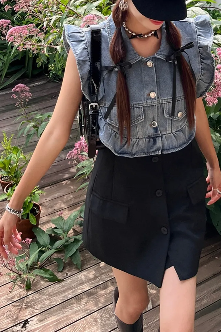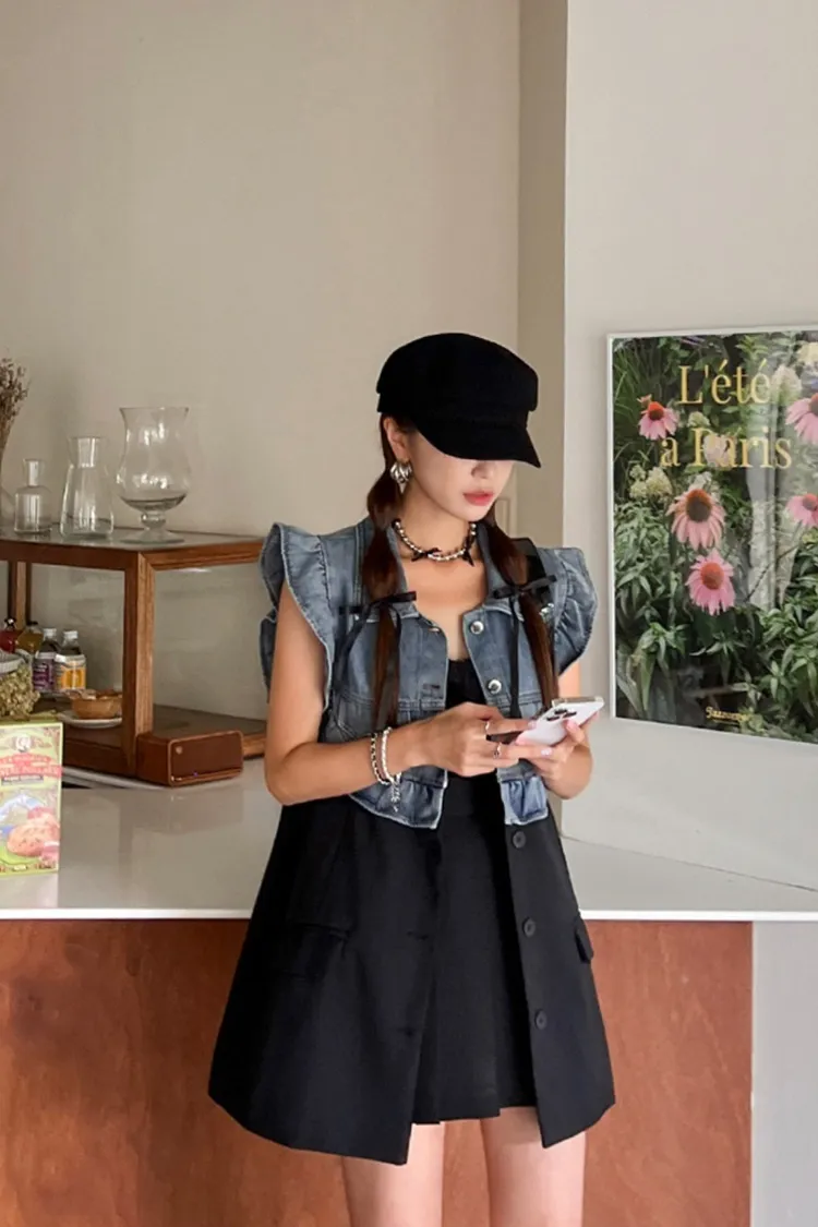 CS695推薦款薄款荷葉滾邊牛仔拚接背心式外套 線上價$950 官網價$980